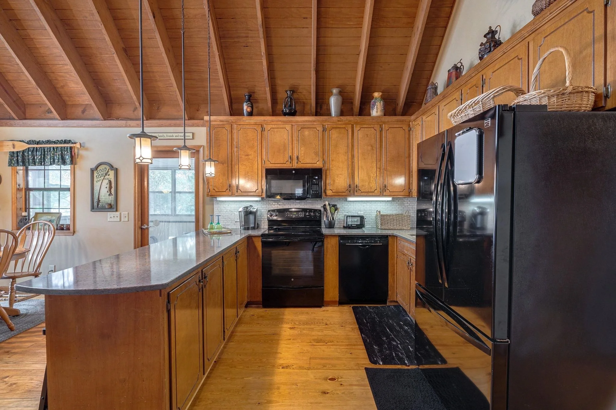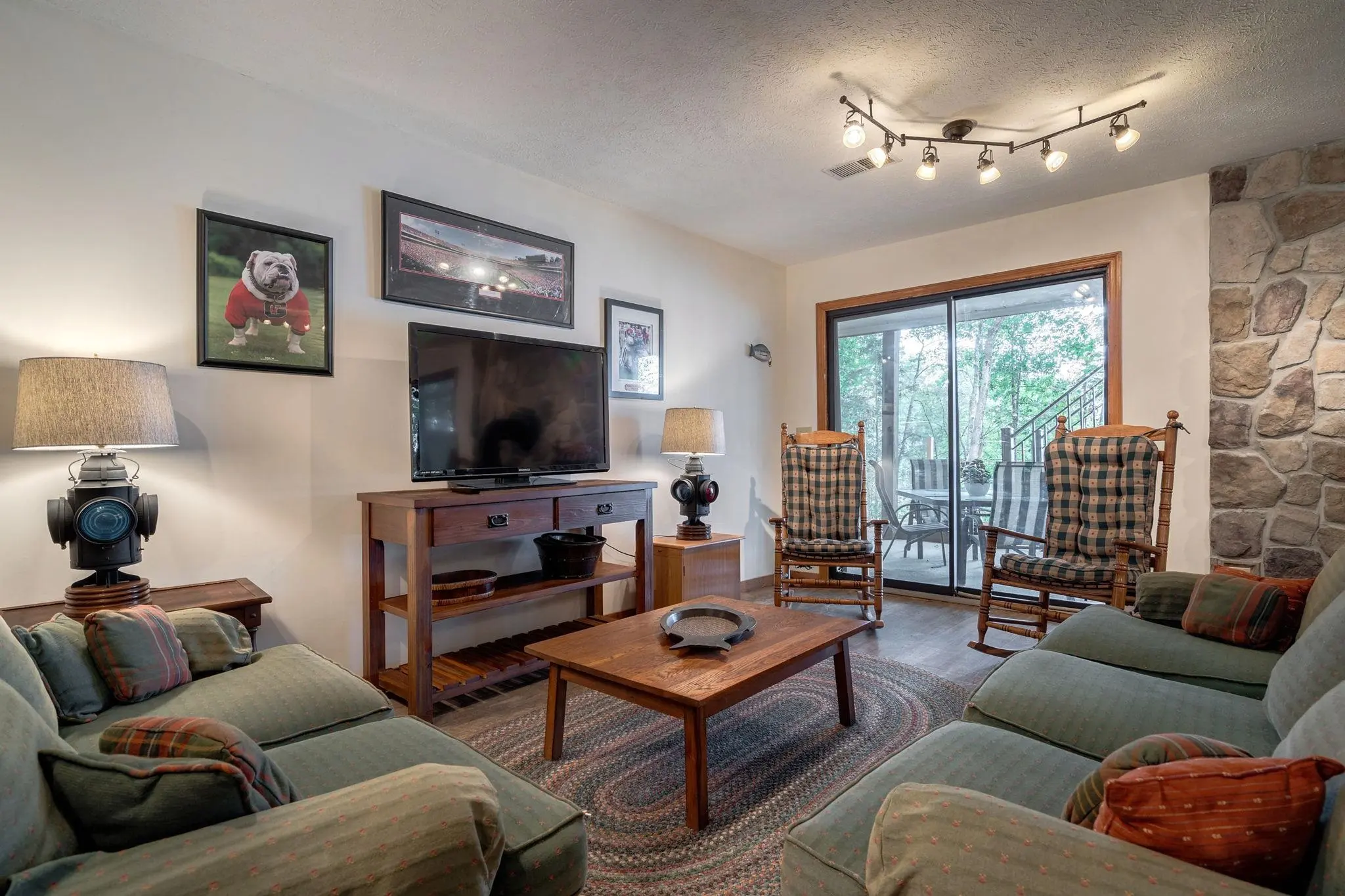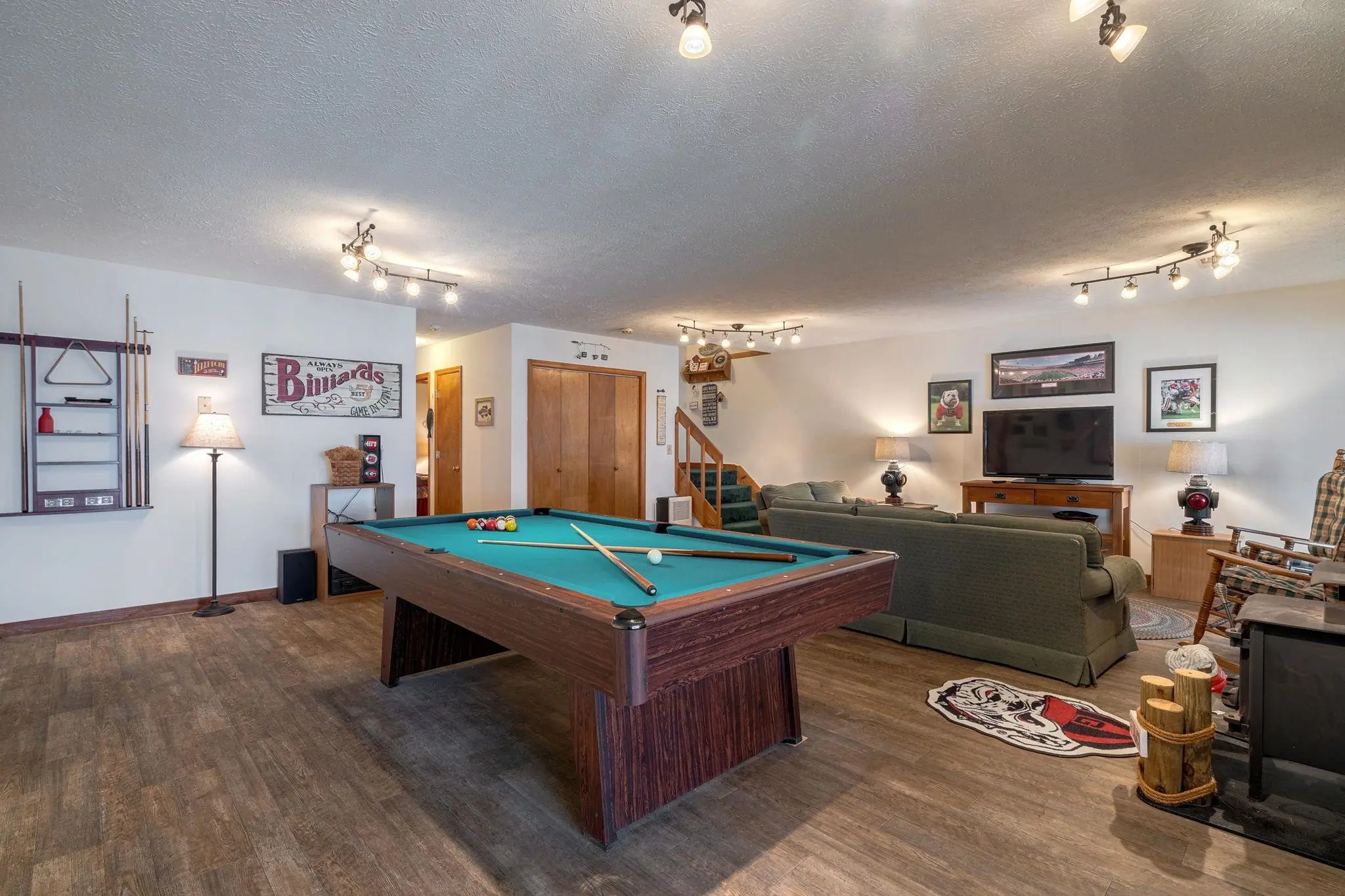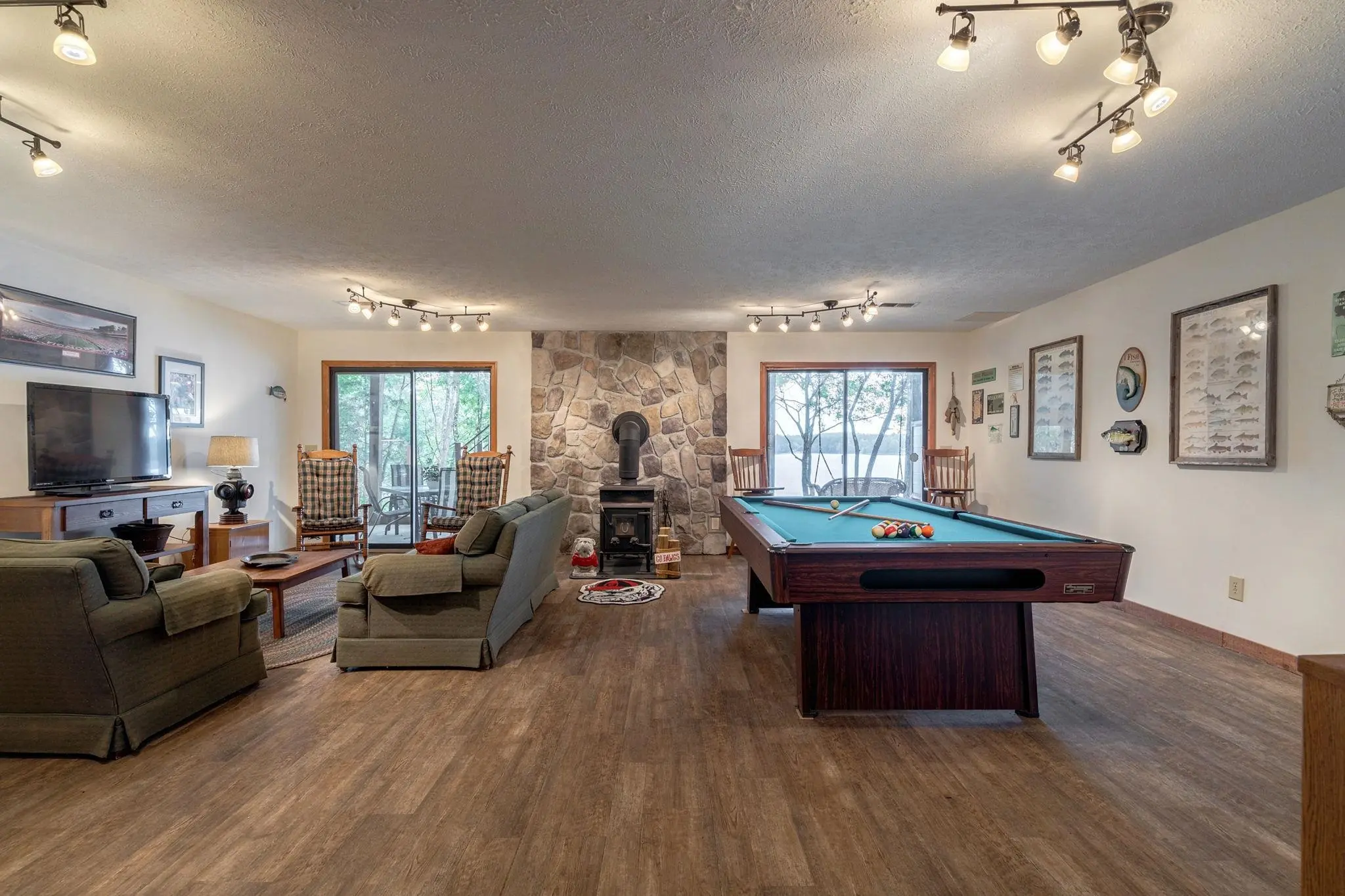 Family-friendly home on beautiful Lake Oconee. This home highlights spaciousness with 4 bedrooms, 3 baths, & additional rooms including a guest/office room, sunroom, plus 2 large great rooms both with scenic lake views. New carpet in master and main level bedrooms!! The terrace level also has a pool table which will remain with home. There is a storage room for your lake toys making this home well-suited for a family that loves to spend time on the water. The open kitchen with quartz countertops & breakfast bar adds to the home's charm providing a functional & stylish interior. Outside, upper level has a roomy lakeside deck, & terrace level has a covered patio and an outdoor shower. A lighted walkway leads to your tiki bar & max dock with boat lift. Home is located just a short boat ride to Sugar Creek Marina for all your lake needs. AND, don't forget to try their breakfast biscuits!!