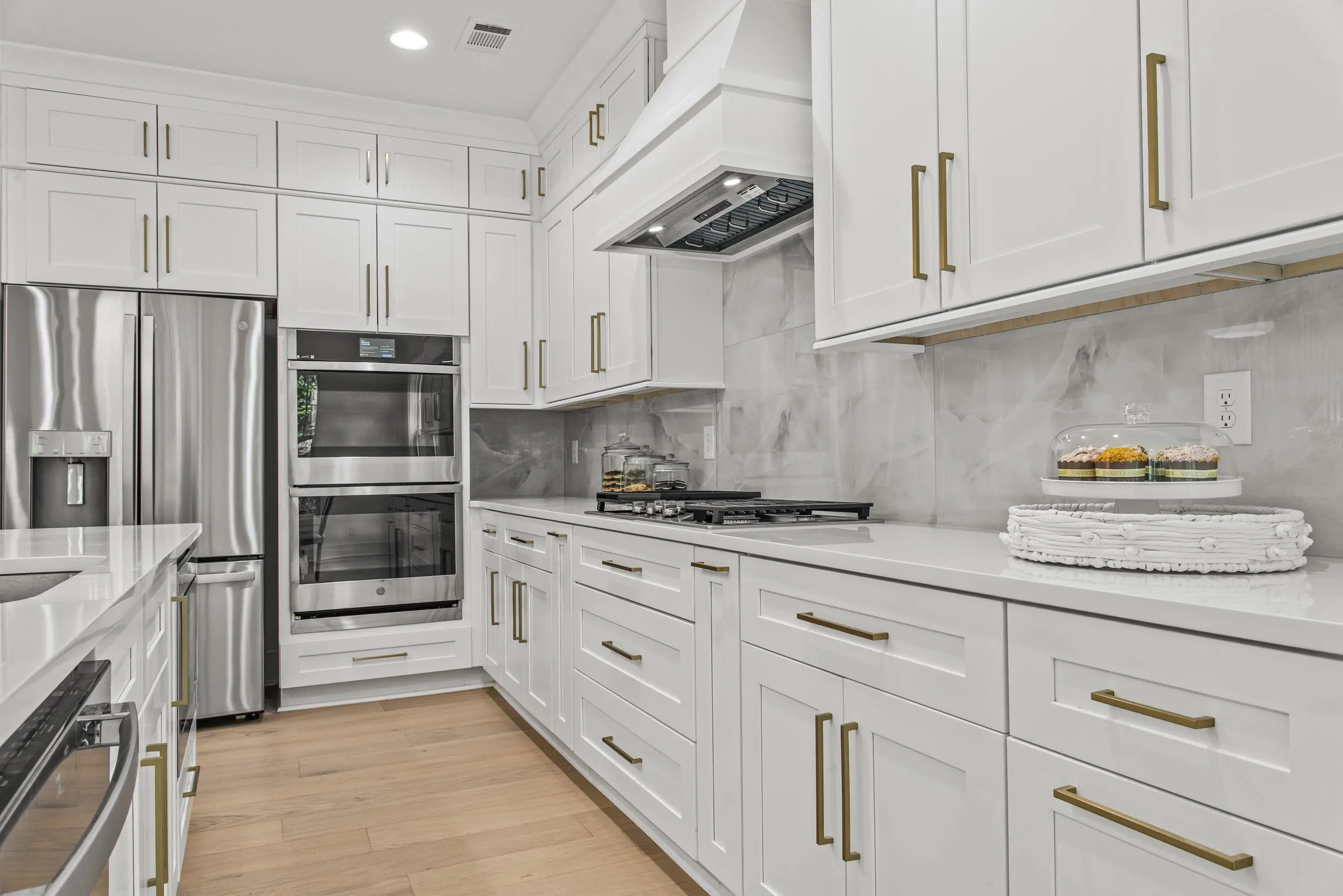 - AppliancesBuilt in Microwave, Double Ovens, Range, Refrigerator, Vent Hood, Wall Oven, StainlessSteel Appliances