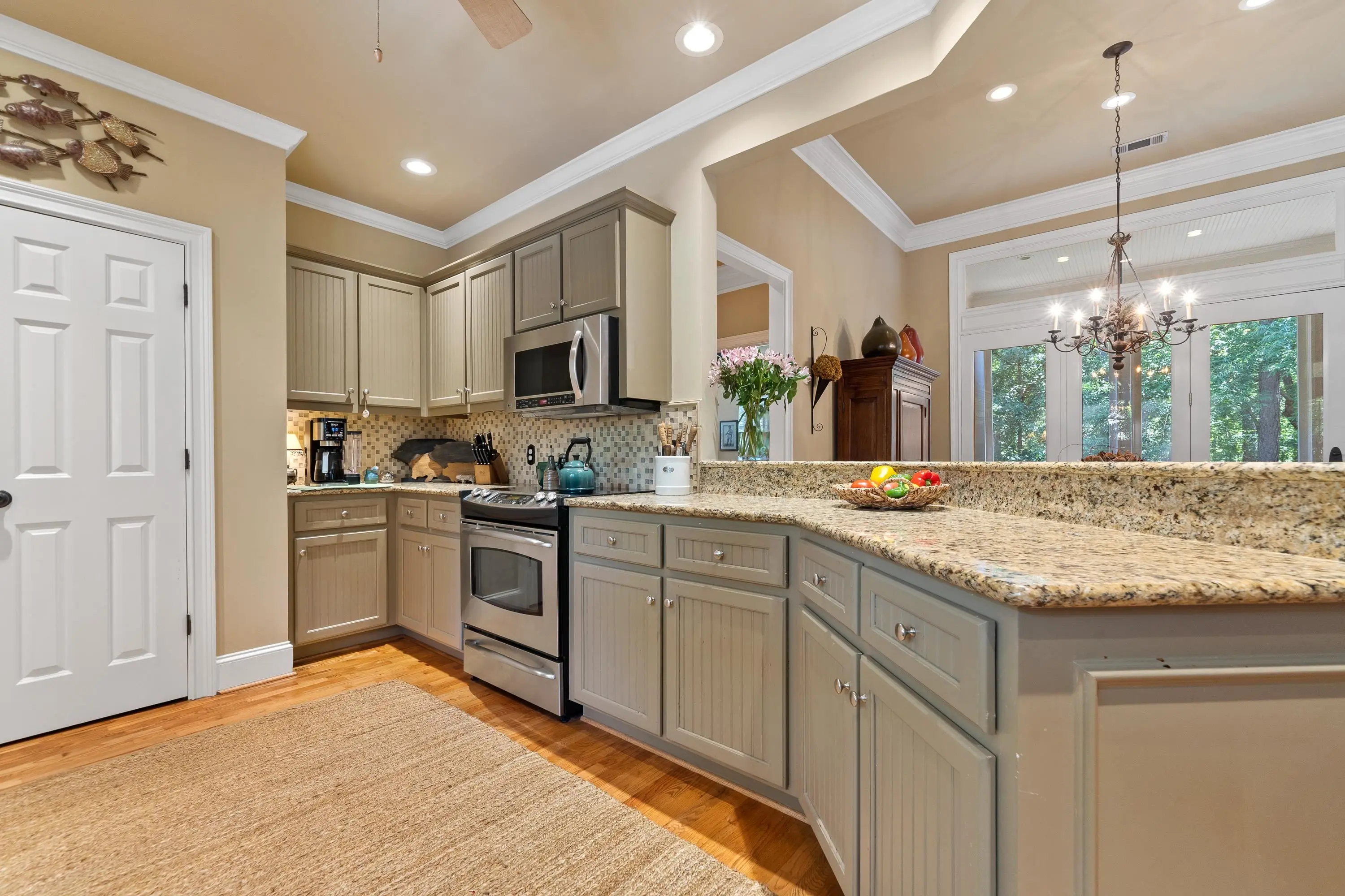 - AppliancesBuilt in Microwave, Double Ovens, Garbage Disposal, Range, Refrigerator, StainlessSteel Appliances