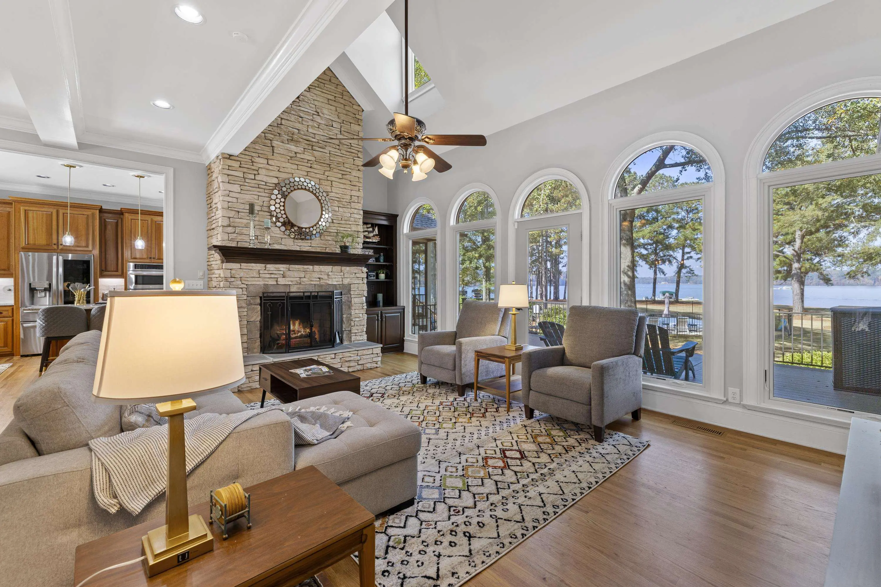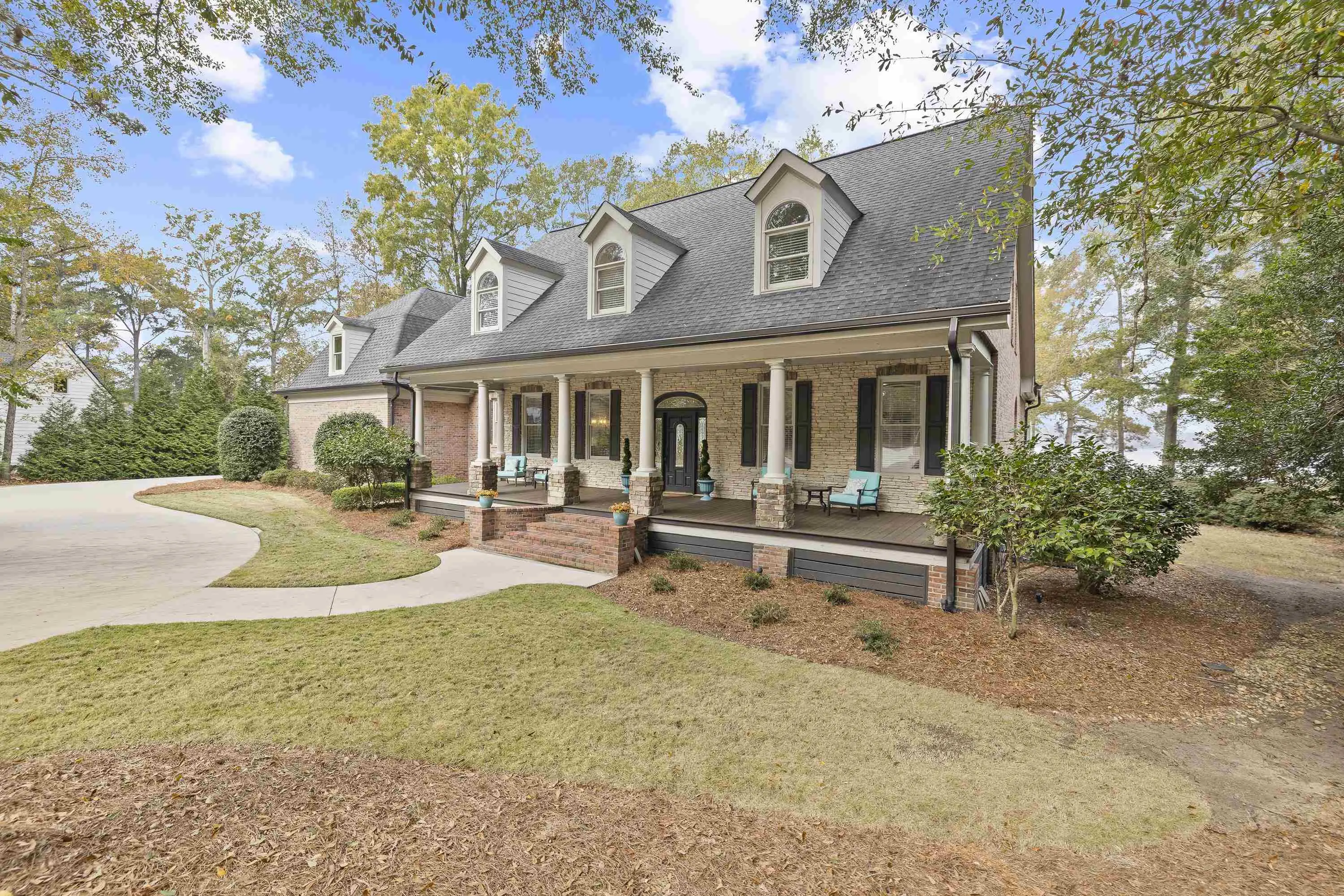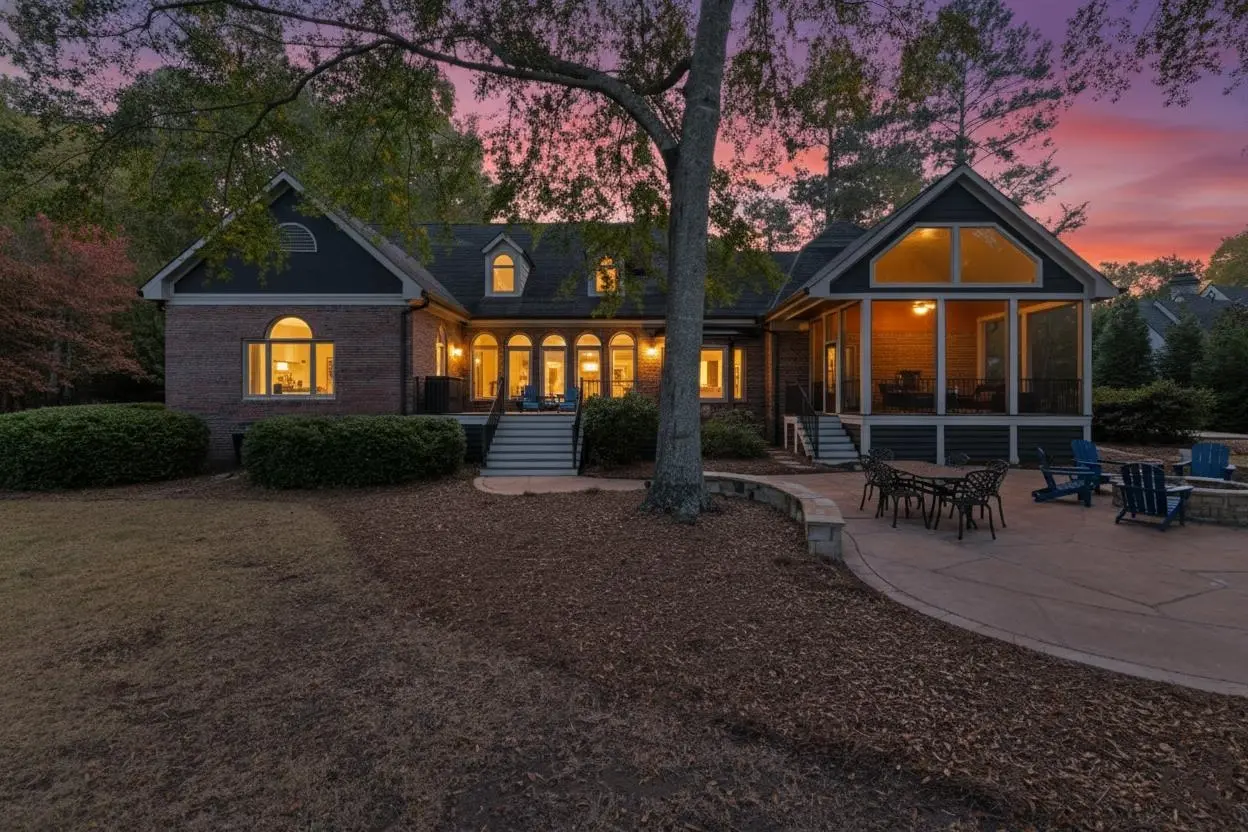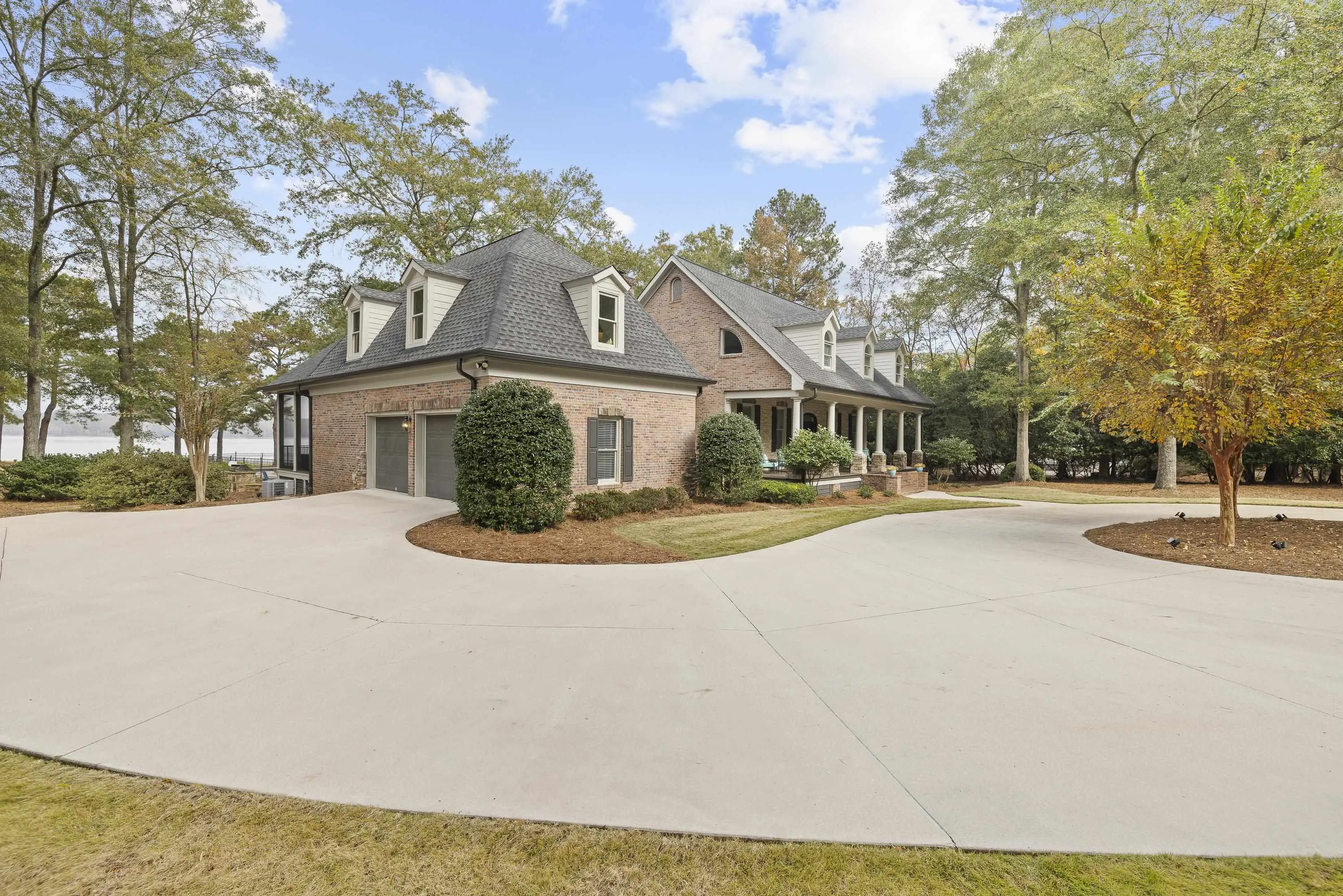 Welcome to 154 Bradford Drive, located within the sought-after Sebastian Cove community on Lake Oconee. Inspired by William Poole’s “Berry Hill” design, this elegant four-sided brick home offers nearly 4,000 sqft of living space on a prime, level lot boasting approximately 300 ft of shoreline and sweeping 180-degree main-water views. The main-level owner’s suite serves as a private retreat, featuring a beautifully renovated en-suite bath and large windows framing panoramic water views. Showcasing wall-to-wall windows and a striking stacked-stone fireplace, the main living are is filling with natural light and warmth. A spacious office with custom built-ins provides an ideal space for work or study. The kitchen offers generous solid-surface countertops, stainless steel appliances, and abundant cabinetry, seamlessly connecting to the home’s gathering areas for effortless entertaining. Upstairs, three additional bedrooms, two full baths, and a versatile flex space provide comfort and flexibility for family or guests. A newly constructed detached three-car garage enhances the property, offering over 400 sqft of finished living space above and an oversized bay designed for boat or camper storage. Whether relaxing on the screened porch, enjoying the saltwater pool, gathering around the firepit, or spending time on the private beach and dock, this property invites you to experience the very best of Lake Oconee living. Residents of Sebastian Cove also enjoy community amenities, including pickleball/tennis courts, a clubhouse, private boat ramp/dock and walking trails.