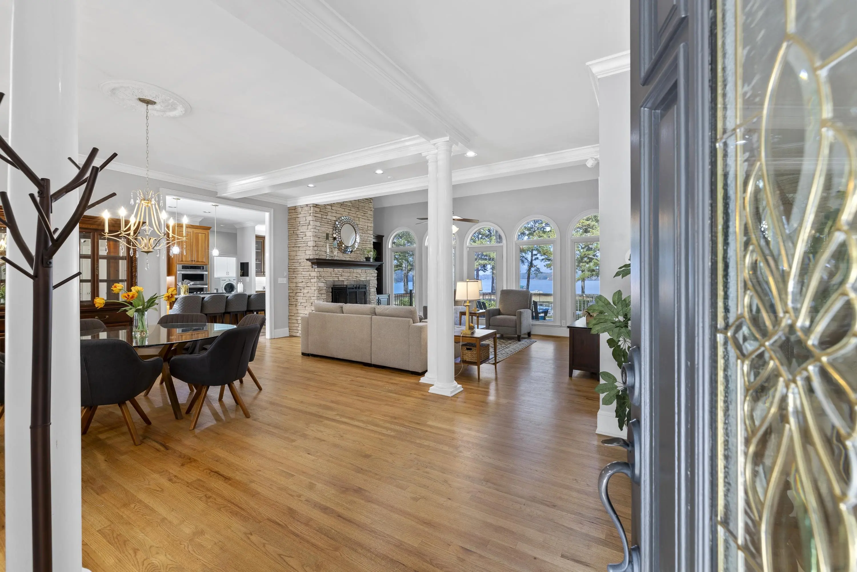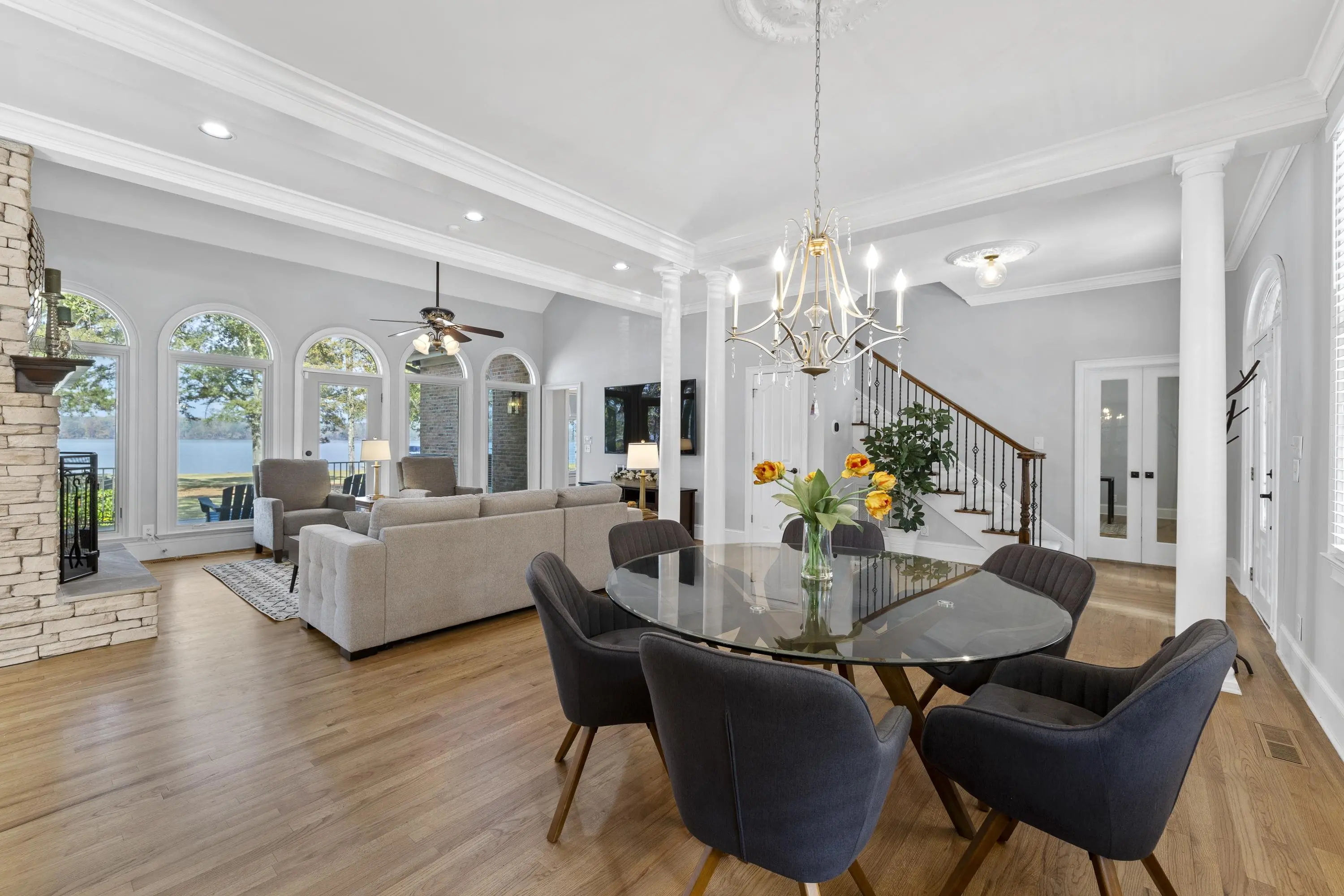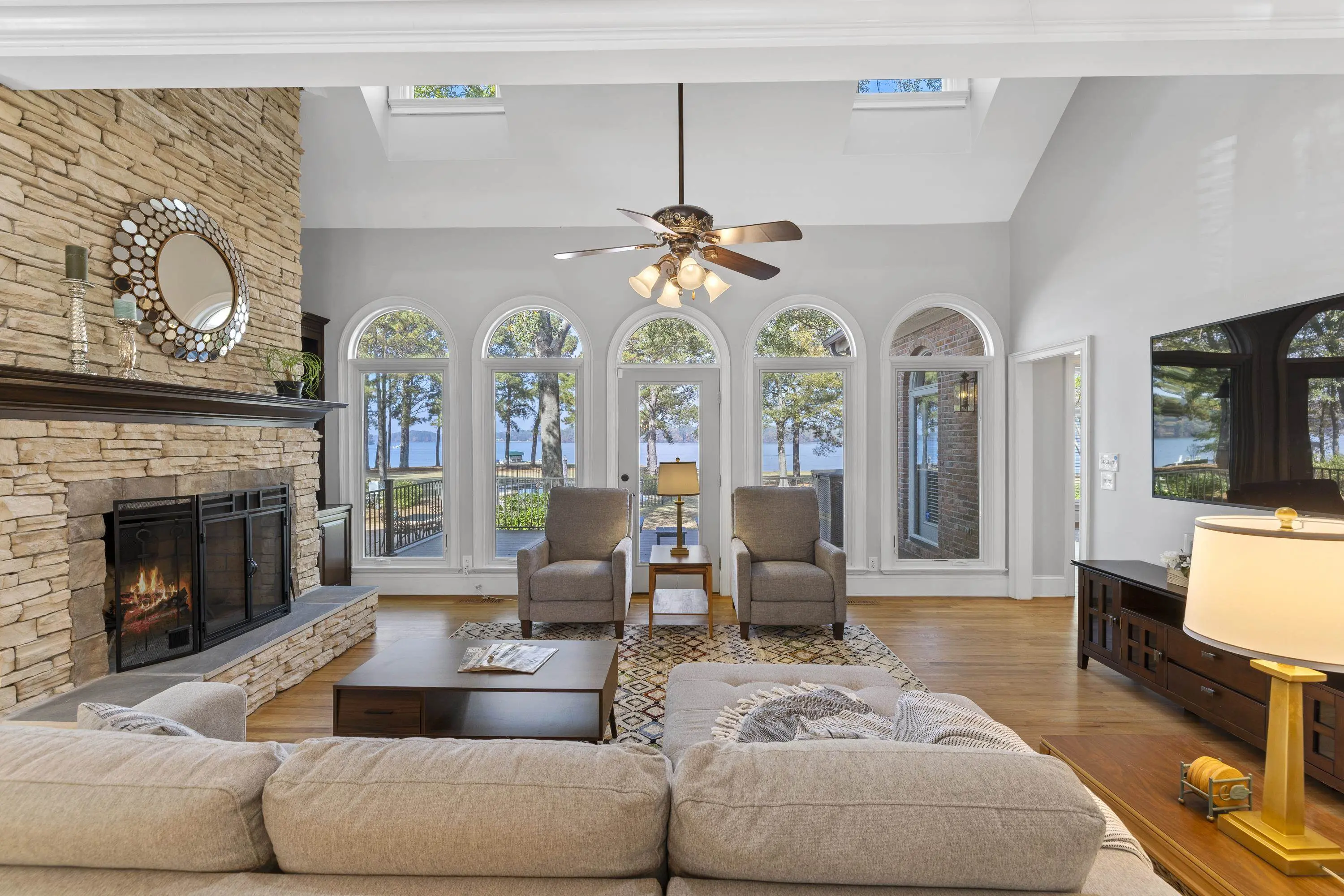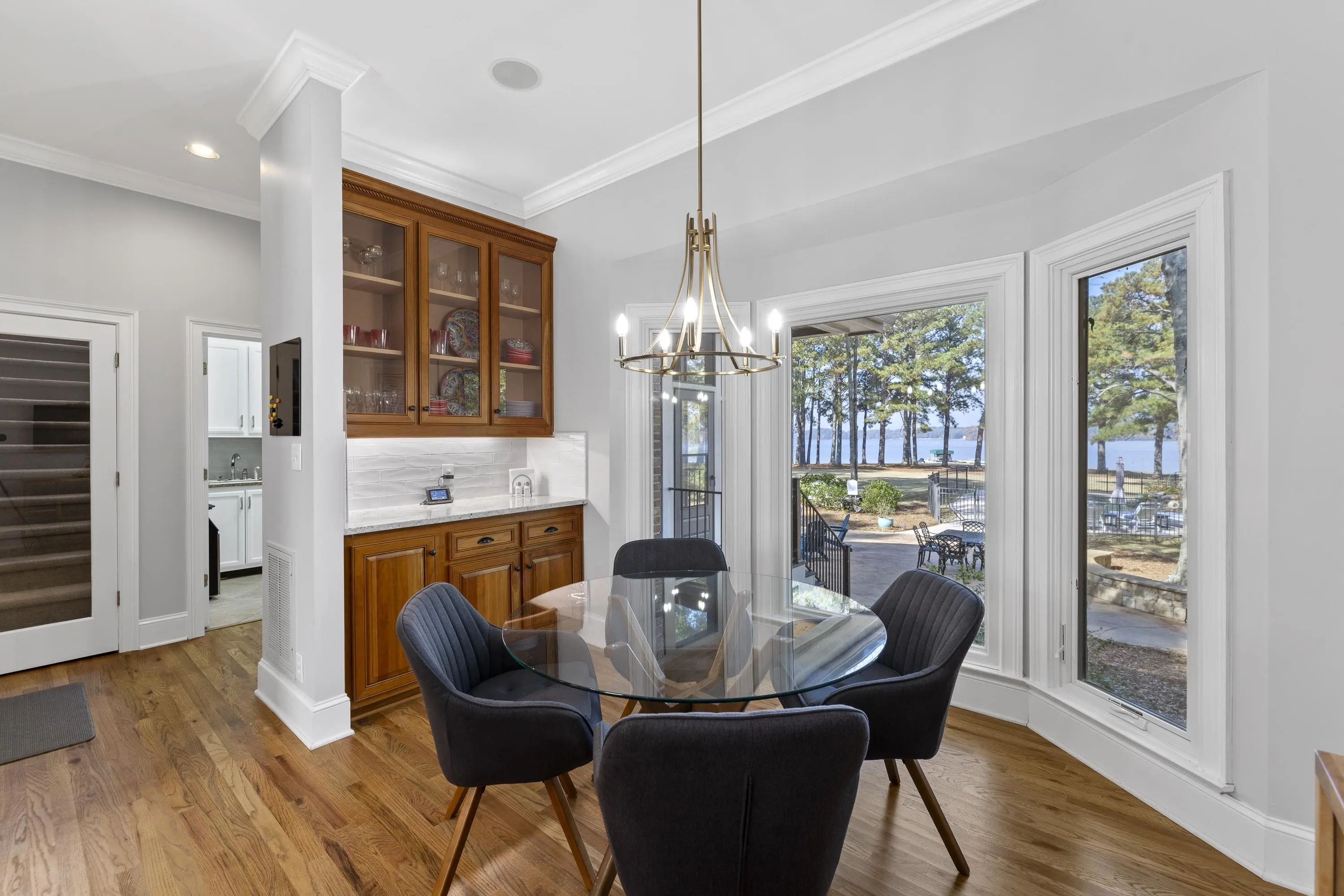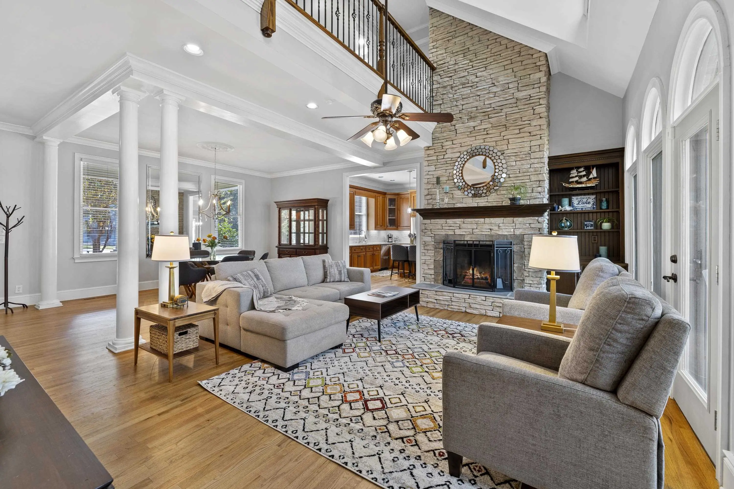 Welcome to 154 Bradford Drive, located within the sought-after Sebastian Cove community on Lake Oconee. Inspired by William Poole’s “Berry Hill” design, this elegant four-sided brick home offers nearly 4,000 sqft of living space on a prime, level lot boasting approximately 300 ft of shoreline and sweeping 180-degree main-water views. The main-level owner’s suite serves as a private retreat, featuring a beautifully renovated en-suite bath and large windows framing panoramic water views. Showcasing wall-to-wall windows and a striking stacked-stone fireplace, the main living are is filling with natural light and warmth. A spacious office with custom built-ins provides an ideal space for work or study. The kitchen offers generous solid-surface countertops, stainless steel appliances, and abundant cabinetry, seamlessly connecting to the home’s gathering areas for effortless entertaining. Upstairs, three additional bedrooms, two full baths, and a versatile flex space provide comfort and flexibility for family or guests. A newly constructed detached three-car garage enhances the property, offering over 400 sqft of finished living space above and an oversized bay designed for boat or camper storage. Whether relaxing on the screened porch, enjoying the saltwater pool, gathering around the firepit, or spending time on the private beach and dock, this property invites you to experience the very best of Lake Oconee living. Residents of Sebastian Cove also enjoy community amenities, including pickleball/tennis courts, a clubhouse, private boat ramp/dock and walking trails.
