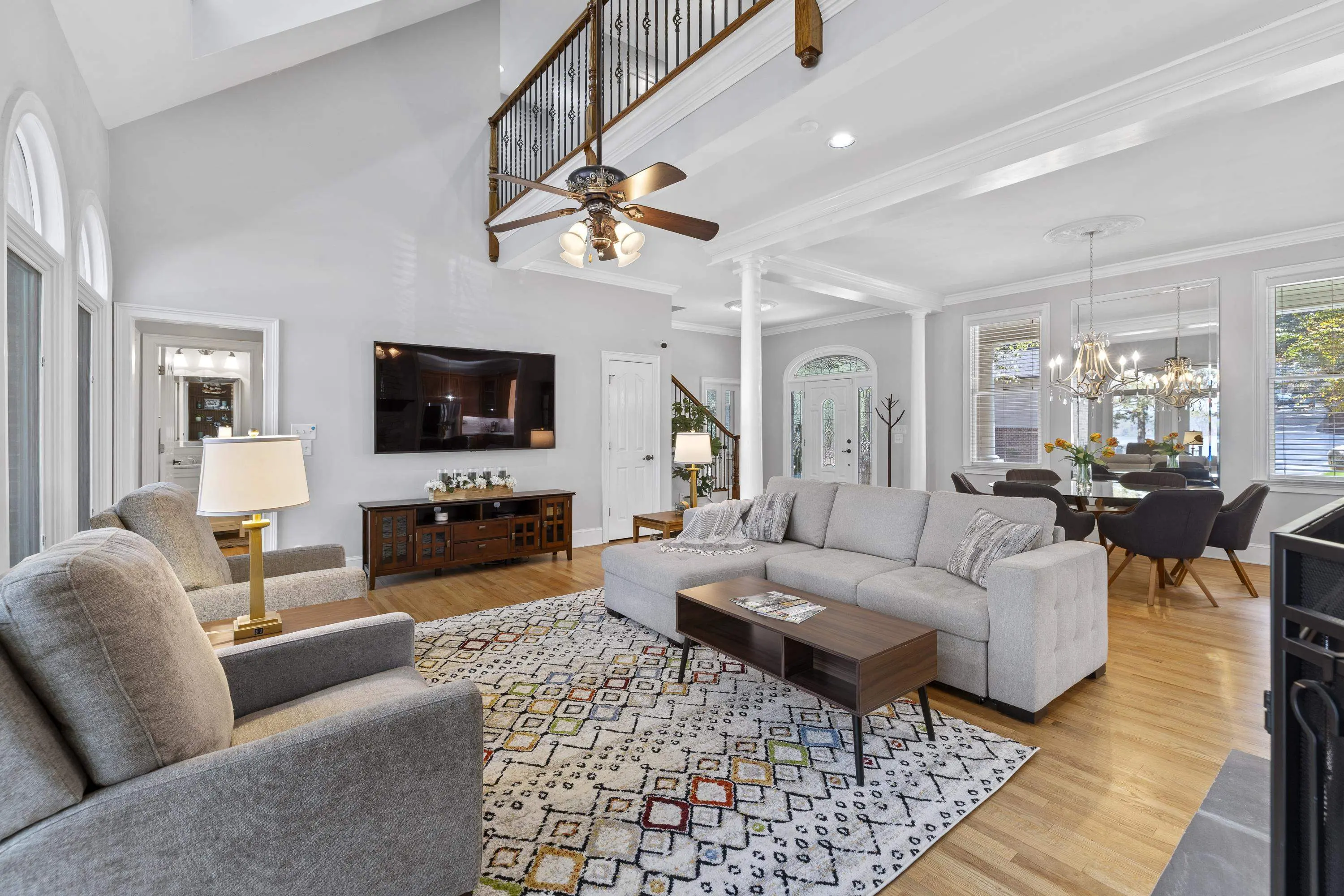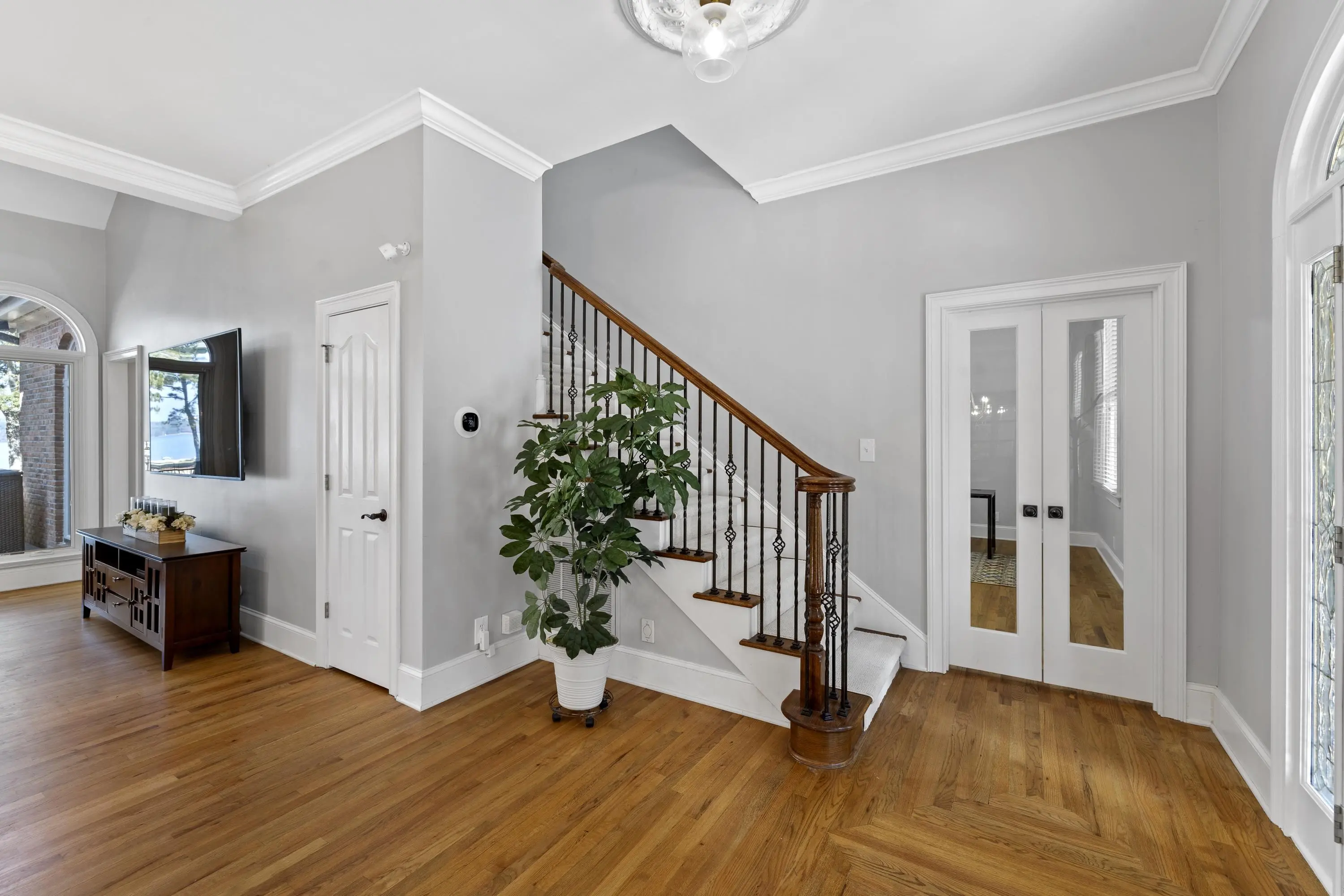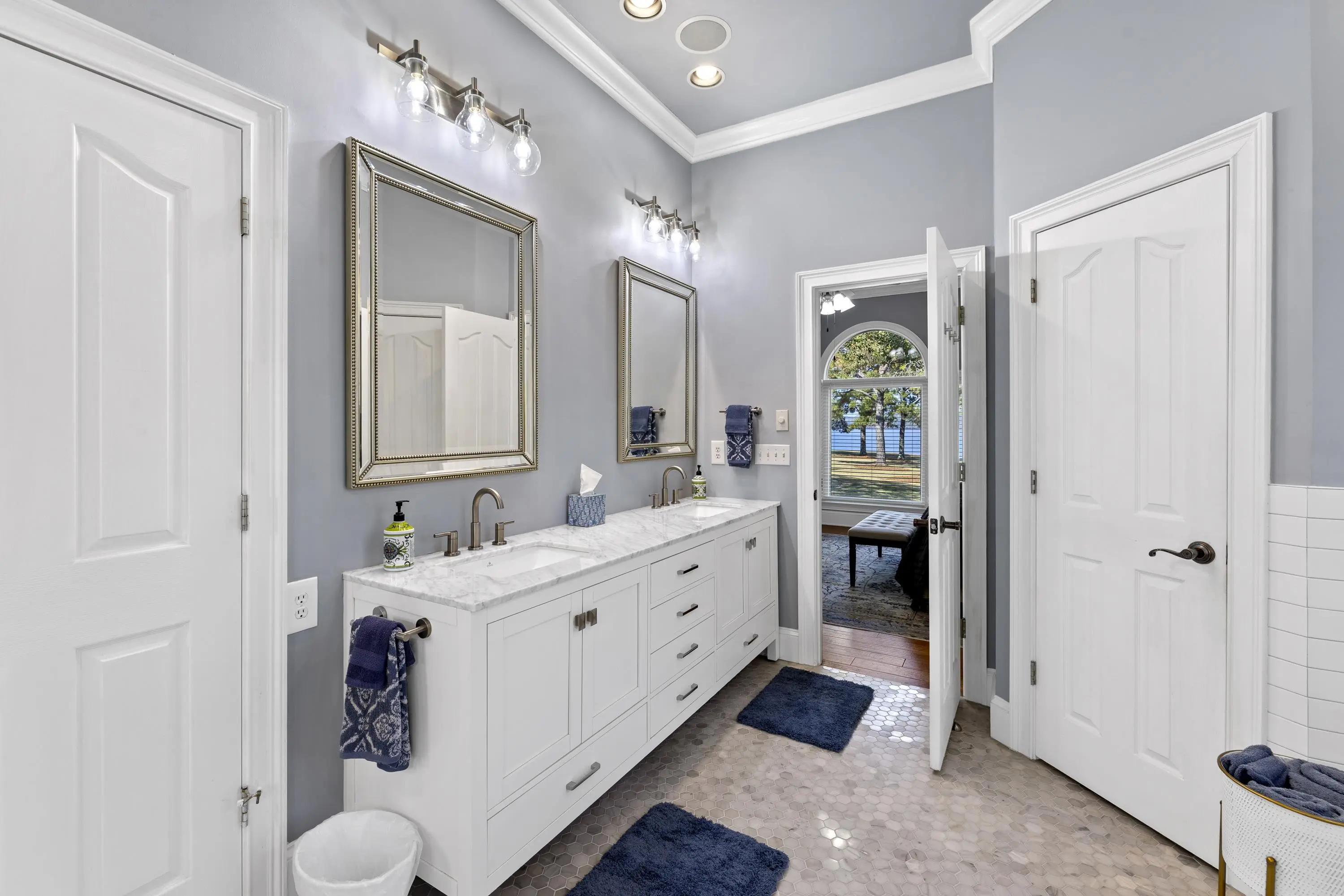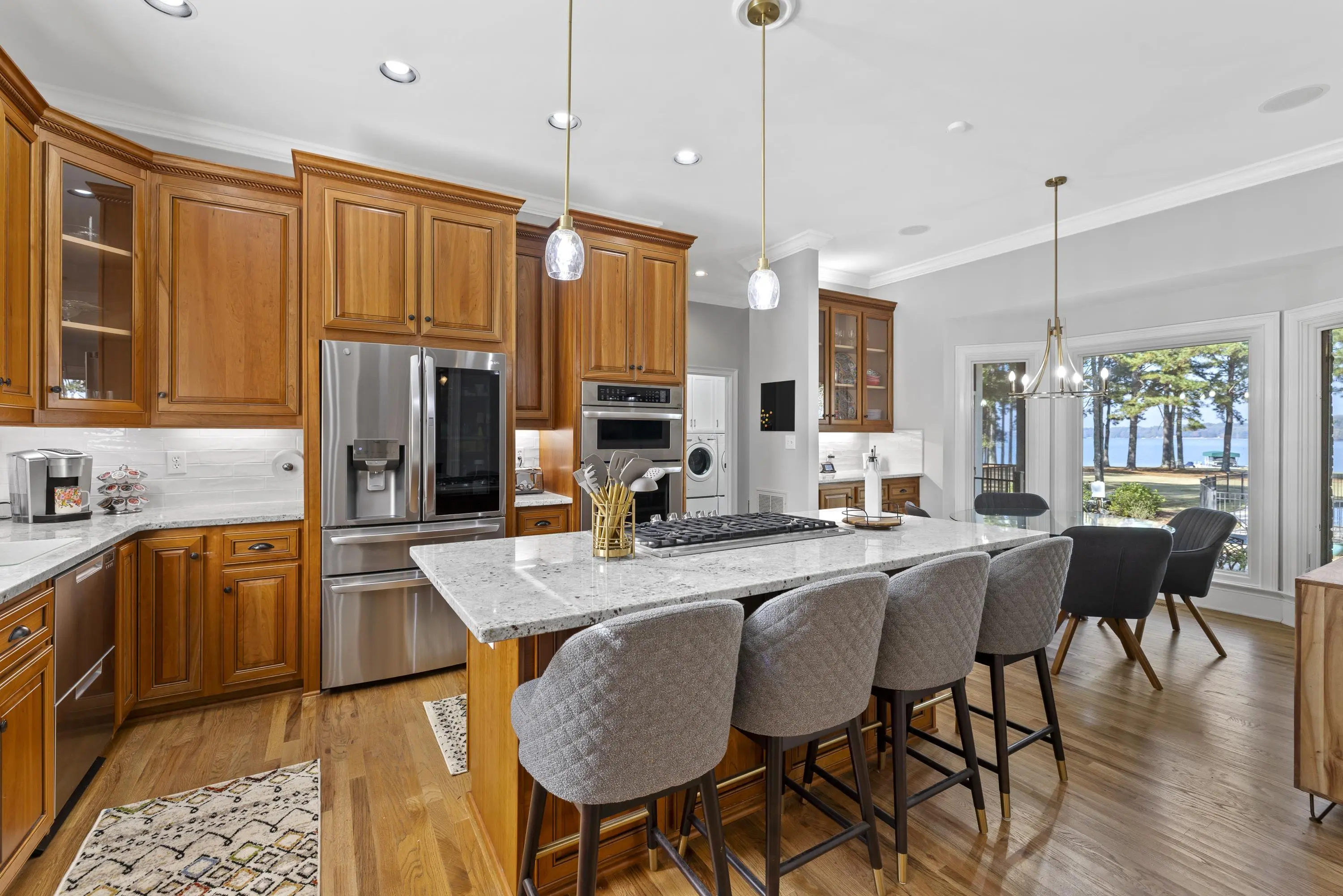 Welcome to 154 Bradford Drive, located within the sought-after Sebastian Cove community on Lake Oconee. Inspired by William Poole’s “Berry Hill” design, this elegant four-sided brick home offers nearly 4,000 sqft of living space on a prime, level lot boasting approximately 300 ft of shoreline and sweeping 180-degree main-water views. The main-level owner’s suite serves as a private retreat, featuring a beautifully renovated en-suite bath and large windows framing panoramic water views. Showcasing wall-to-wall windows and a striking stacked-stone fireplace, the main living are is filling with natural light and warmth. A spacious office with custom built-ins provides an ideal space for work or study. The kitchen offers generous solid-surface countertops, stainless steel appliances, and abundant cabinetry, seamlessly connecting to the home’s gathering areas for effortless entertaining. Upstairs, three additional bedrooms, two full baths, and a versatile flex space provide comfort and flexibility for family or guests. A newly constructed detached three-car garage enhances the property, offering over 400 sqft of finished living space above and an oversized bay designed for boat or camper storage. Whether relaxing on the screened porch, enjoying the saltwater pool, gathering around the firepit, or spending time on the private beach and dock, this property invites you to experience the very best of Lake Oconee living. Residents of Sebastian Cove also enjoy community amenities, including pickleball/tennis courts, a clubhouse, private boat ramp/dock and walking trails.