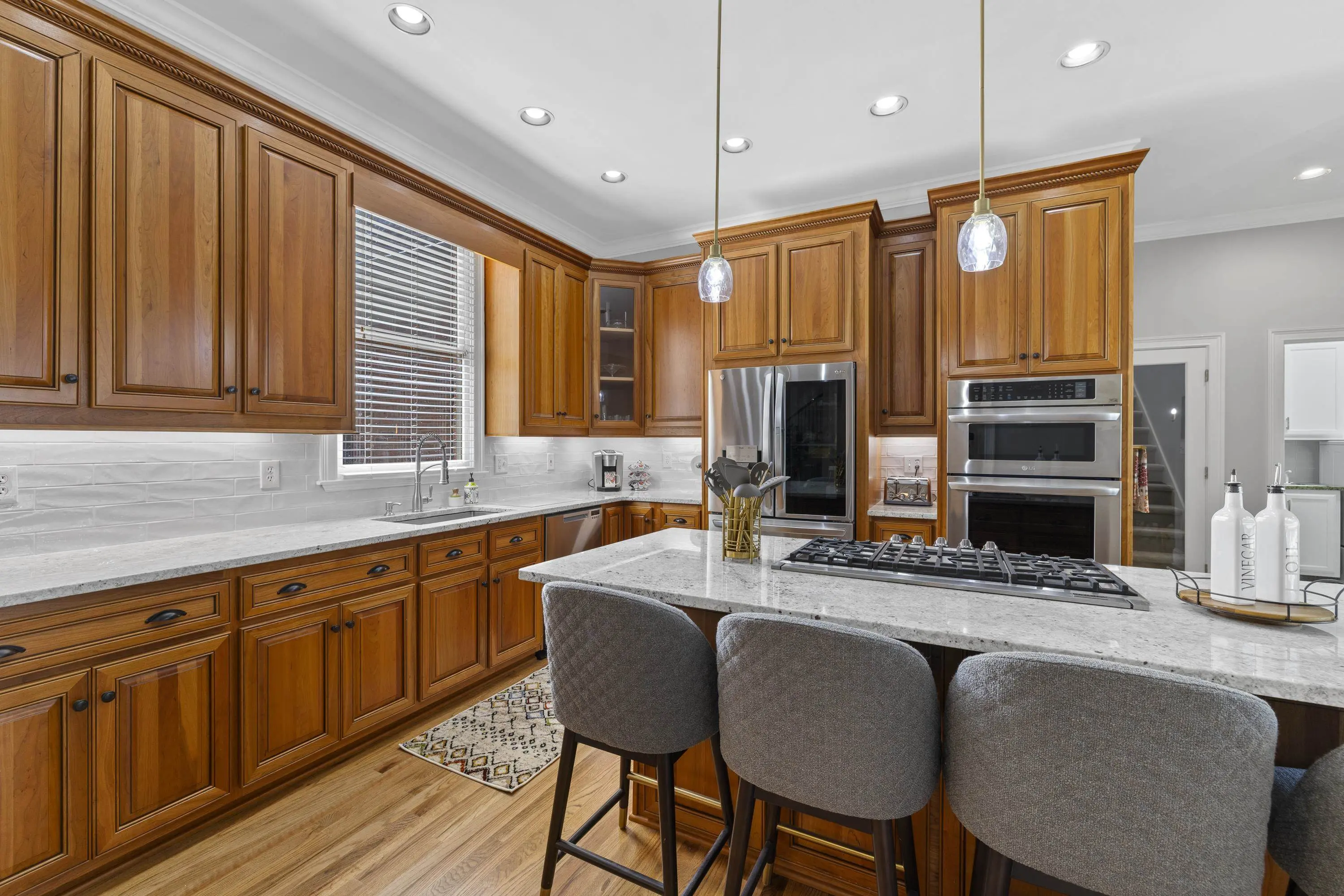 - AppliancesBuilt in Microwave, Cook Top, Dishwasher, Double Ovens, Dryer, Garbage Disposal, Refrigerator, Separate Ice Machine, Vent Hood, Wall Oven, Washer, StainlessSteel Appliances
