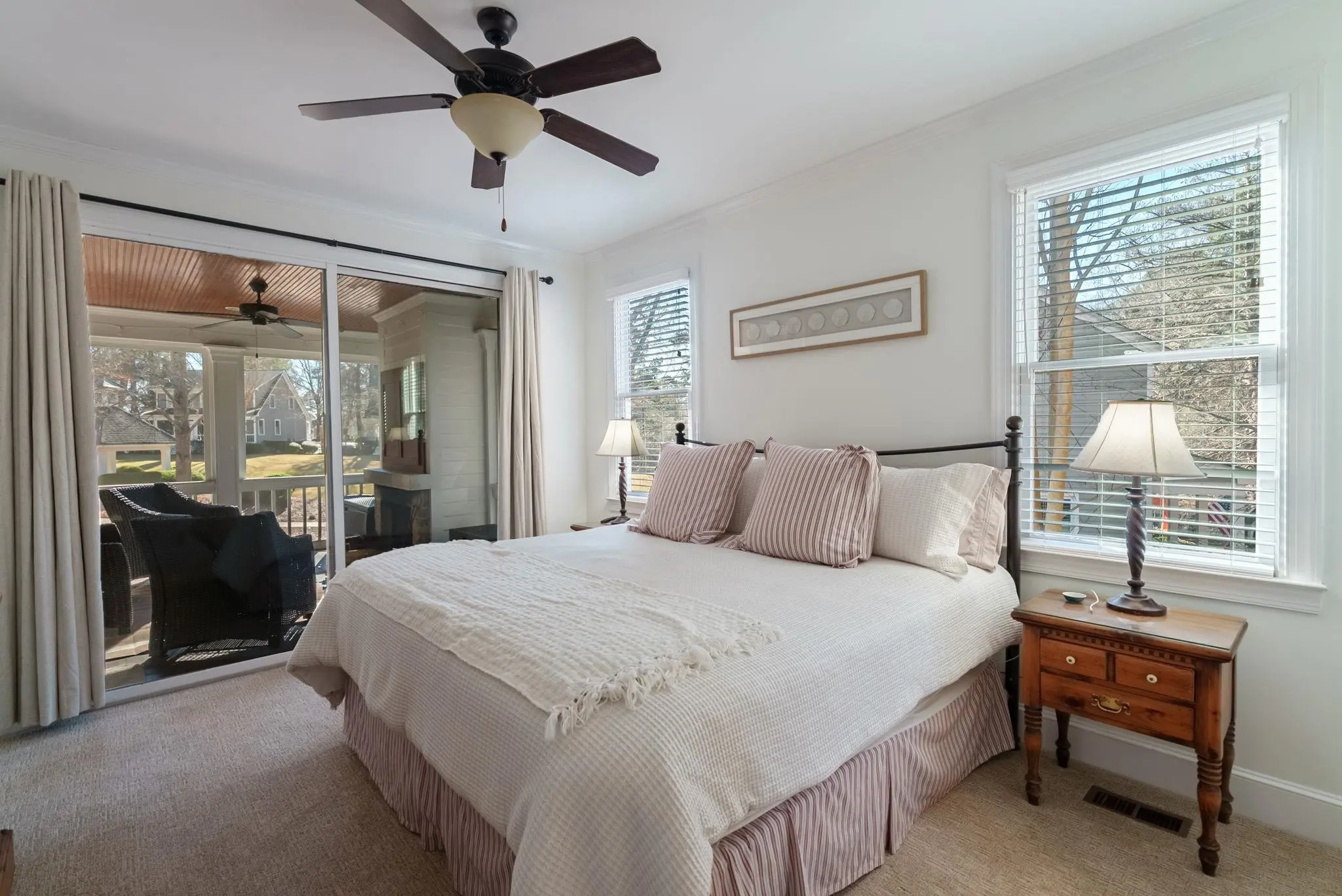 Welcome to this beautifully appointed Reynolds Premier Cottage located in the desirable Marina Cove Village. This inviting home offers 3 bedrooms and 2½ baths, with a primary suite conveniently located on the main level. Enjoy relaxed Southern living from the rocking-chair front porch, or step out back for direct access to a shaded community park. The marina is just a short walk away, along with 21 miles of scenic walking paths right outside your front door. A community dock provides easy access for boating and lake enjoyment. Inside, the main living space features an open floor plan, highlighted by a vaulted great room ceiling and cozy fireplace, perfect for entertaining or unwinding. The home boasts renovated bathrooms and new carpeting, offering a fresh, move-in-ready feel. Outdoor living is elevated with a screened porch complete with an outdoor fireplace, TV, and dining area, creating the ideal setting for year-round enjoyment. This cottage blends comfort, elegance, and an active lake lifestyle in one exceptional offering. Golf Membership Available.