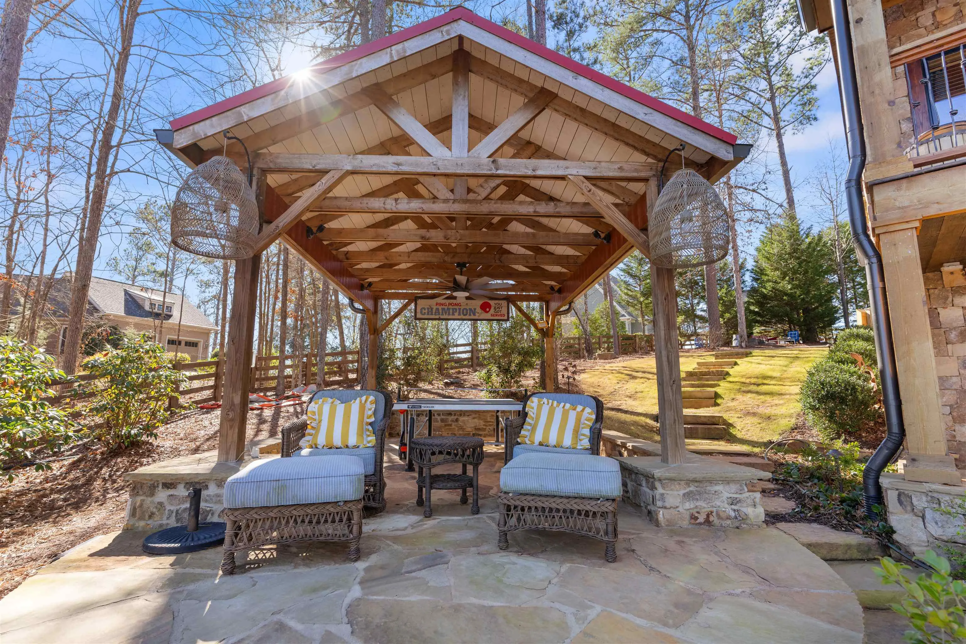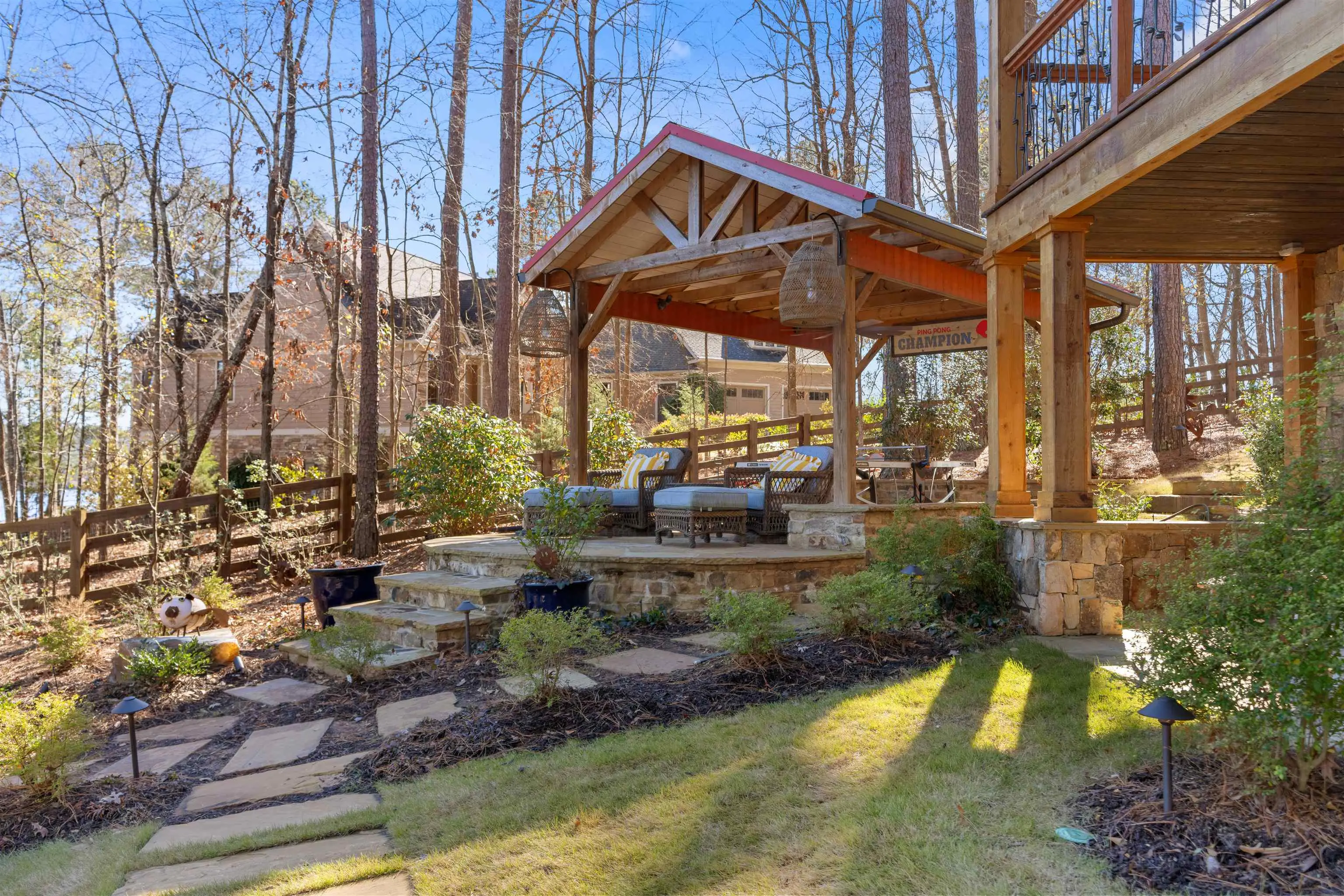 - FeaturesFenced Partially, Garden Area, Gazebo, Paved Driveway, Paved Walkway, Professional Landscaping, Shed, Walkways, Outdoor Fireplace, Firepit