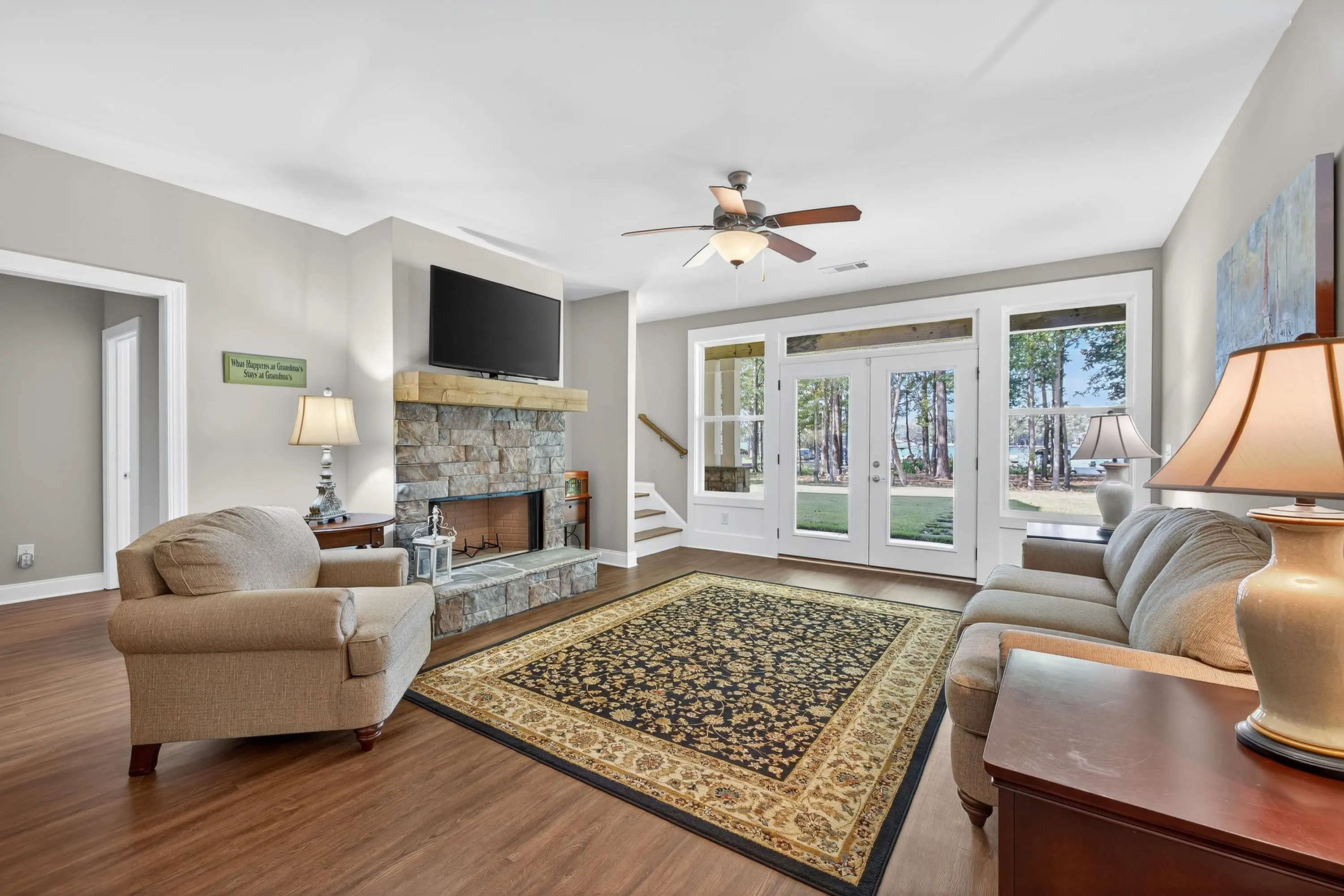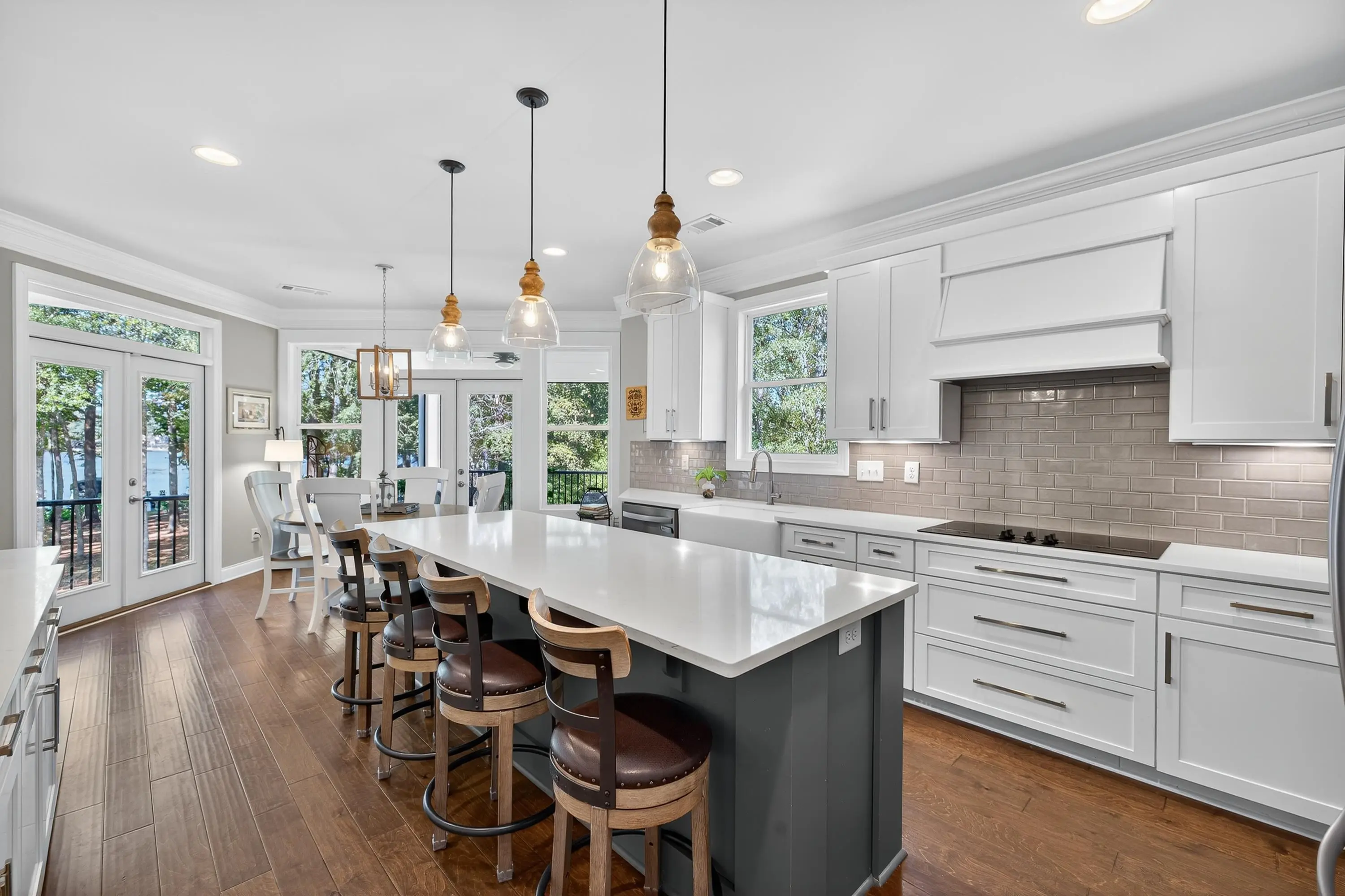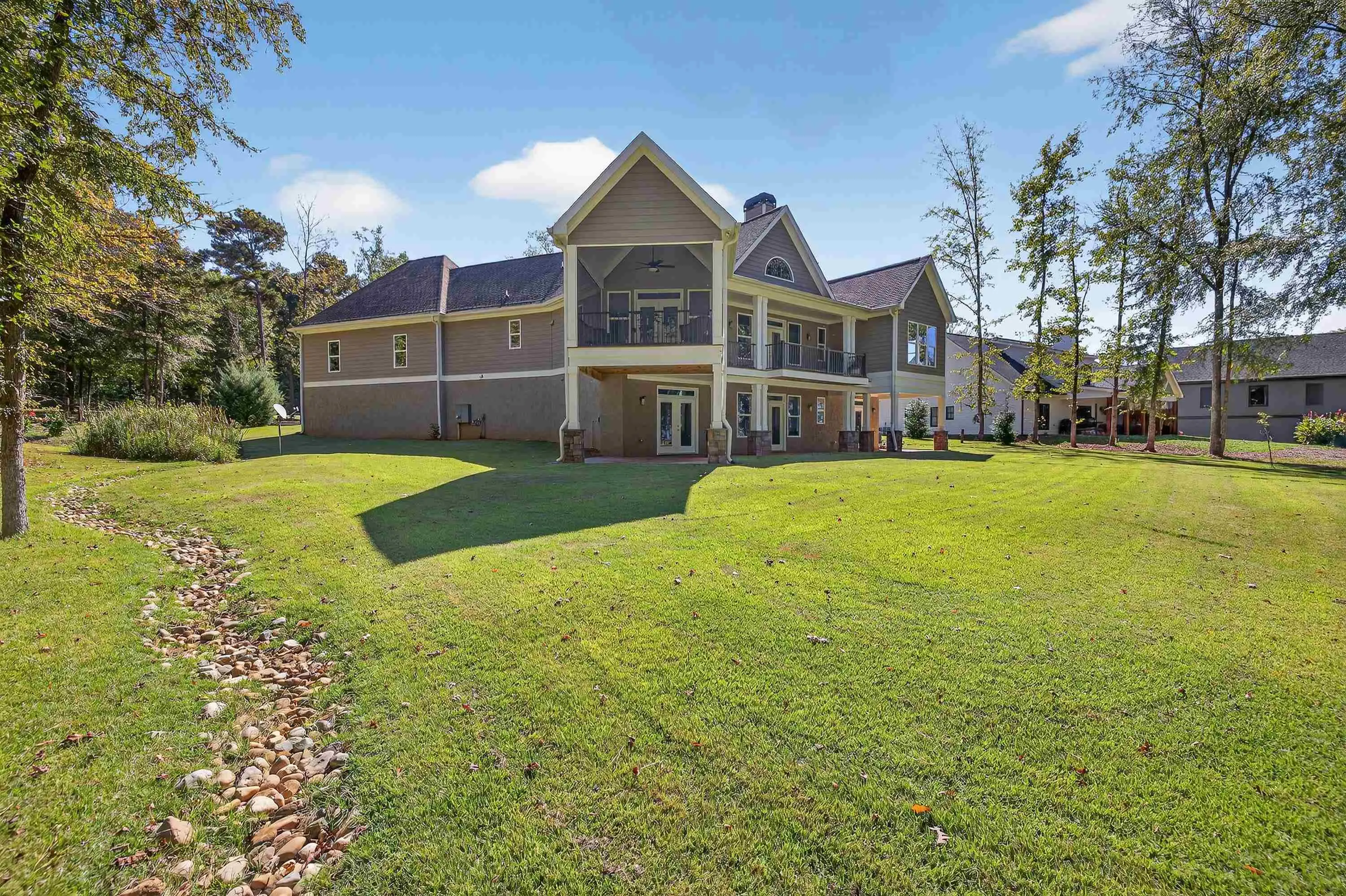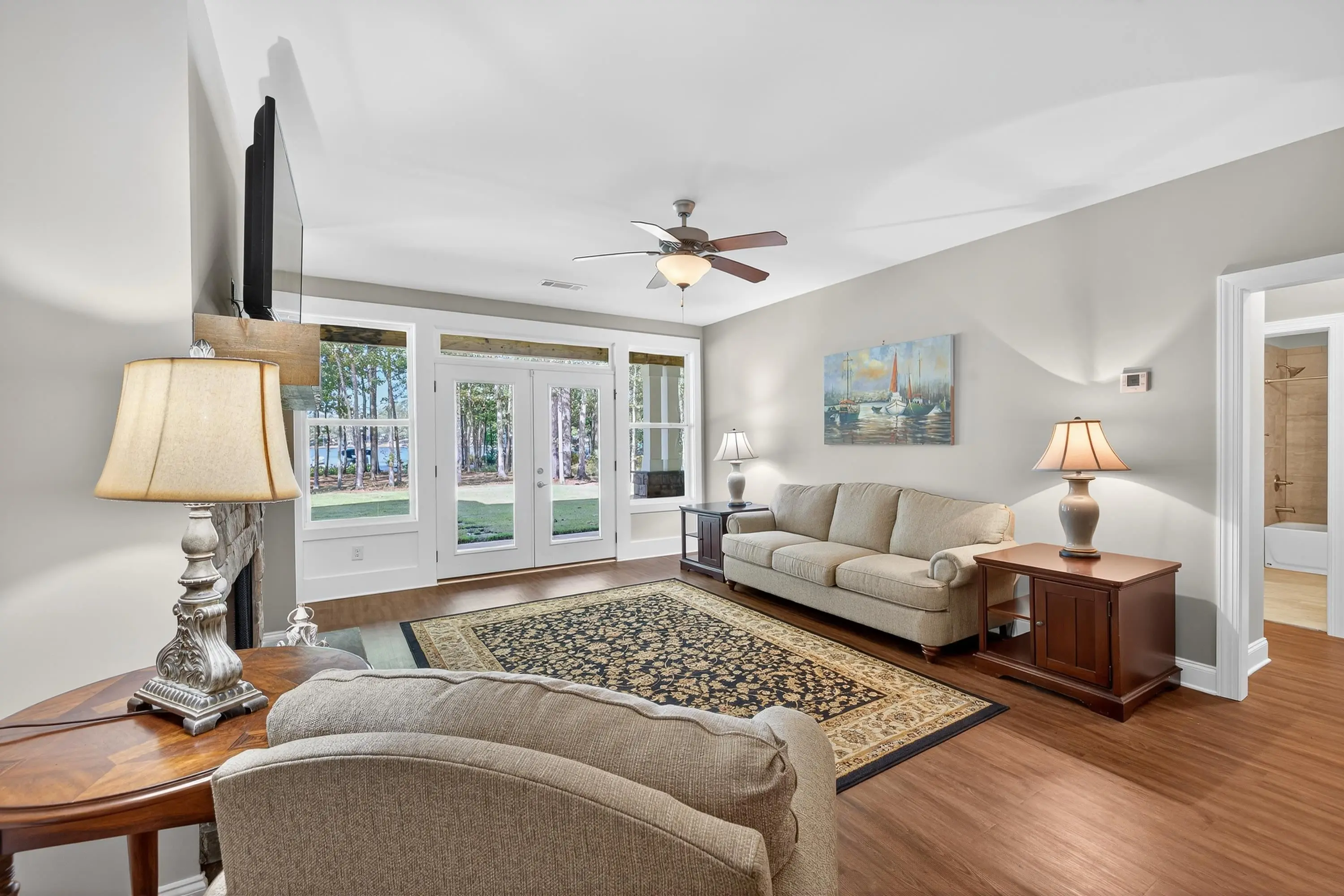 Welcome to this exceptional Smithbuilt custom home in the gated Sailview community on Lake Oconee. This stunning 4-bedroom, 3.5-bath residence is thoughtfully designed for both everyday comfort and effortless entertaining, with lake views from nearly every room and a bright, open floor plan showcasing upscale finishes throughout. The main level offers a spacious living area highlighted by custom trim, exposed ceiling beams, engineered hardwood floors, and a cozy wood-burning fireplace with built-in cabinetry. The chef's kitchen impresses with quartz countertops, stainless steel appliances, custom cabinetry, an oversized island, and ample storage. The primary suite is a true retreat, featuring custom closets and a spa-inspired bath, while a guest bedroom and half bath complete the main level. The terrace level provides a second living area, flexible space ideal for a home office or media room, two additional bedrooms with baths, and abundant storage. Outdoor living shines with a covered deck and screened porch-perfect for enjoying breathtaking Lake Oconee sunsets. A max dock delivers wide-open water views and endless opportunities for lake recreation. Blending timeless craftsmanship with modern comfort, this home offers the very best of lakefront living. One-year home warranty provided to buyer at closing.