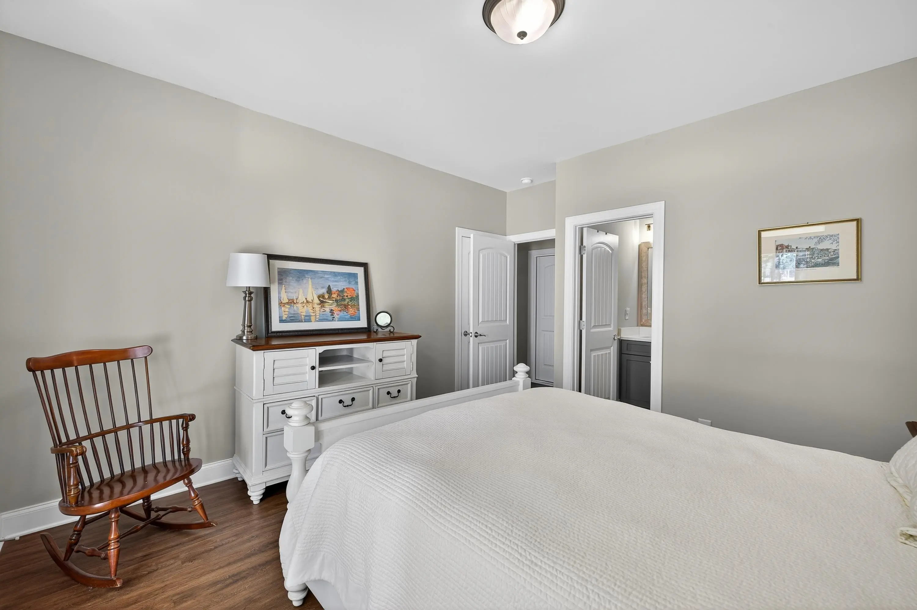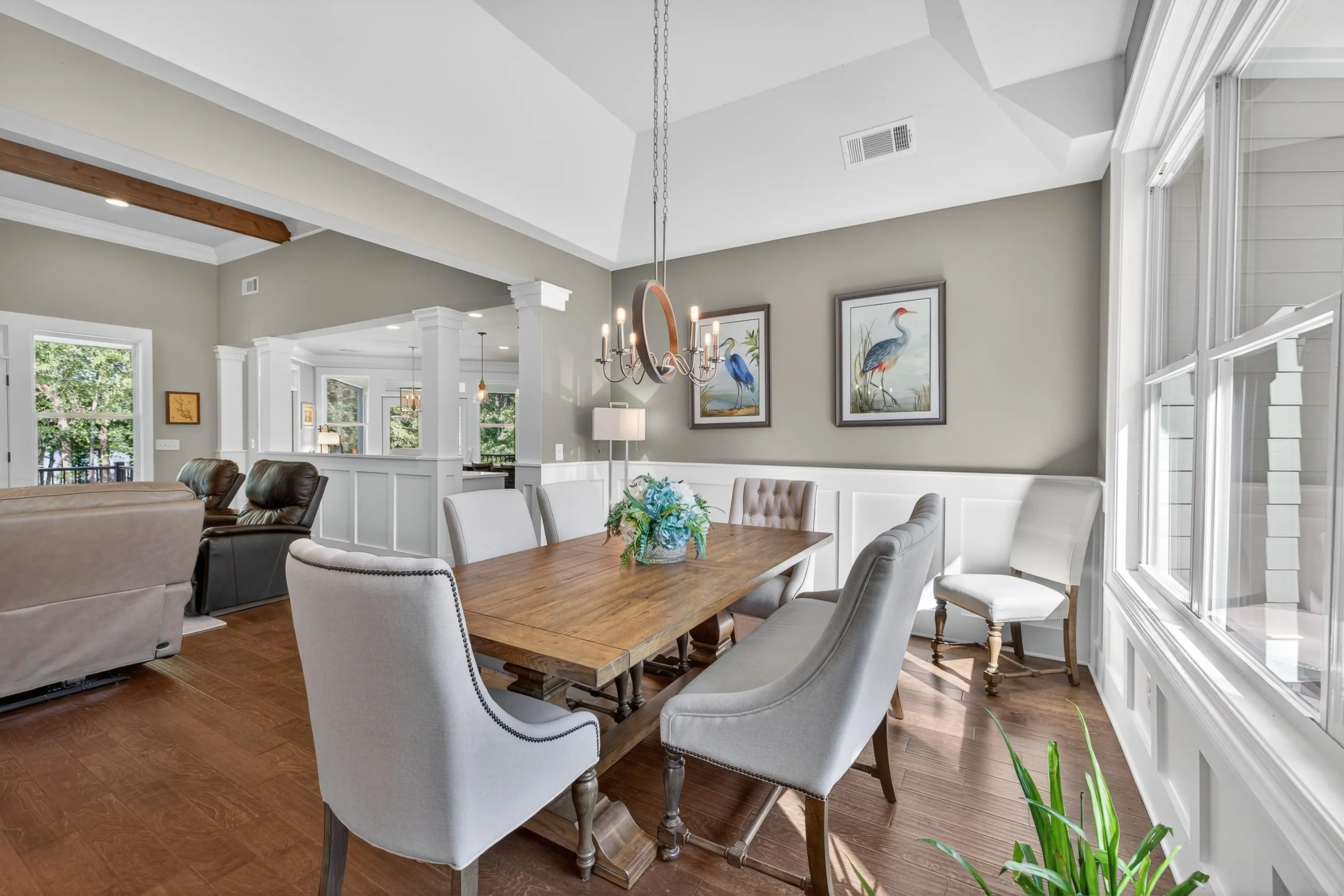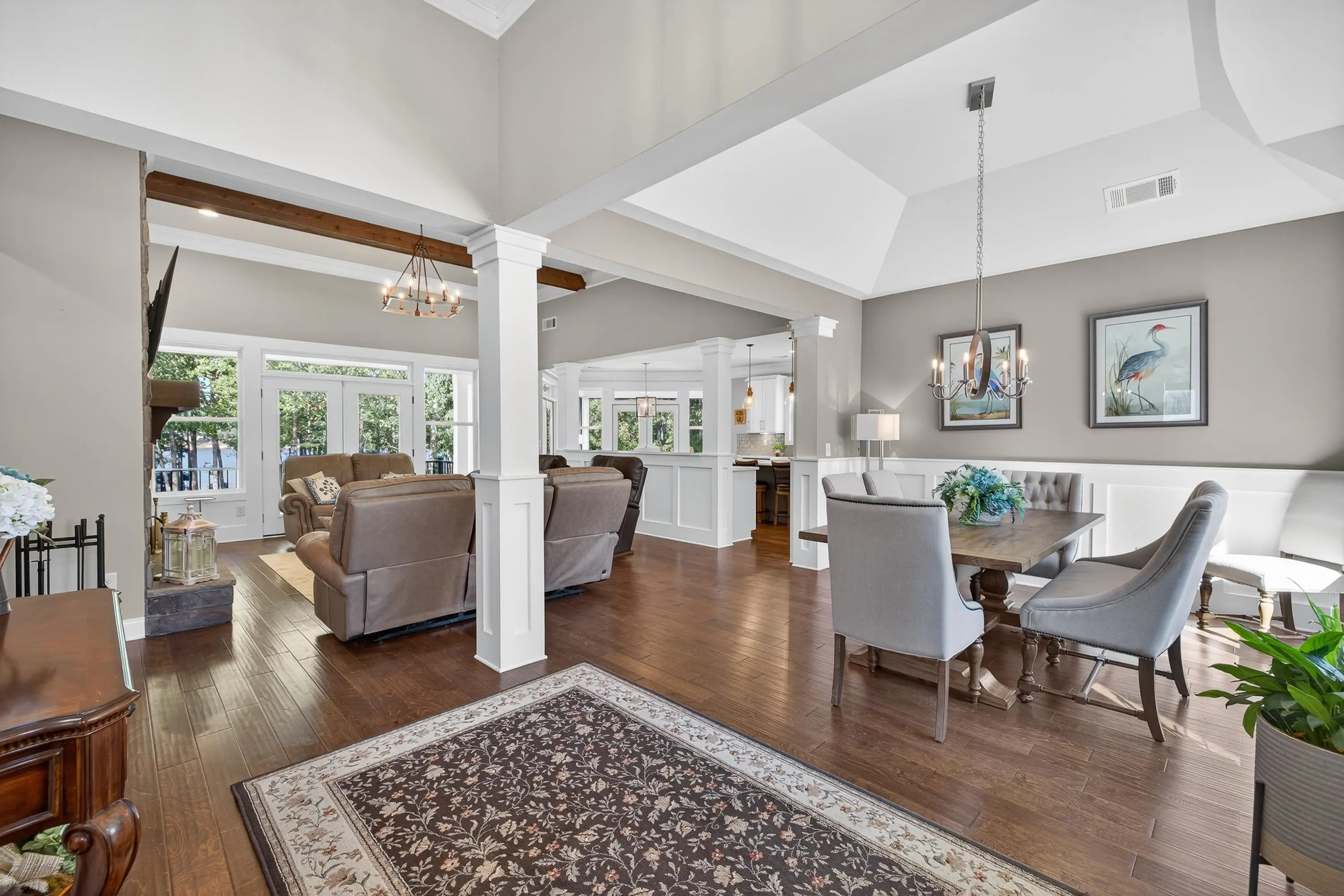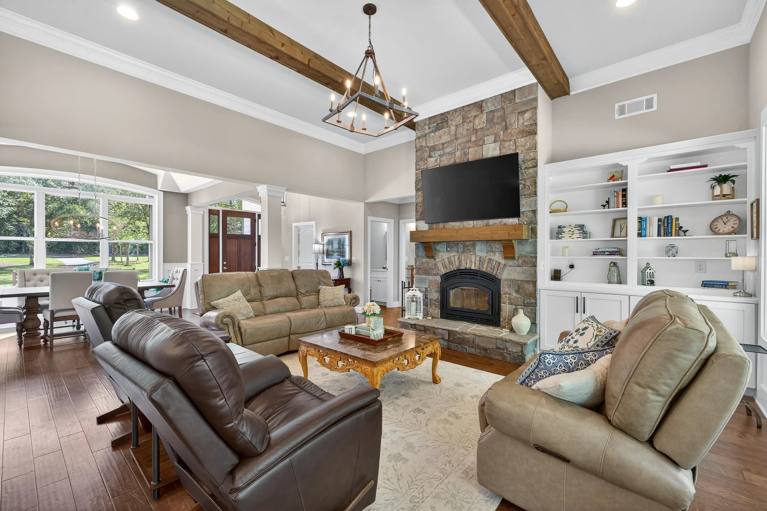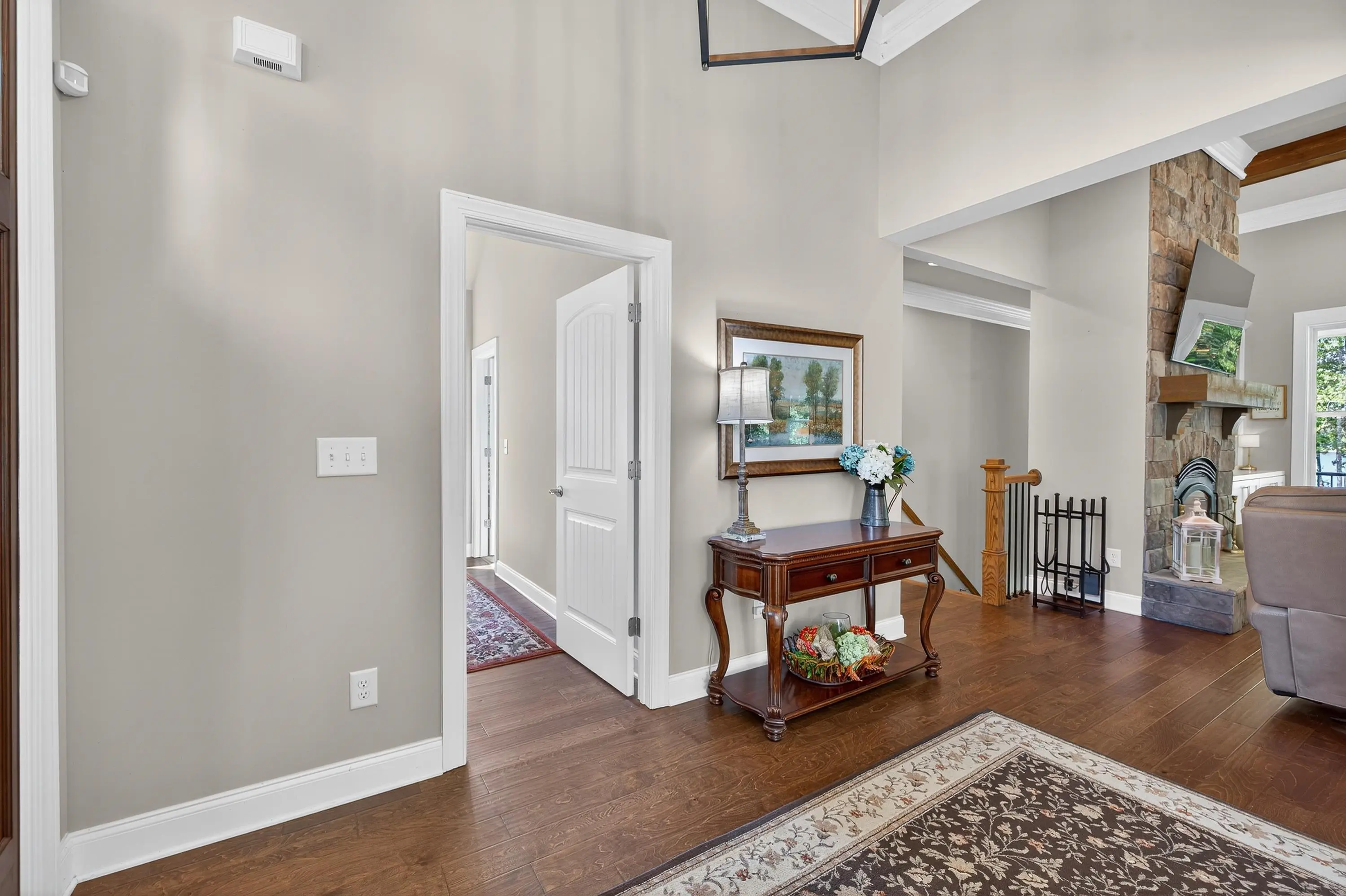 Welcome to this exceptional Smithbuilt custom home in the gated Sailview community on Lake Oconee. This stunning 4-bedroom, 3.5-bath residence is thoughtfully designed for both everyday comfort and effortless entertaining, with lake views from nearly every room and a bright, open floor plan showcasing upscale finishes throughout. The main level offers a spacious living area highlighted by custom trim, exposed ceiling beams, engineered hardwood floors, and a cozy wood-burning fireplace with built-in cabinetry. The chef's kitchen impresses with quartz countertops, stainless steel appliances, custom cabinetry, an oversized island, and ample storage. The primary suite is a true retreat, featuring custom closets and a spa-inspired bath, while a guest bedroom and half bath complete the main level. The terrace level provides a second living area, flexible space ideal for a home office or media room, two additional bedrooms with baths, and abundant storage. Outdoor living shines with a covered deck and screened porch-perfect for enjoying breathtaking Lake Oconee sunsets. A max dock delivers wide-open water views and endless opportunities for lake recreation. Blending timeless craftsmanship with modern comfort, this home offers the very best of lakefront living. One-year home warranty provided to buyer at closing.