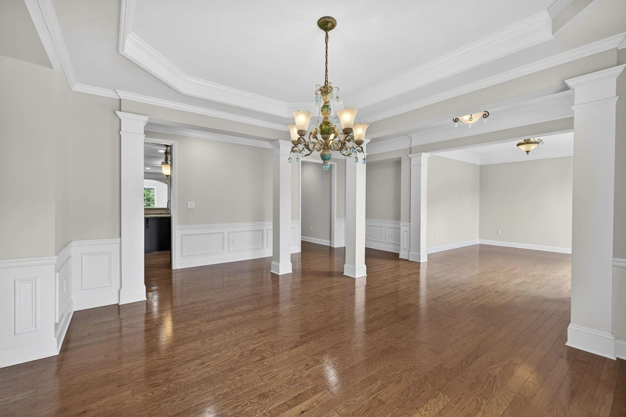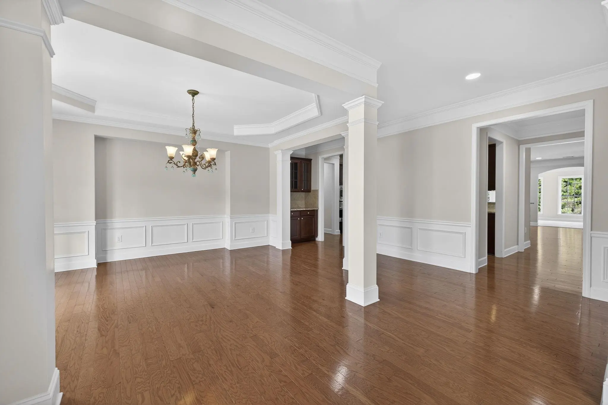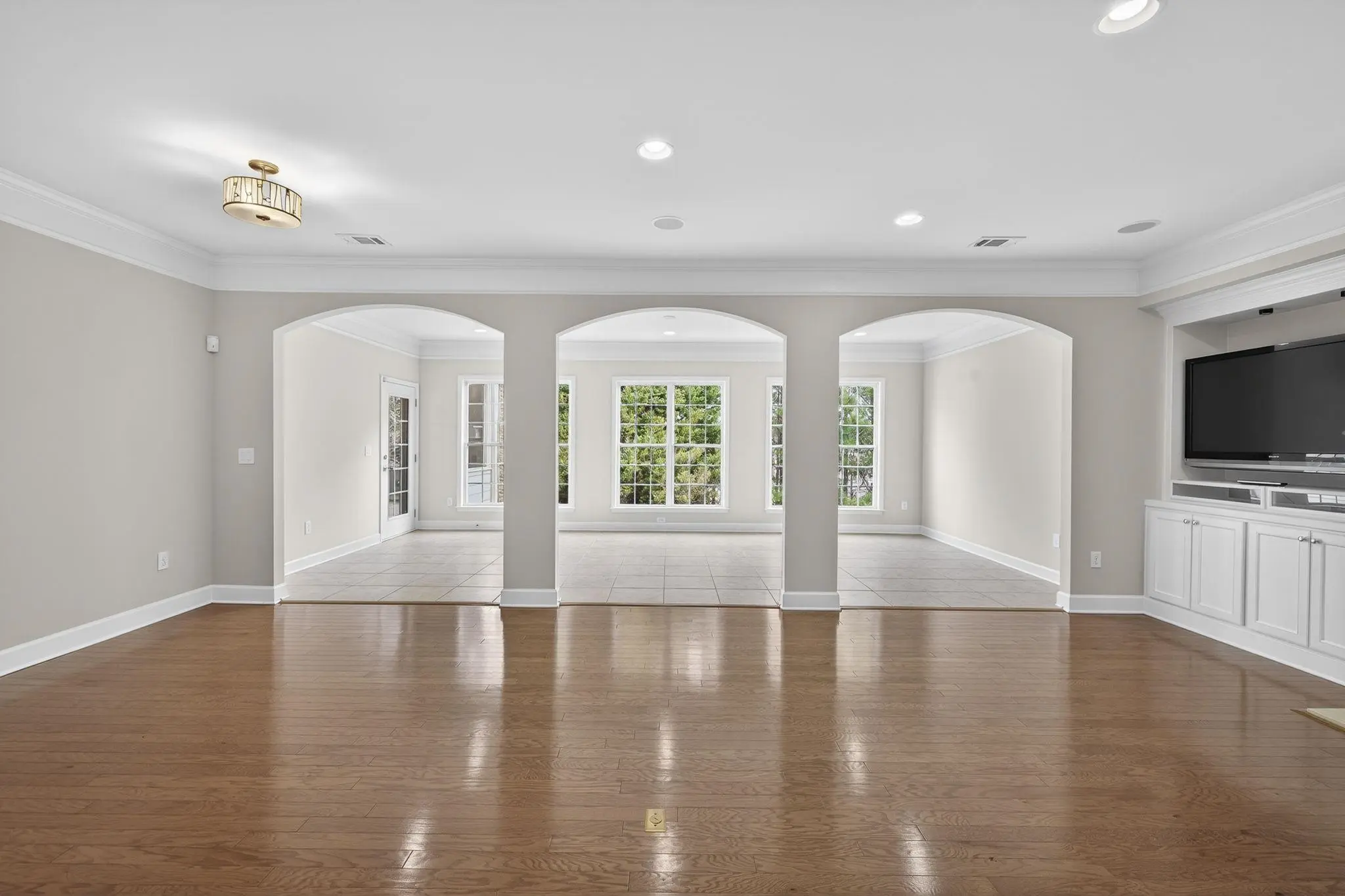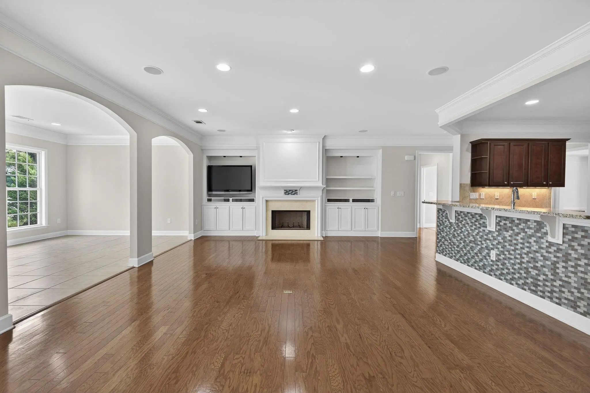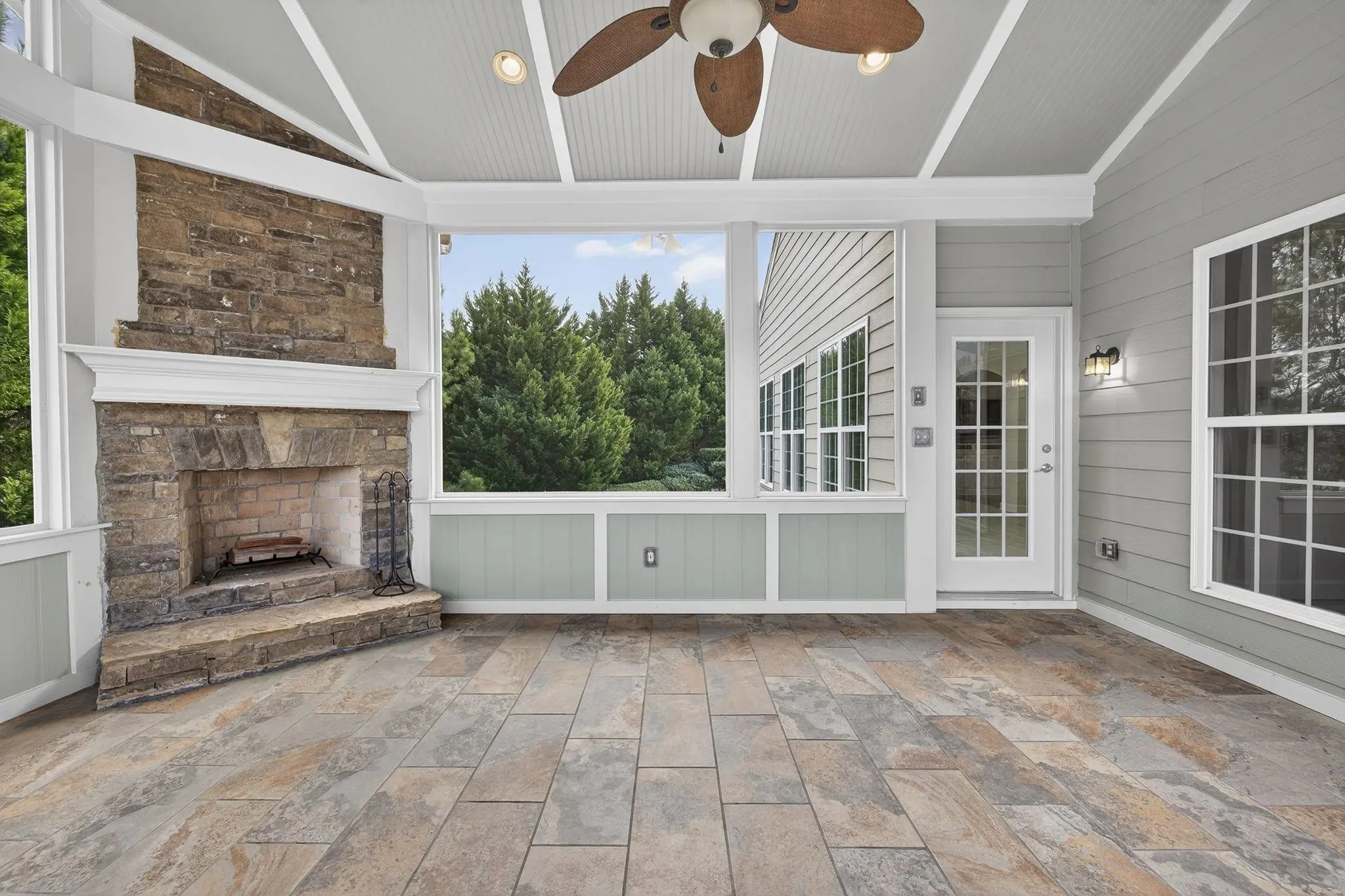 Rare and highly desirable Del Webb Morningside plan with a full finished terrace level, offering 4 bedrooms and 4.5 baths. Tucked away on a quiet cul-de-sac, this home enjoys a park-like setting in the front and mature trees and shrubs in the rear, providing privacy and peaceful views. Designed for both everyday comfort and entertaining, the home features two screened porchesâeach with slate or tile flooring and beautiful stone fireplacesâconnected by a charming spiral staircase. The spacious main-level living room showcases a fireplace framed by custom cabinetry and accent lighting, while the bright sunroom offers a wall of windows that fills the space with natural light. The gourmet kitchen is thoughtfully appointed with a breakfast bar featuring custom glass tile, a center island, walk-in pantry, and stainless steel appliances. The primary suite includes a tray ceiling, ceiling fan, and a generous en suite bath with double vanities, jetted tub, and separate his-and-hers closets. A formal dining room with tray ceiling, butlerâs pantry, custom chandelier, and hardwood floors adds an elegant touch. An office or flex room, large laundry room with sink and cabinetry, and a half bath complete the main level, totaling approximately 2,842 square feet. The finished terrace level expands the living space dramatically with a massive great room, additional sunroom, and a second kitchen equipped with a new cooktop, beverage refrigerator, and garbage disposal. The fourth bedroom is an en suite with a walk-in closet, making it ideal for guests or extended family. A large hobby room and second office or flex spaceâboth with custom cabinetry, shelving, and lightingâcreate a perfect in-law suite or multi-generational living arrangement. Additional features include an extended two-car garage with epoxy flooring and attic storage, two HVAC systems, a whole-house water filtration system, and a non-smoking, pet-free history. Move-in ready and meticulously maintained, this home offers the opportunity to enjoy Del Webbâs exceptional amenities and lawn care, all for one low HOA fee.