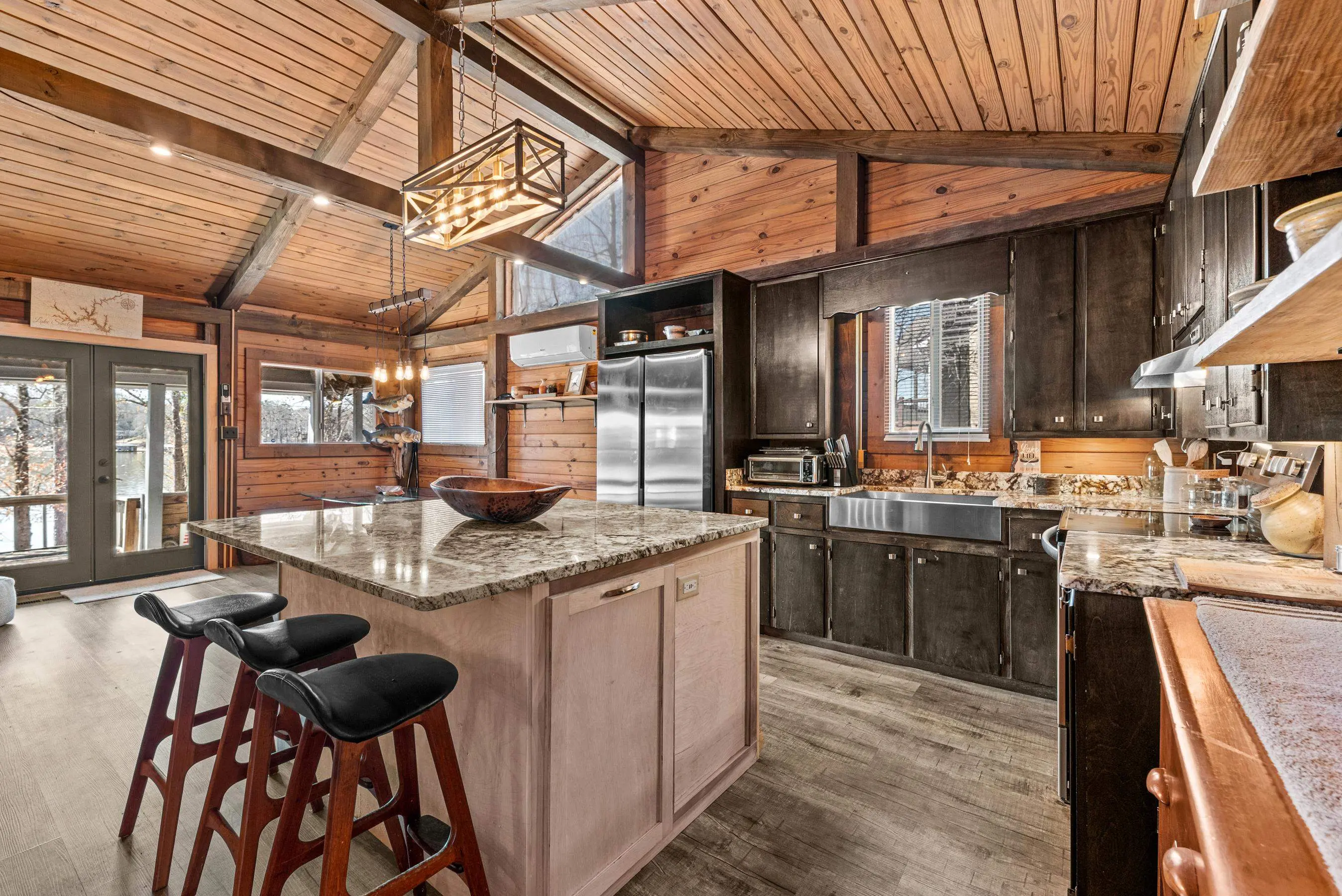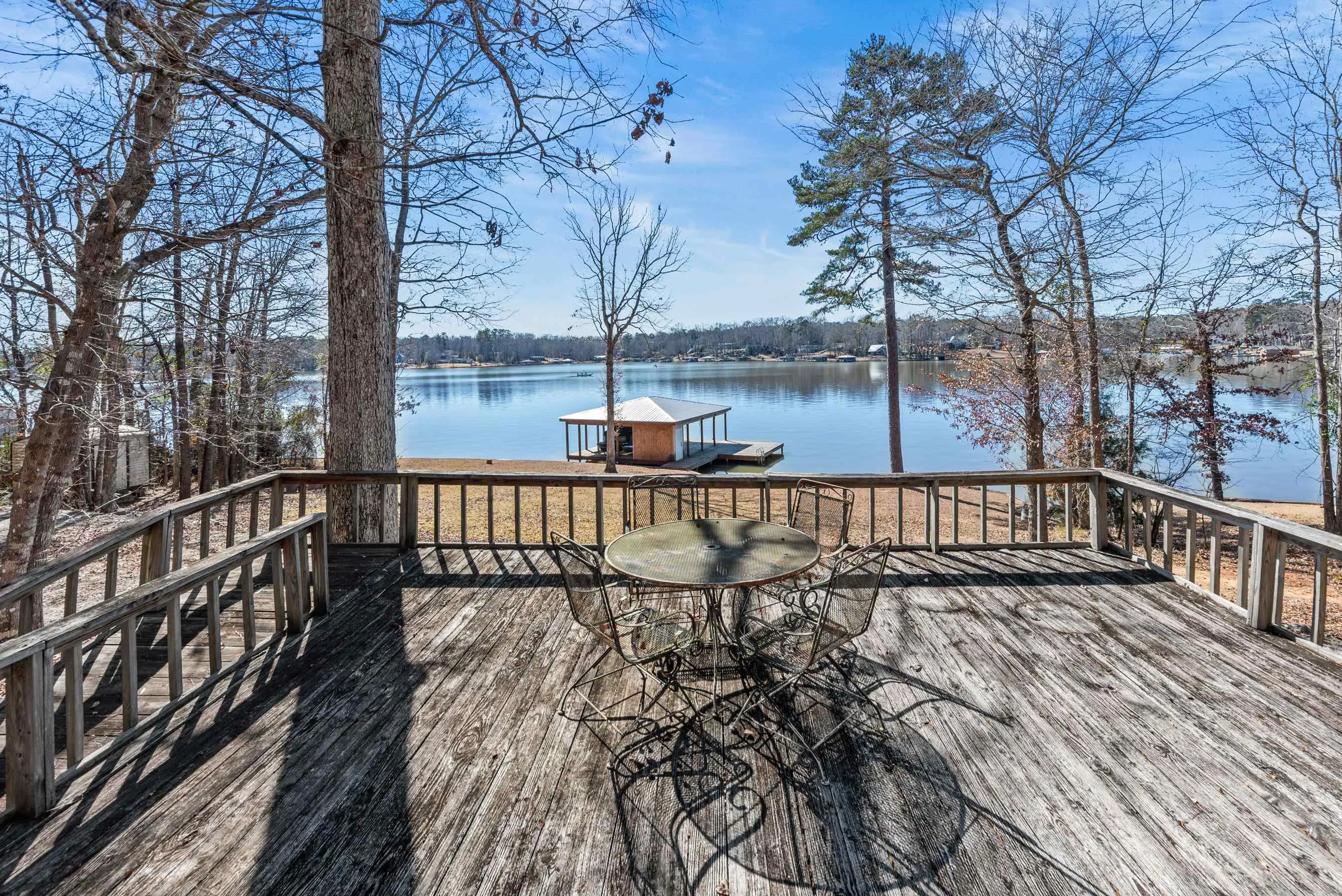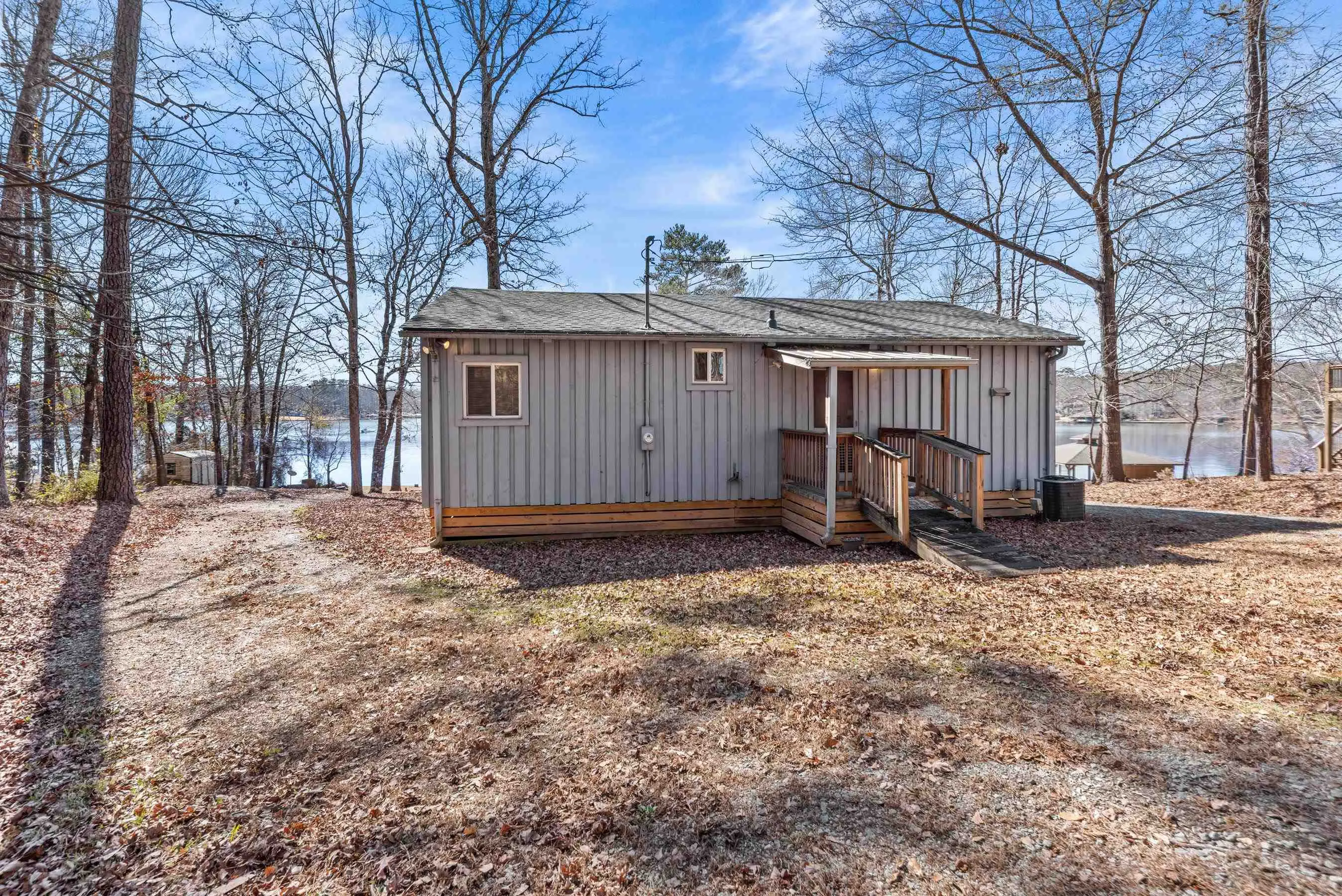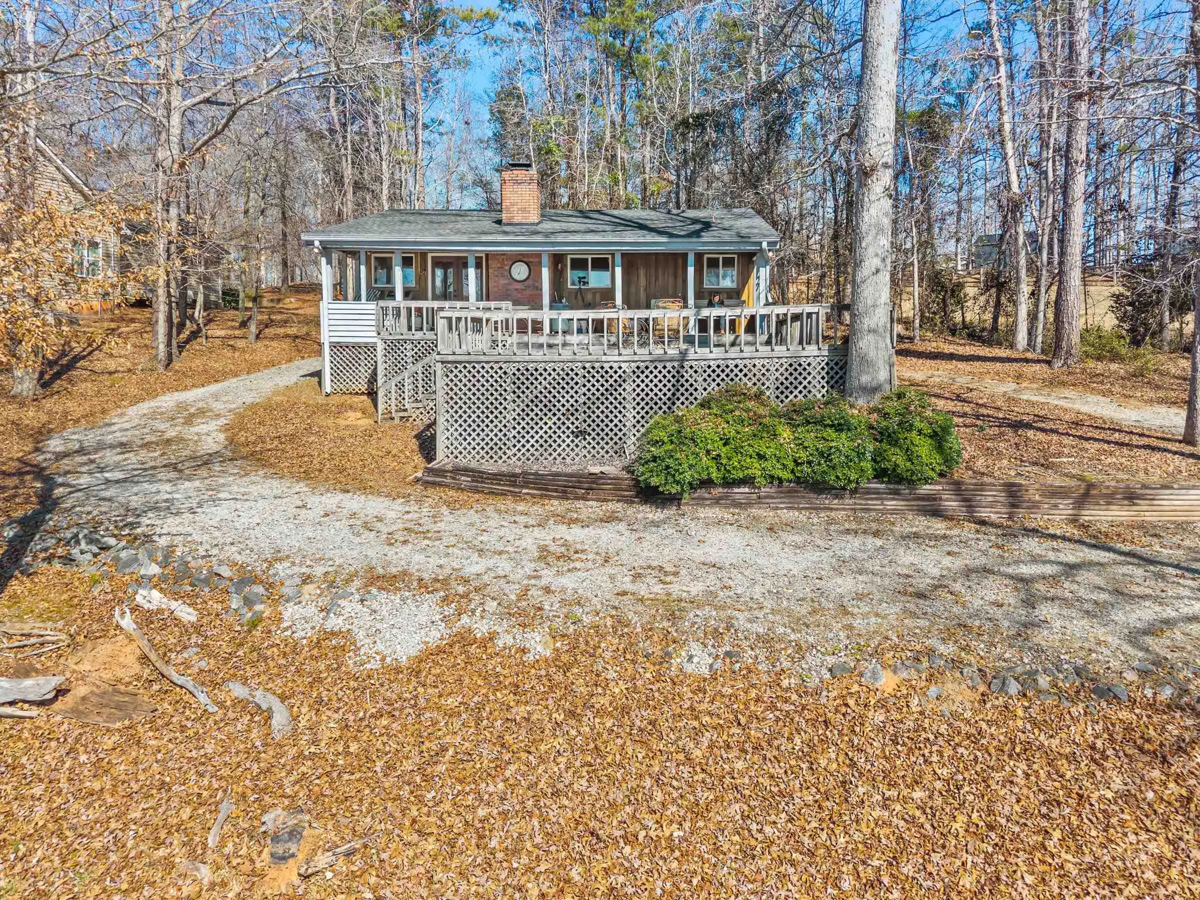 Charming Lake Sinclair waterfront cottage featuring 2 bedrooms and 1 bath with an open, relaxed layout that feels larger than its 935 square feet. The renovated kitchen offers granite countertops, a center island, and includes all appliances, flowing seamlessly into the living area with exposed wood walls, beams, and a cozy wood-burning fireplace. Both bedrooms easily accommodate king-size beds. New LVP flooring throughout enhances the casual lake-house vibe. Step out onto the deck to enjoy peaceful water views while relaxing on the swing. Over 160 feet of waterfront with deep water at the dock provides excellent fishing right from your backyard. A new Max Dock, completed in 2025, accommodates two boats. Recent updates include a new roof, mini-split HVAC system, and hot water heater. Ideal as a weekend getaway or laid-back full-time lake retreat. Great home for entertaining. Fee Simple.