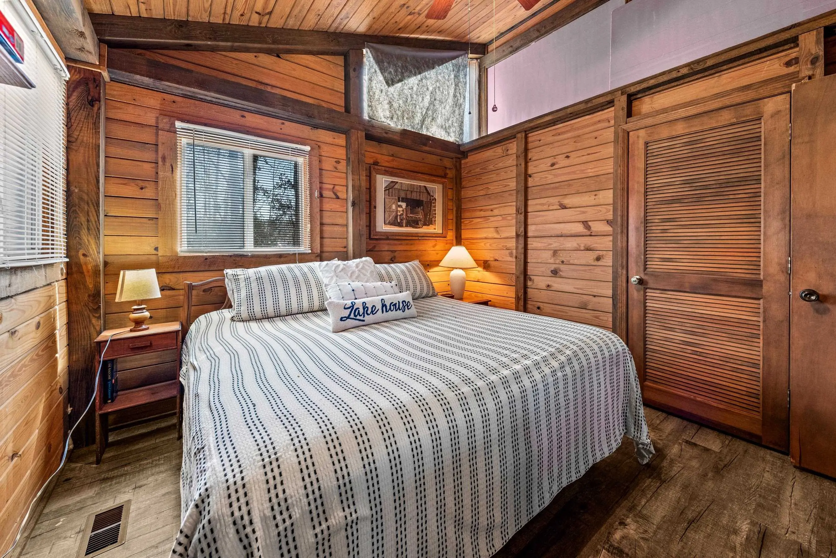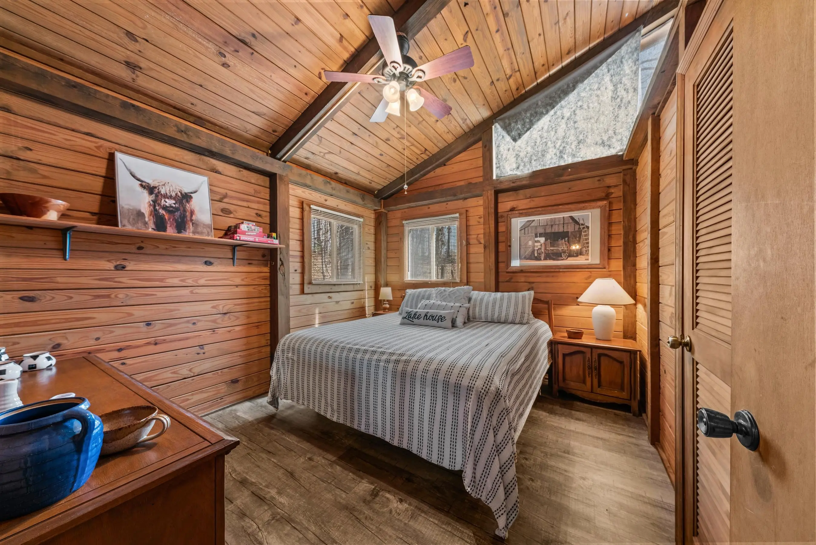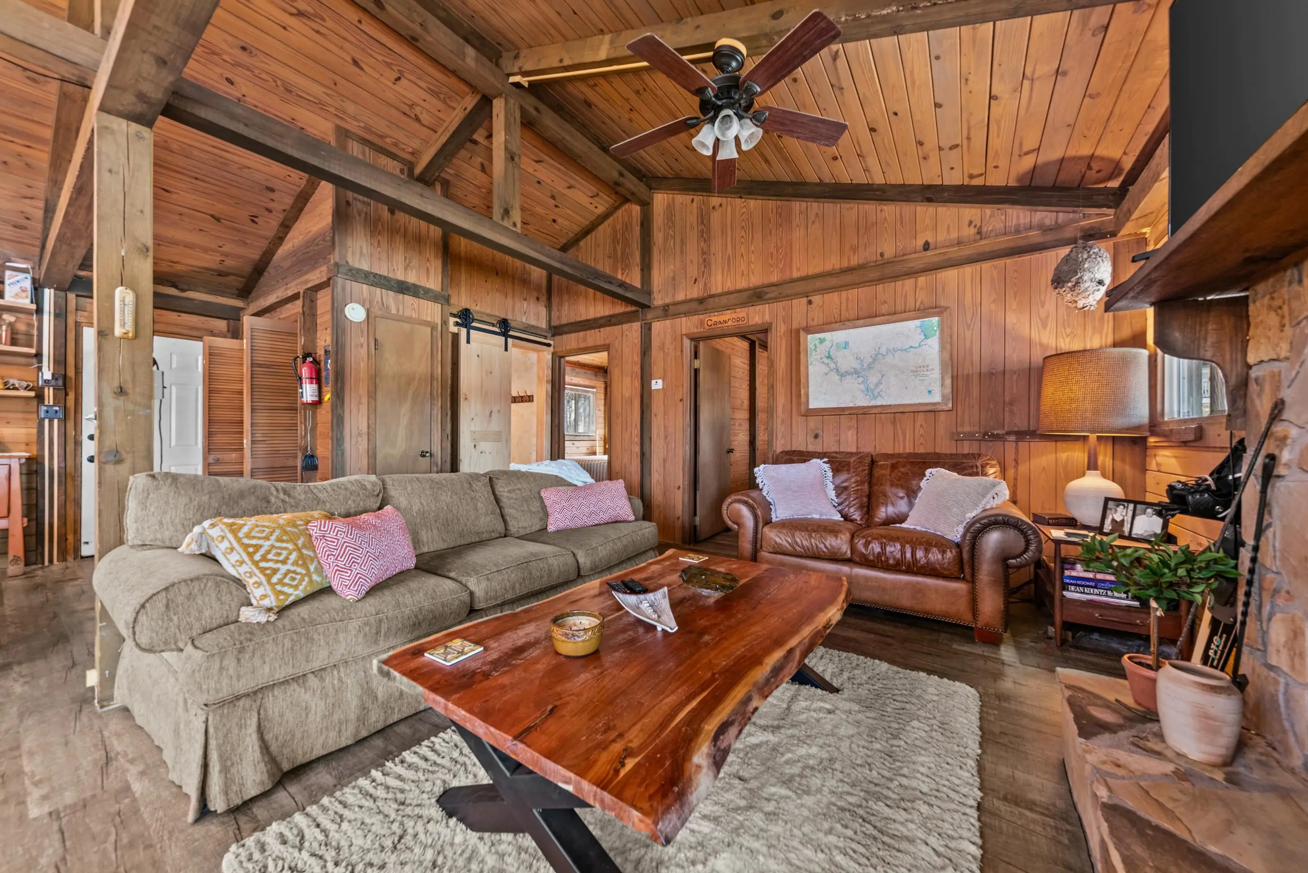 Charming Lake Sinclair waterfront cottage featuring 2 bedrooms and 1 bath with an open, relaxed layout that feels larger than its 935 square feet. The renovated kitchen offers granite countertops, a center island, and includes all appliances, flowing seamlessly into the living area with exposed wood walls, beams, and a cozy wood-burning fireplace. Both bedrooms easily accommodate king-size beds. New LVP flooring throughout enhances the casual lake-house vibe. Step out onto the deck to enjoy peaceful water views while relaxing on the swing. Over 160 feet of waterfront with deep water at the dock provides excellent fishing right from your backyard. A new Max Dock, completed in 2025, accommodates two boats. Recent updates include a new roof, mini-split HVAC system, and hot water heater. Ideal as a weekend getaway or laid-back full-time lake retreat. Great home for entertaining. Fee Simple.