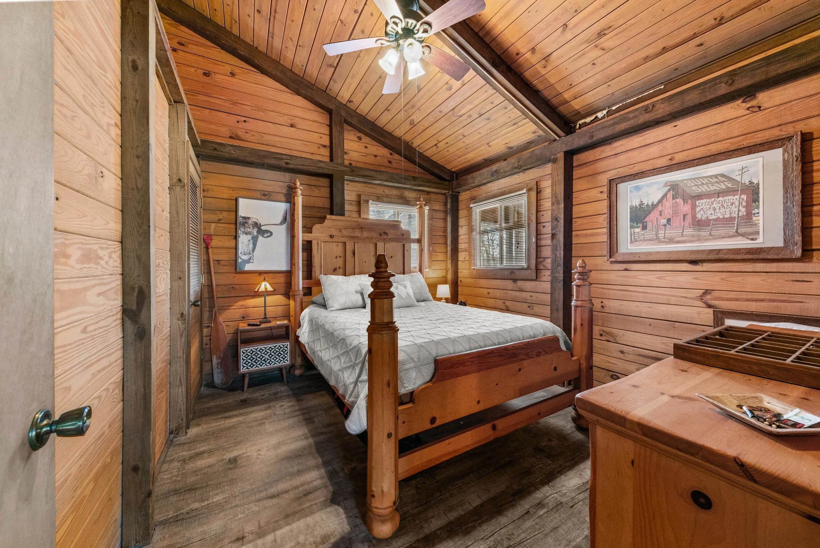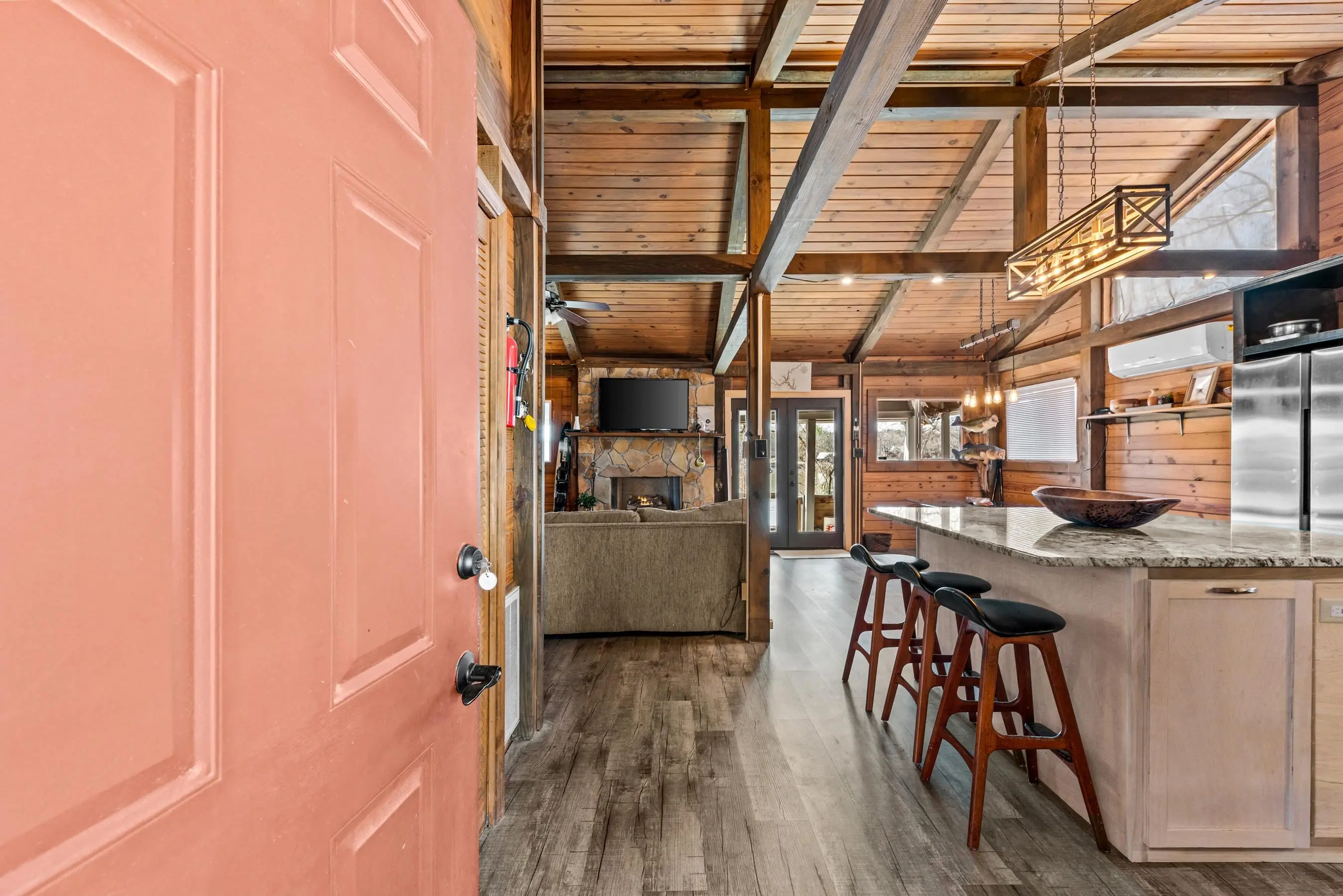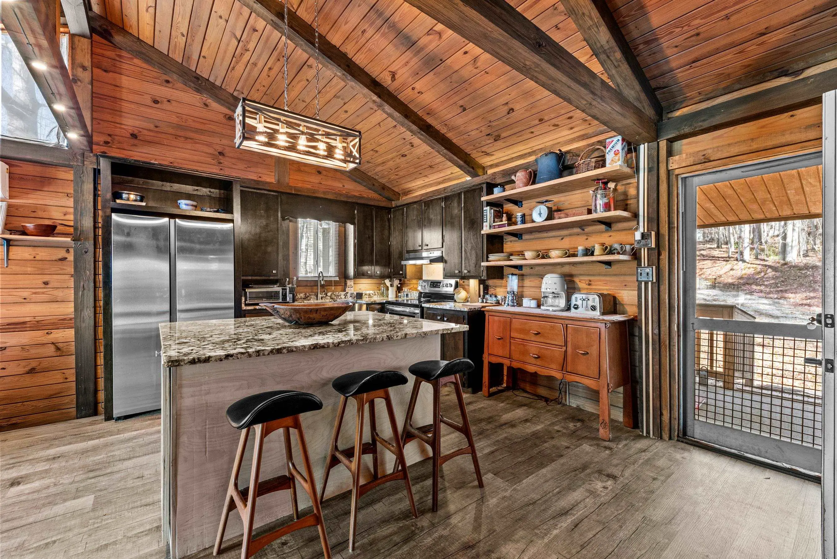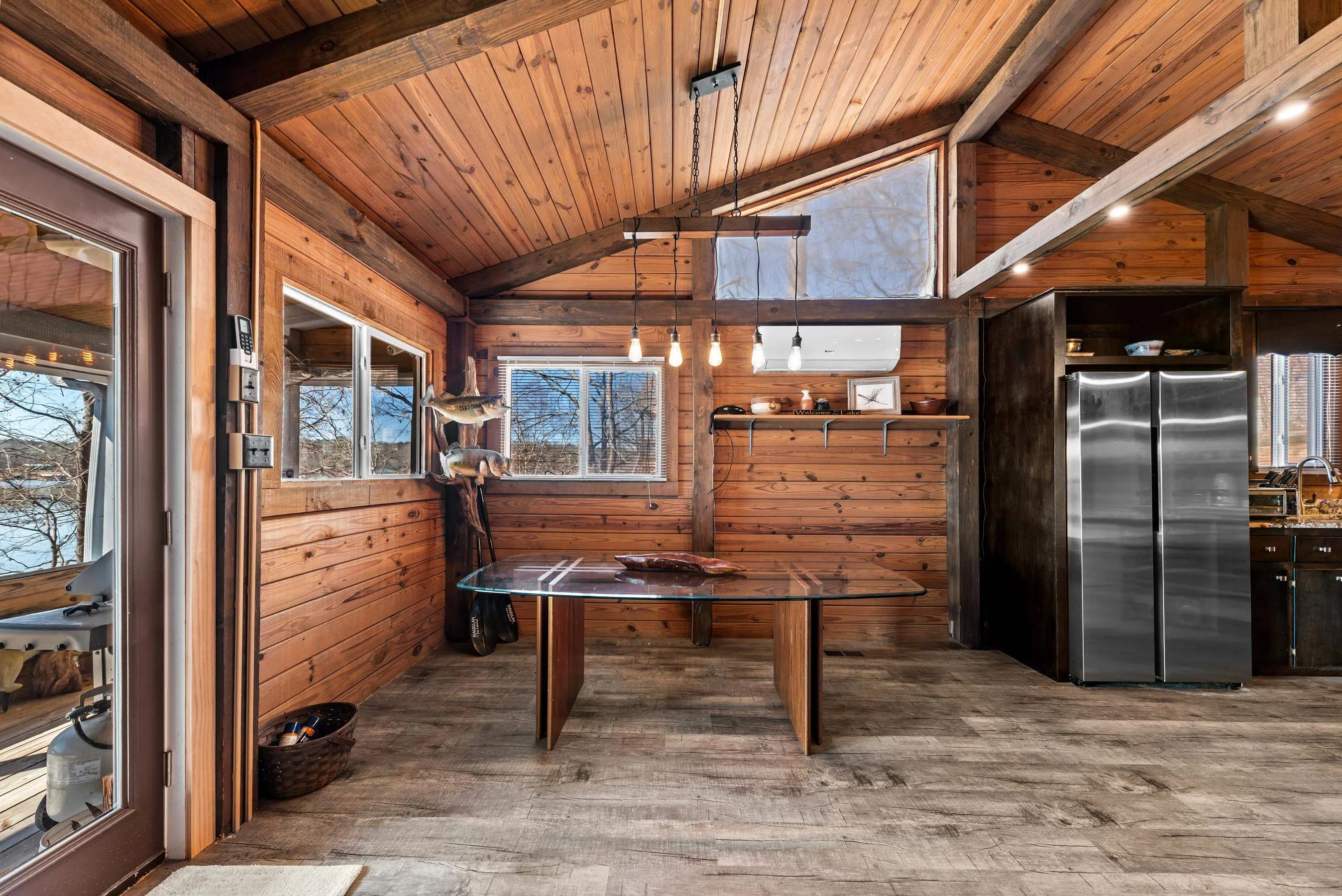 Charming Lake Sinclair waterfront cottage featuring 2 bedrooms and 1 bath with an open, relaxed layout that feels larger than its 935 square feet. The renovated kitchen offers granite countertops, a center island, and includes all appliances, flowing seamlessly into the living area with exposed wood walls, beams, and a cozy wood-burning fireplace. Both bedrooms easily accommodate king-size beds. New LVP flooring throughout enhances the casual lake-house vibe. Step out onto the deck to enjoy peaceful water views while relaxing on the swing. Over 160 feet of waterfront with deep water at the dock provides excellent fishing right from your backyard. A new Max Dock, completed in 2025, accommodates two boats. Recent updates include a new roof, mini-split HVAC system, and hot water heater. Ideal as a weekend getaway or laid-back full-time lake retreat. Great home for entertaining. Fee Simple.
