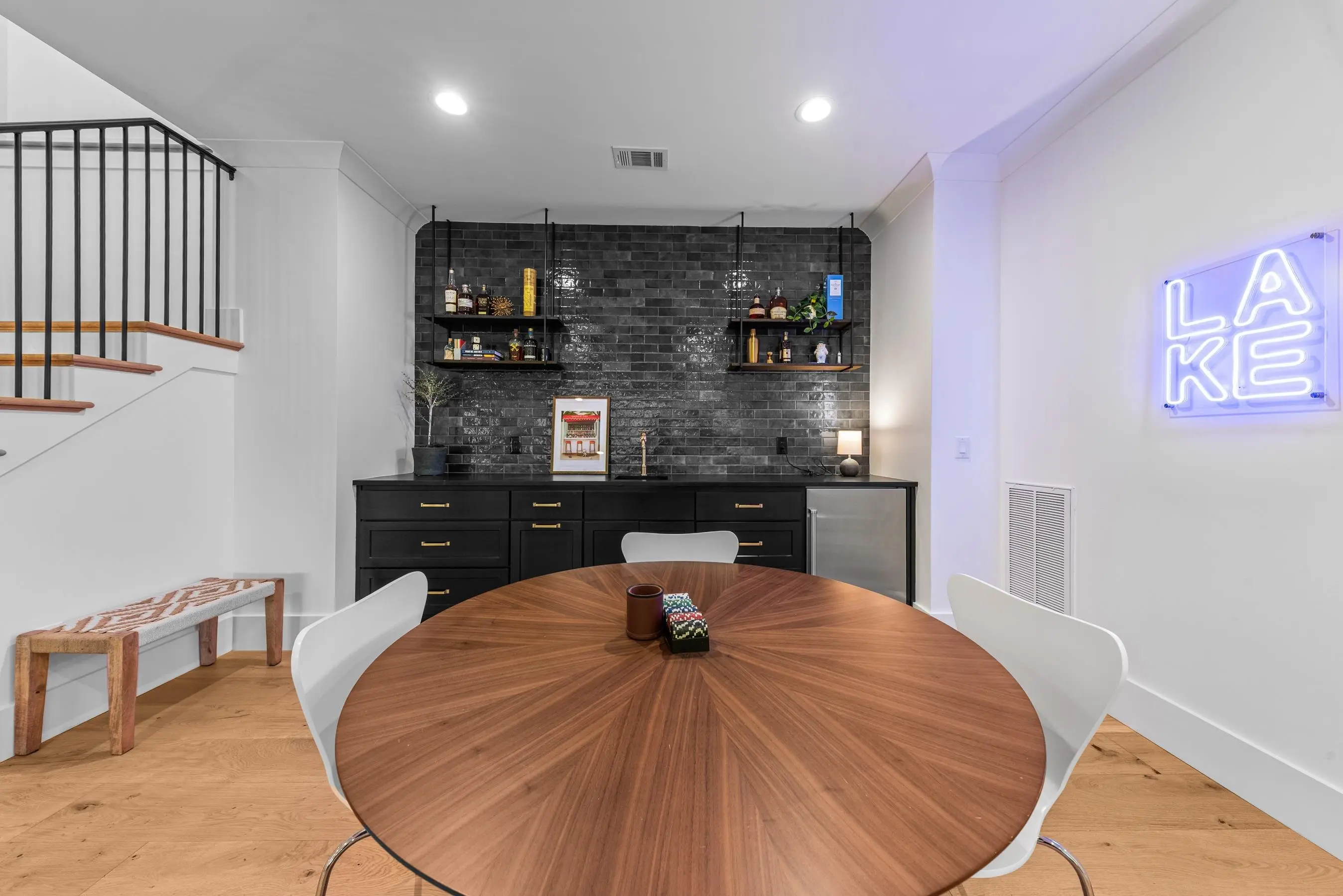 Lake Life Elevated! This move-in ready property offers the best of ALL worlds in Reynolds Lake Oconee: lake access, walking trails, pond views, proximity to championship golf, and premier amenities, all wrapped into one beautifully crafted, newer construction home in one of the communityâs most sought-after neighborhoods. Overlooking the tranquil waters of Angel Pond, this thoughtfully designed residence blends timeless architecture with elevated finishes and a layout designed for both refined entertaining and relaxed everyday living. The dramatic main living area features soaring 20-foot ceilings with exposed beams, wide-plank hardwood floors, designer lighting, and a gas fireplace with custom stone surround and tailored mantle, flanked by built-ins for architectural balance and warmth. The kitchen is as functional as it is stunning, anchored by a generous island with seating, custom cabinetry, a top-of-the-line Thermador Professional appliance suite, and a hand-cut Moroccan tile backsplash that adds artisanal texture and character. The seamless flow between kitchen, dining, and living spaces creates an ideal environment for gathering. The main-level primary suite is a true retreat, complete with a spa-inspired bath and a sleek electric linear fireplace that adds modern ambiance. Indoor and outdoor living connect effortlessly to a screened porch with a second gas fireplace overlooking the pond â a year-round destination for morning coffee or sunset evenings. A grilling deck and terrace-level patio further enhance the serene outdoor setting. The terrace level expands the homeâs versatility with private guest accommodations, a spacious bunk-style sleeping area, a gym, custom wine room, and multiple entertaining spaces. A finished room over the three-car garage with private bath provides additional flexibility for guests, office, or recreation. With space to comfortably sleep 12+, this home was designed to host. Additional highlights include zoned HVAC, an 84-gallon hot water heater with recirculation, water softener system, whole-home sound wiring, and custom garage storage. Just a short golf cart ride to your 24-hour assigned boat slip, and conveniently located near Creek Club, the new Fenmoor Golf Course, dining, shopping, medical facilities, Highway 44, and I-20 â this is lake living without compromise. Membership is available.