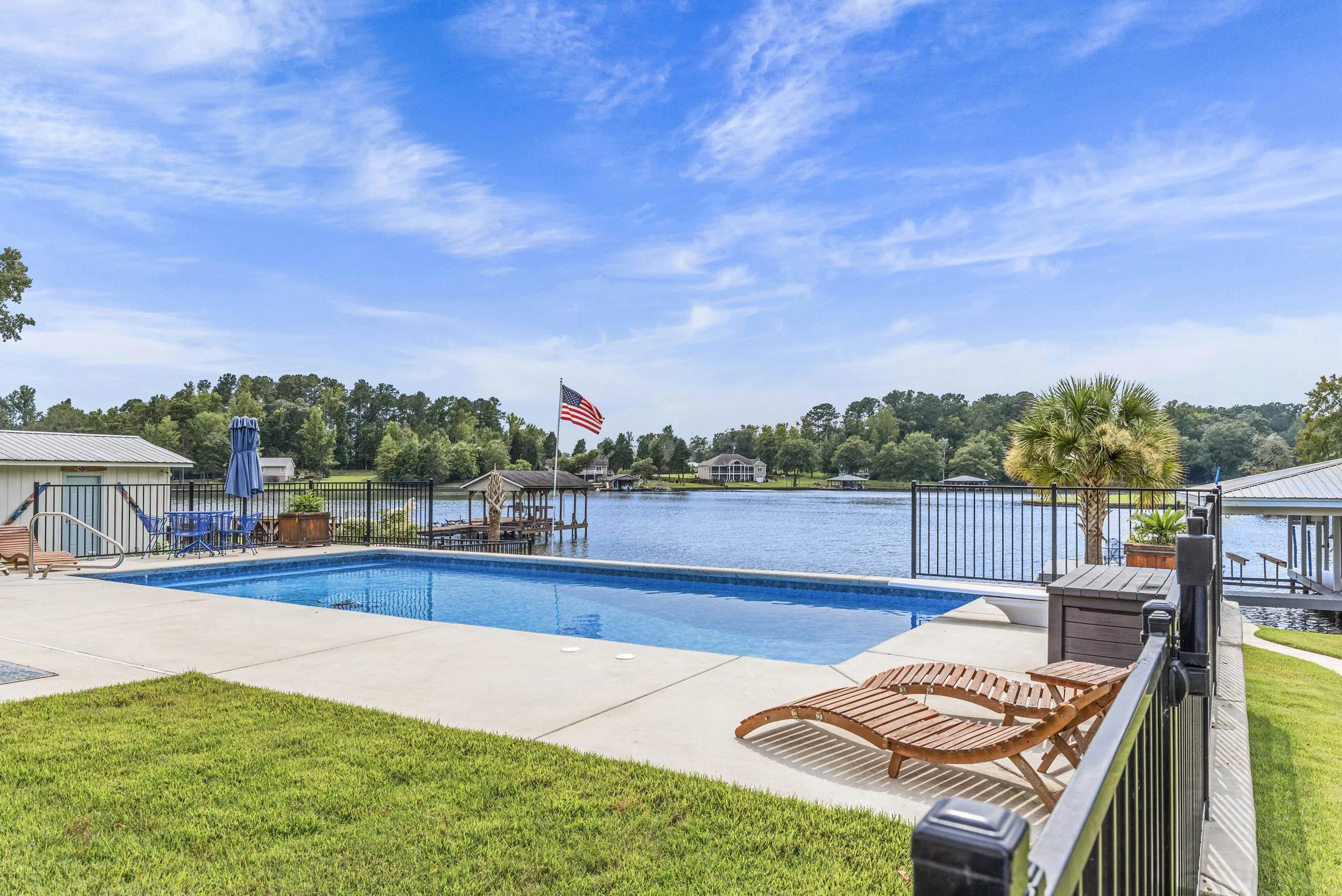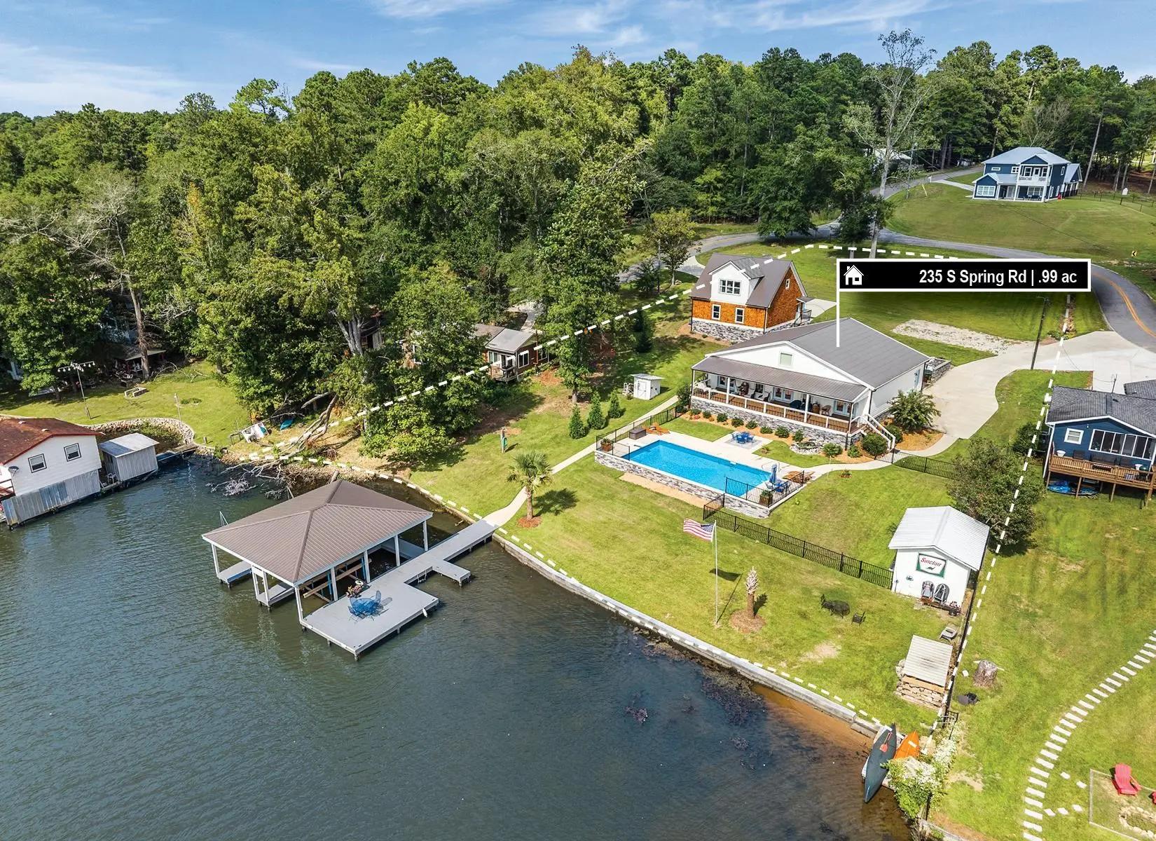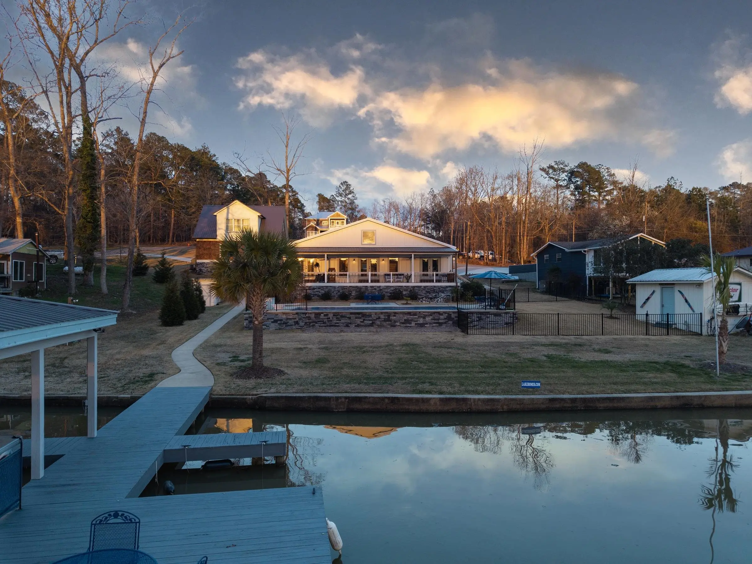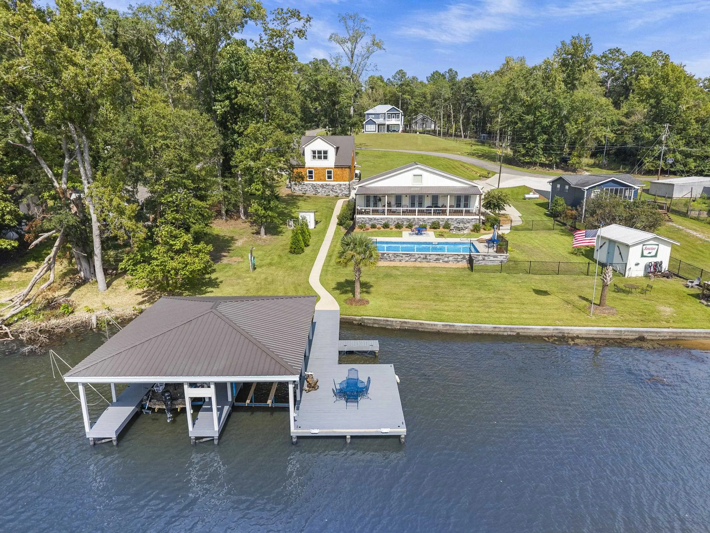 THIS ONE HAS IT ALL! INCREDIBLE VIEWS, SALTWATER POOL, GUEST COTTAGE AND BEST PORCHES ON THE LAKE! This property screams "FAMILY AND FRIENDS" and can SLEEP 16 COMFORTABLY. Red iron supported steel exterior framing with hardy board siding makes this a structural force to be reckoned with! The main home has 2 PRIMARY SUITES on the MAIN LEVEL plus a 3rd bedroom and a huge OPEN LOFT designed with both play space and sleeping space. Open kitchen plan with quartz and custom quality hickory cabinets- vaulted family room w/hardwood flooring. 2nd pantry with extra storage in laundry room. Ice maker conveys to keep the drinks ice cold! Detached DOUBLE GARAGE with charming upper 1 BR 1 BA COTTAGE with full kitchen and laundry! So cute... and the views from the cottage are the BEST! Outdoor living is unmatched here: the street-side ELEGANT porch (25x50) is a go-to gathering spot for family gatherings and meals - seats so many! The lake-side porch (10x50) spans the home, overlooking the saltwater pool and level lot. Stocked Koi pond. DOUBLE BOATHOUSE will knock your socks off! Small man cave outbuilding is an extra bonus. Great WATER FRONTAGE, great VIEW, great LOCATION and all the makings for the perfect family gathering place! Fee simple.