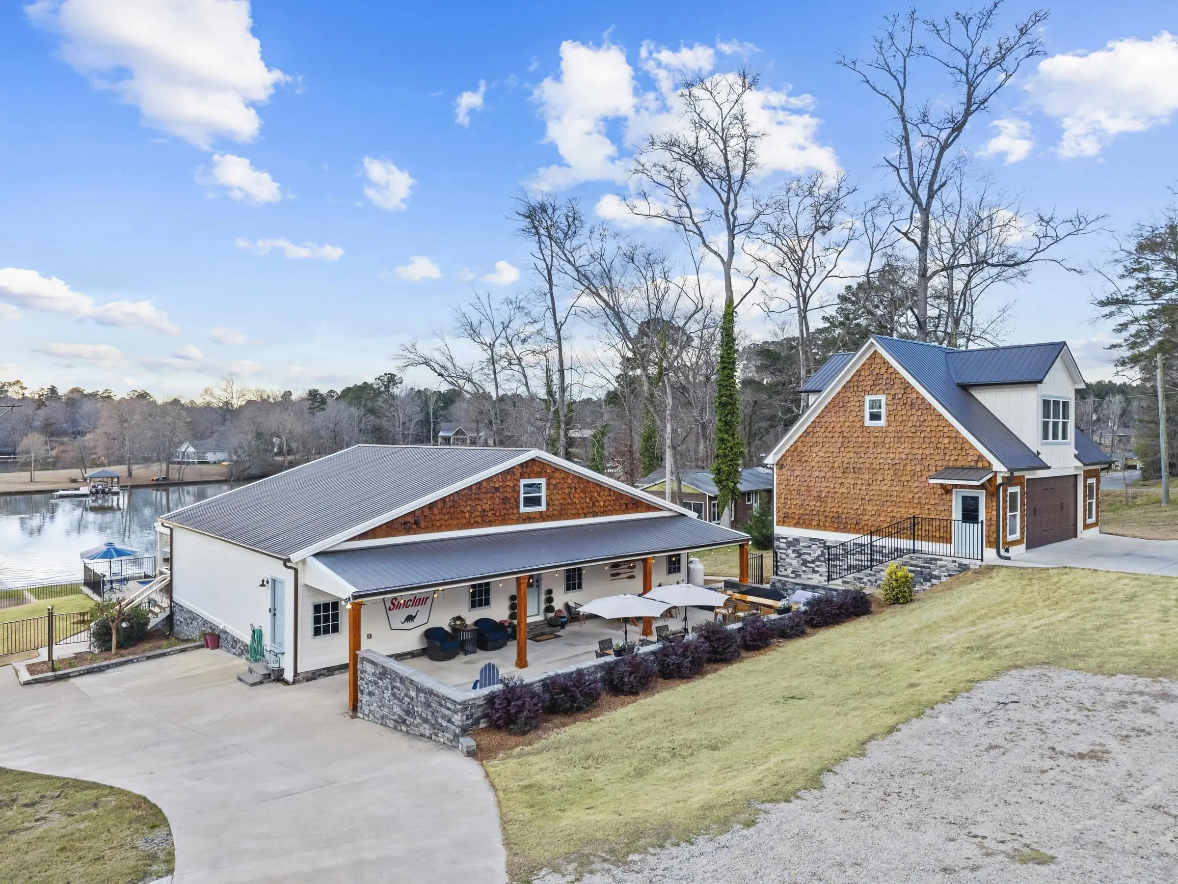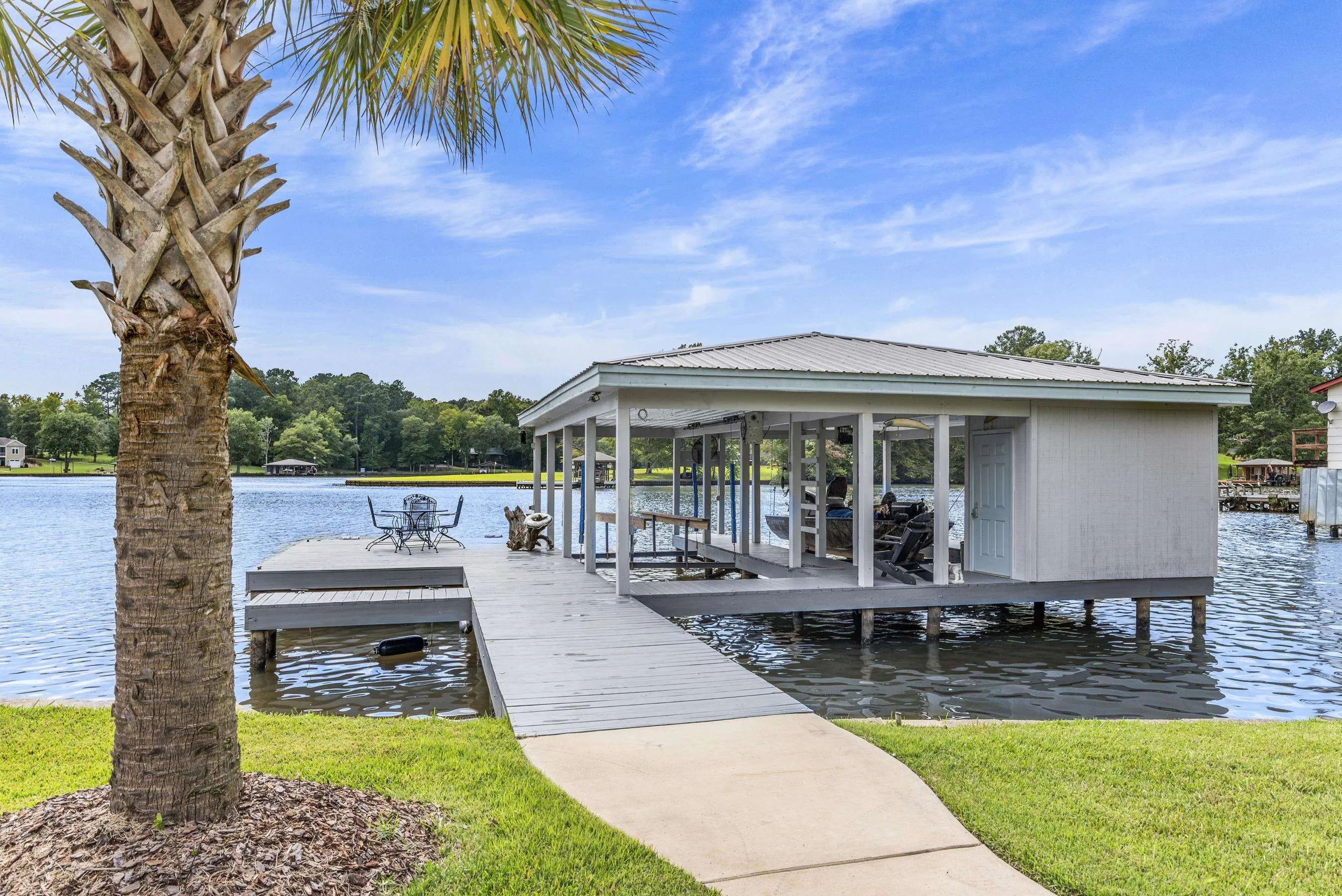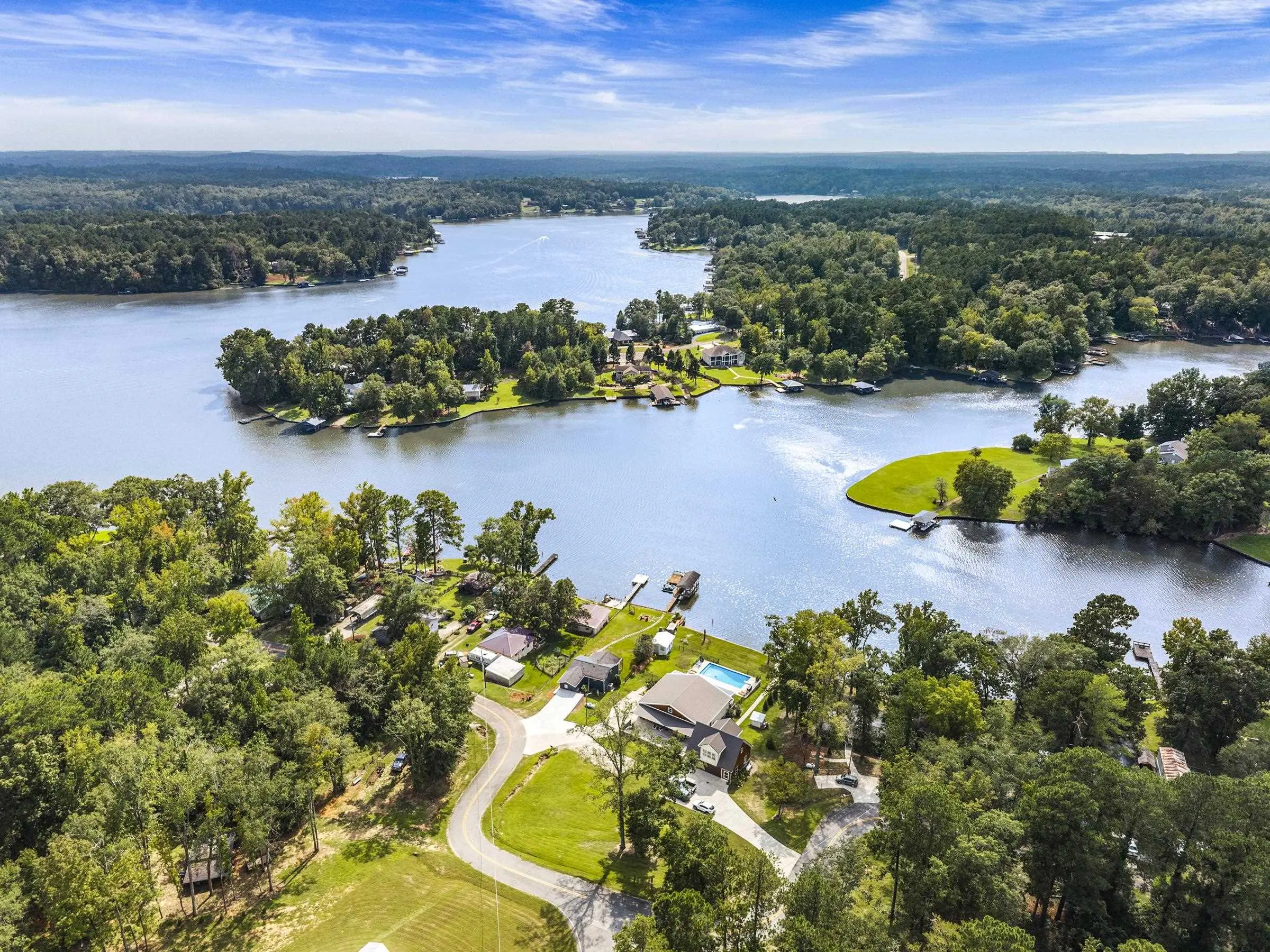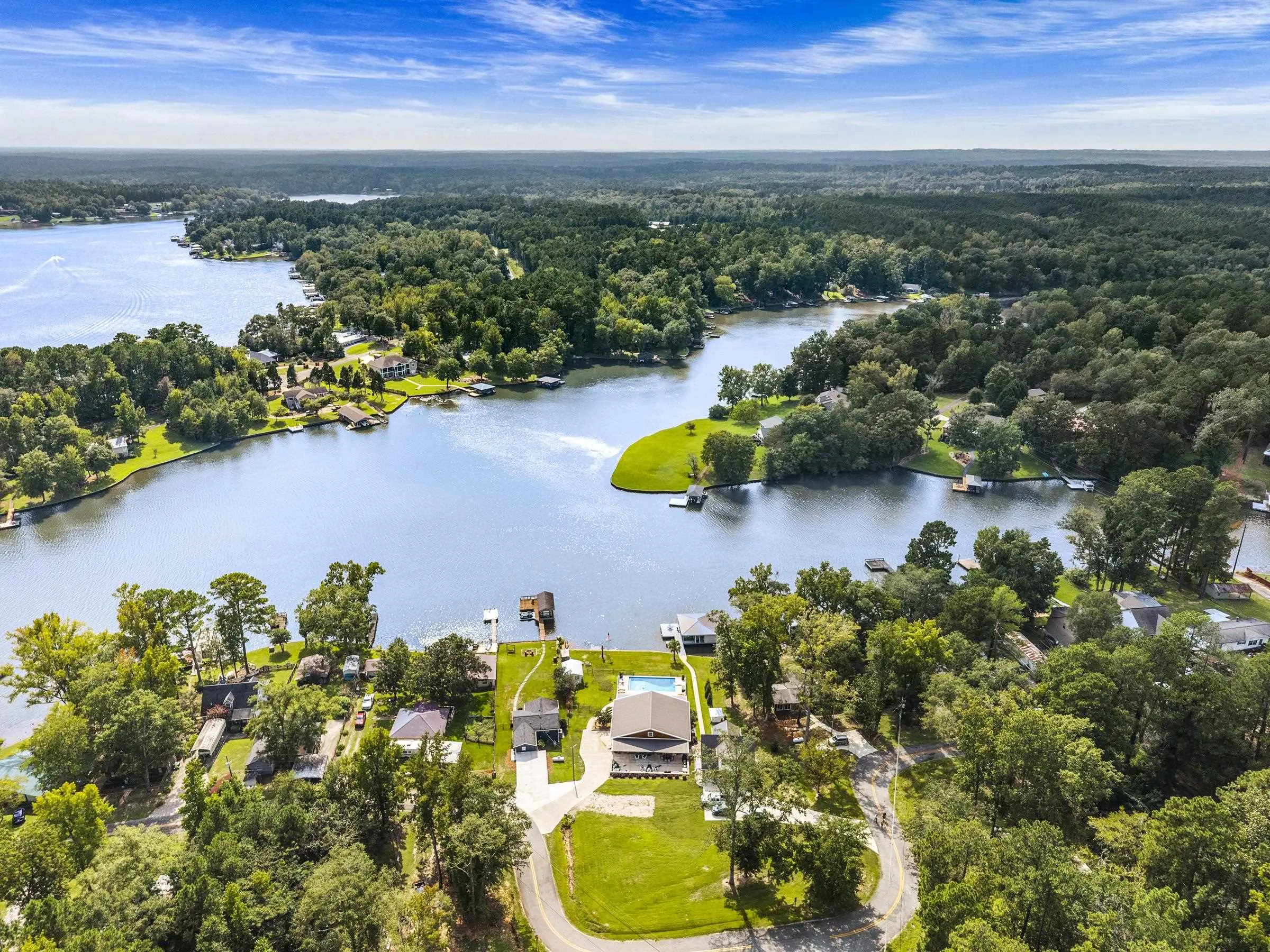 THIS ONE HAS IT ALL! INCREDIBLE VIEWS, SALTWATER POOL, GUEST COTTAGE AND BEST PORCHES ON THE LAKE! This property screams "FAMILY AND FRIENDS" and can SLEEP 16 COMFORTABLY. Red iron supported steel exterior framing with hardy board siding makes this a structural force to be reckoned with! The main home has 2 PRIMARY SUITES on the MAIN LEVEL plus a 3rd bedroom and a huge OPEN LOFT designed with both play space and sleeping space. Open kitchen plan with quartz and custom quality hickory cabinets- vaulted family room w/hardwood flooring. 2nd pantry with extra storage in laundry room. Ice maker conveys to keep the drinks ice cold! Detached DOUBLE GARAGE with charming upper 1 BR 1 BA COTTAGE with full kitchen and laundry! So cute... and the views from the cottage are the BEST! Outdoor living is unmatched here: the street-side ELEGANT porch (25x50) is a go-to gathering spot for family gatherings and meals - seats so many! The lake-side porch (10x50) spans the home, overlooking the saltwater pool and level lot. Stocked Koi pond. DOUBLE BOATHOUSE will knock your socks off! Small man cave outbuilding is an extra bonus. Great WATER FRONTAGE, great VIEW, great LOCATION and all the makings for the perfect family gathering place! Fee simple.