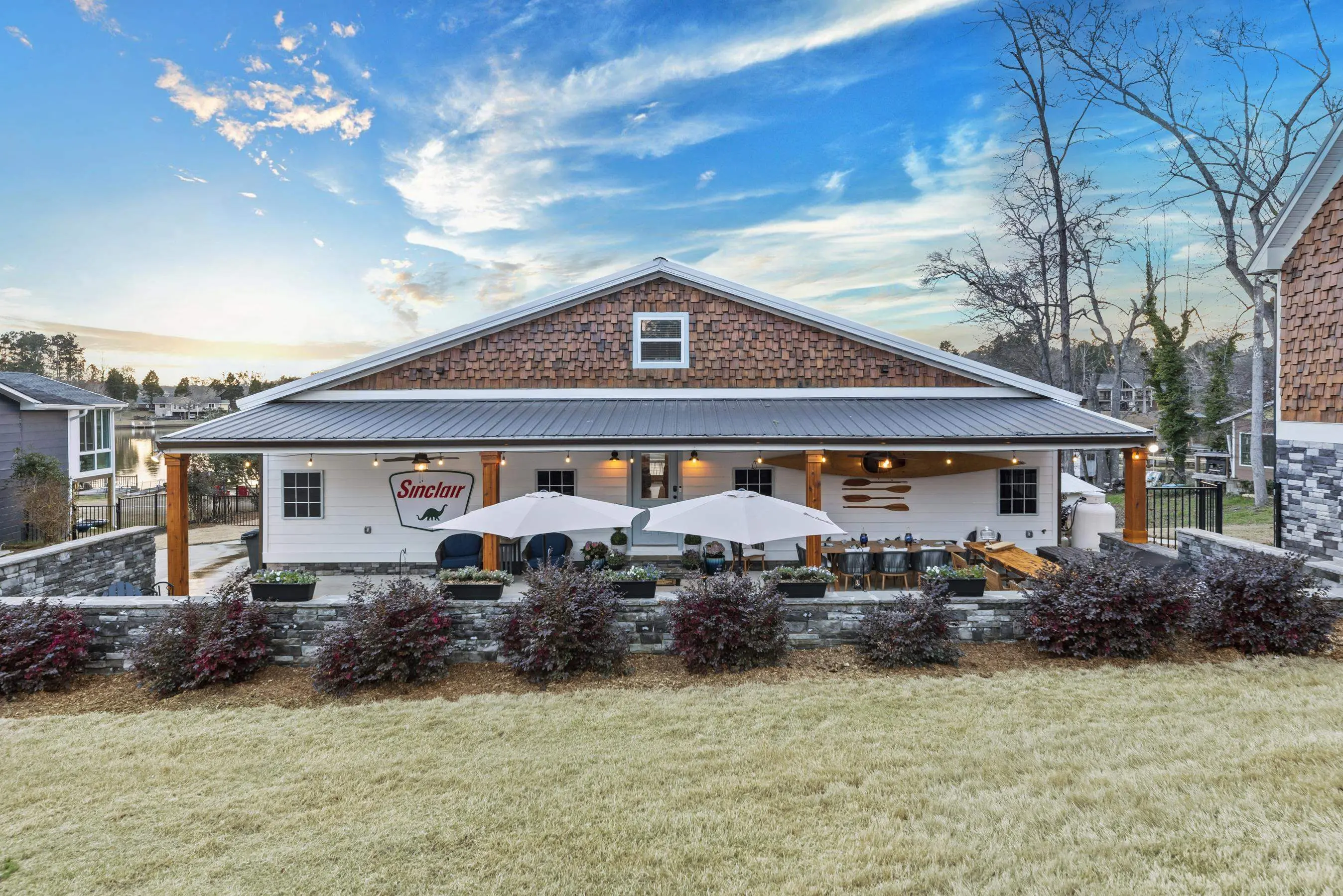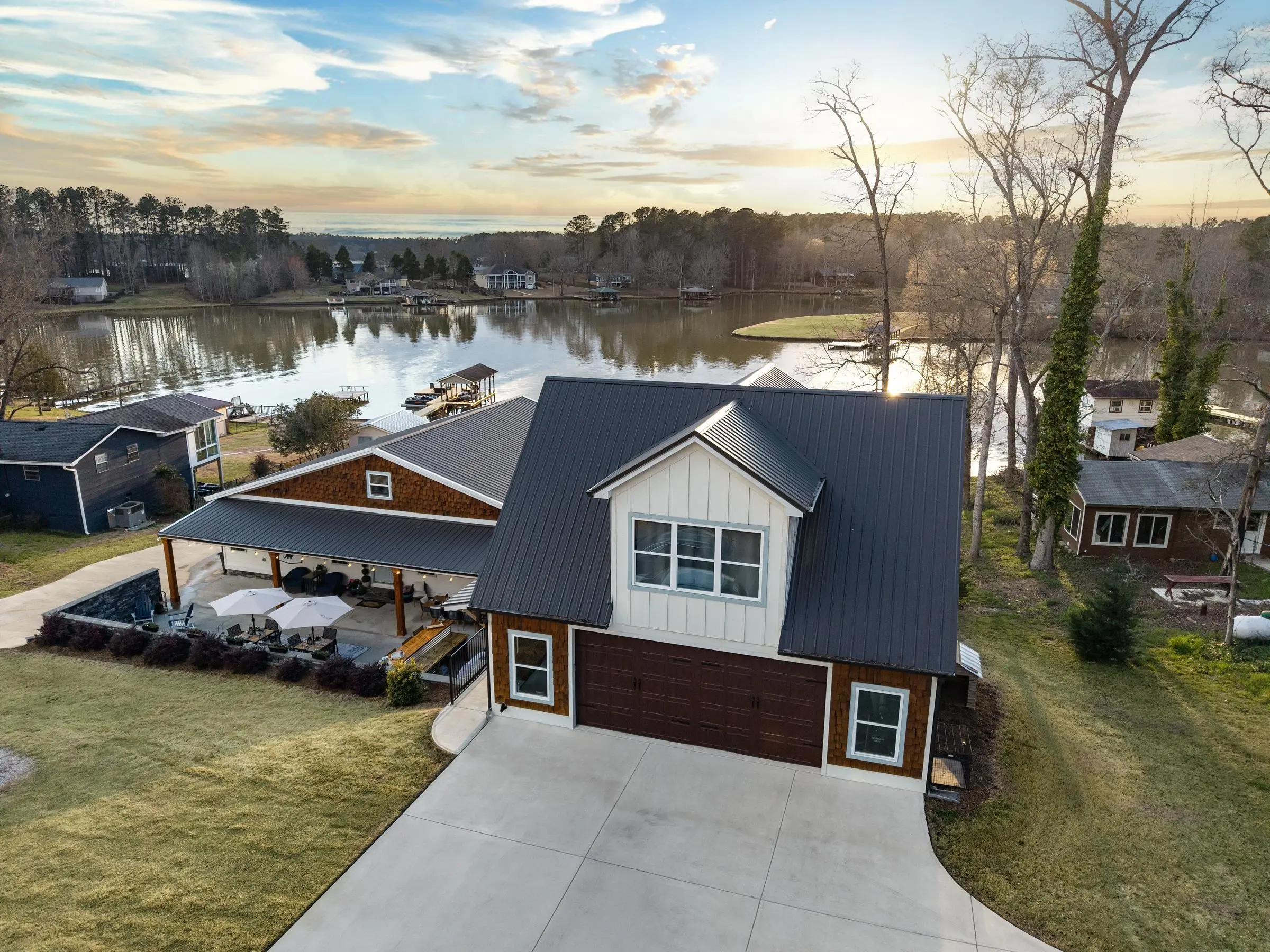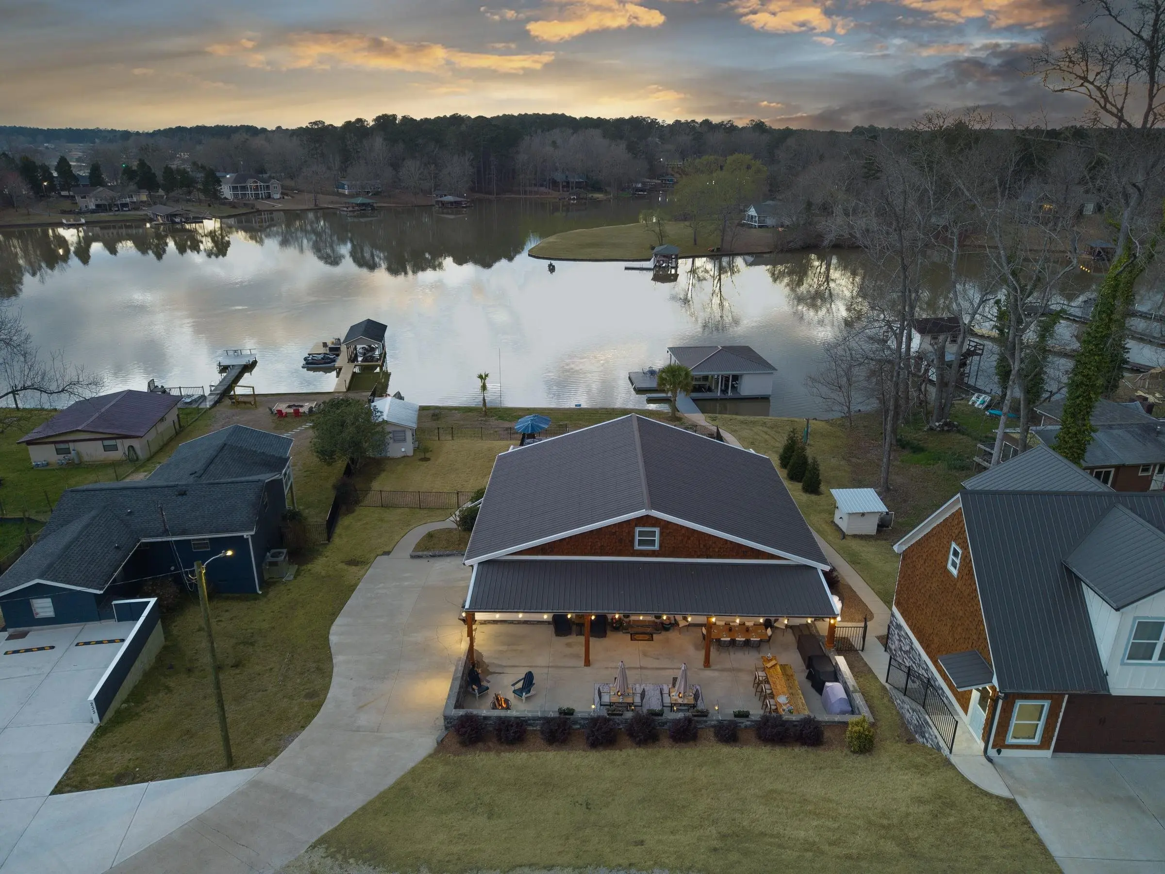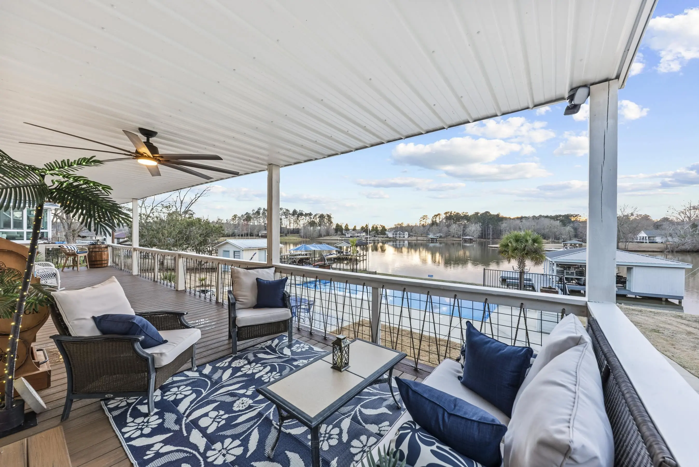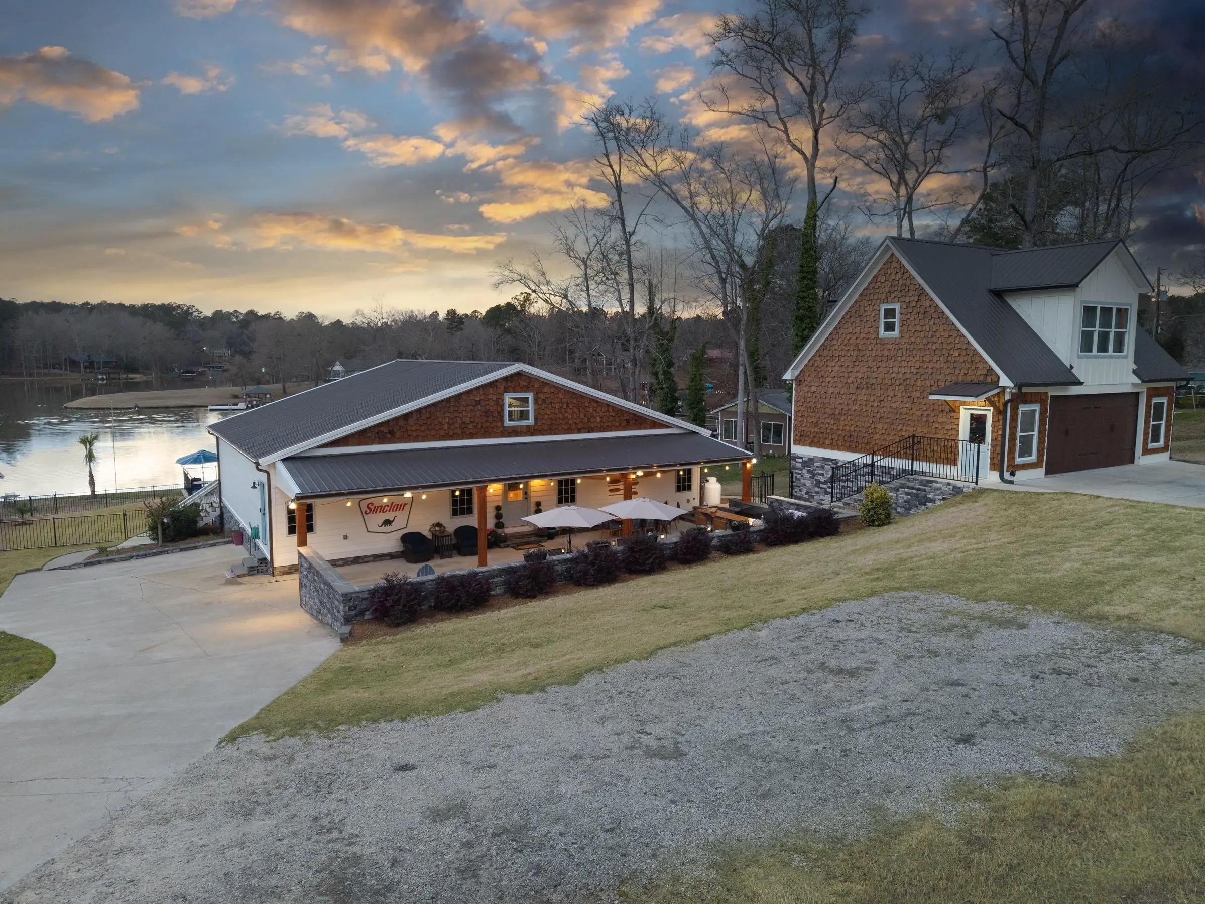 THIS ONE HAS IT ALL! INCREDIBLE VIEWS, SALTWATER POOL, GUEST COTTAGE AND BEST PORCHES ON THE LAKE! This property screams "FAMILY AND FRIENDS" and can SLEEP 16 COMFORTABLY. Red iron supported steel exterior framing with hardy board siding makes this a structural force to be reckoned with! The main home has 2 PRIMARY SUITES on the MAIN LEVEL plus a 3rd bedroom and a huge OPEN LOFT designed with both play space and sleeping space. Open kitchen plan with quartz and custom quality hickory cabinets- vaulted family room w/hardwood flooring. 2nd pantry with extra storage in laundry room. Ice maker conveys to keep the drinks ice cold! Detached DOUBLE GARAGE with charming upper 1 BR 1 BA COTTAGE with full kitchen and laundry! So cute... and the views from the cottage are the BEST! Outdoor living is unmatched here: the street-side ELEGANT porch (25x50) is a go-to gathering spot for family gatherings and meals - seats so many! The lake-side porch (10x50) spans the home, overlooking the saltwater pool and level lot. Stocked Koi pond. DOUBLE BOATHOUSE will knock your socks off! Small man cave outbuilding is an extra bonus. Great WATER FRONTAGE, great VIEW, great LOCATION and all the makings for the perfect family gathering place! Fee simple.