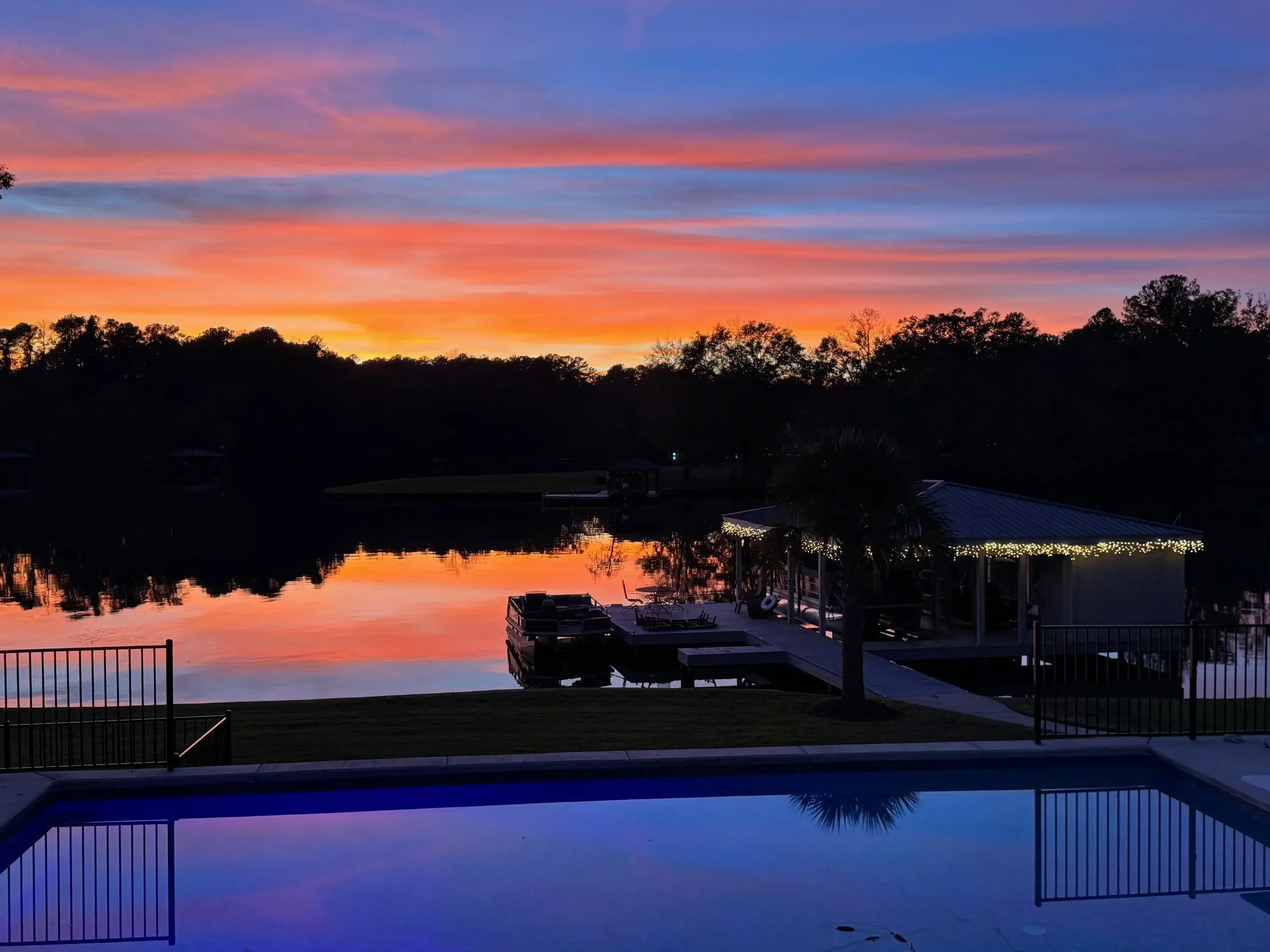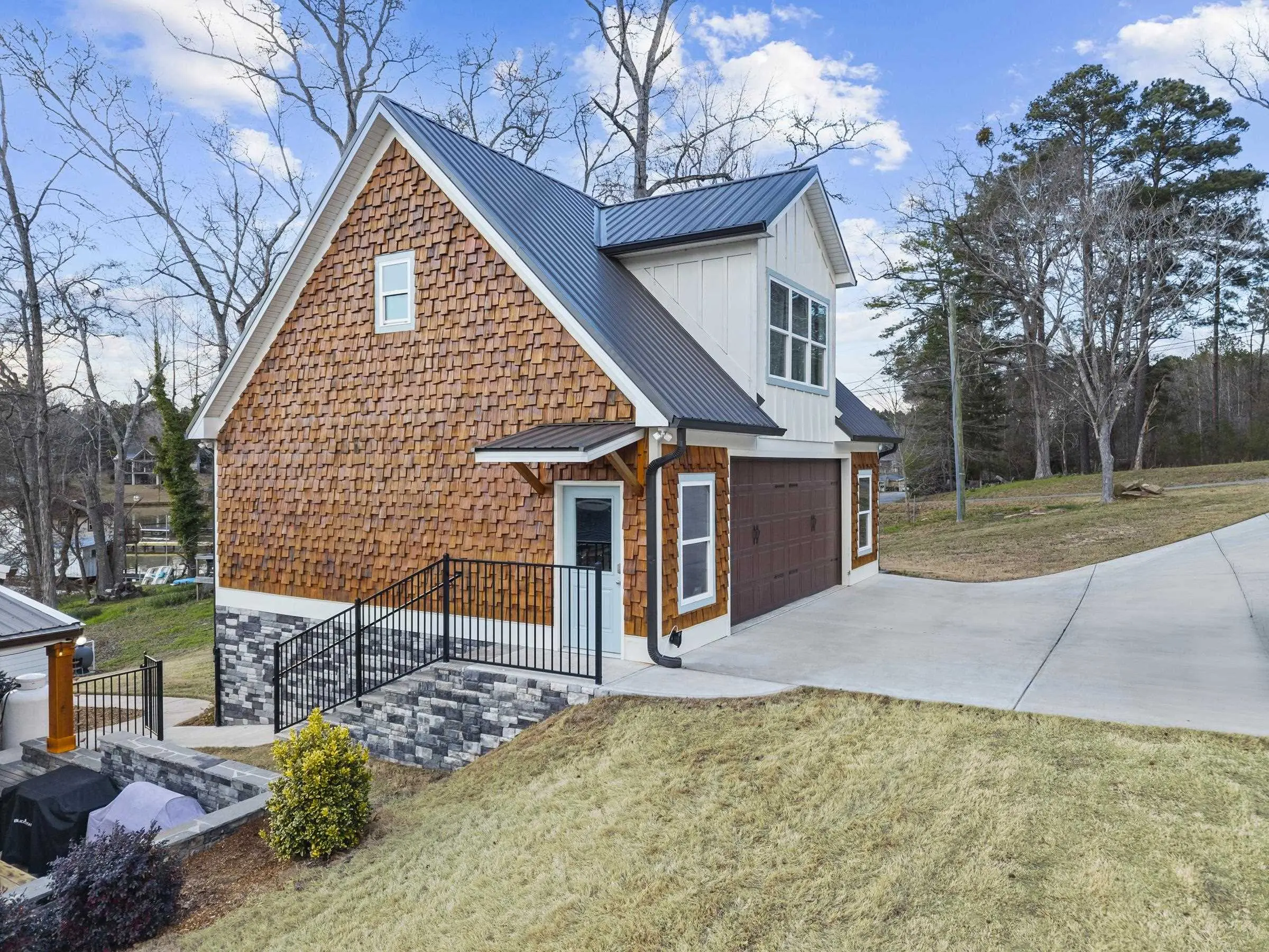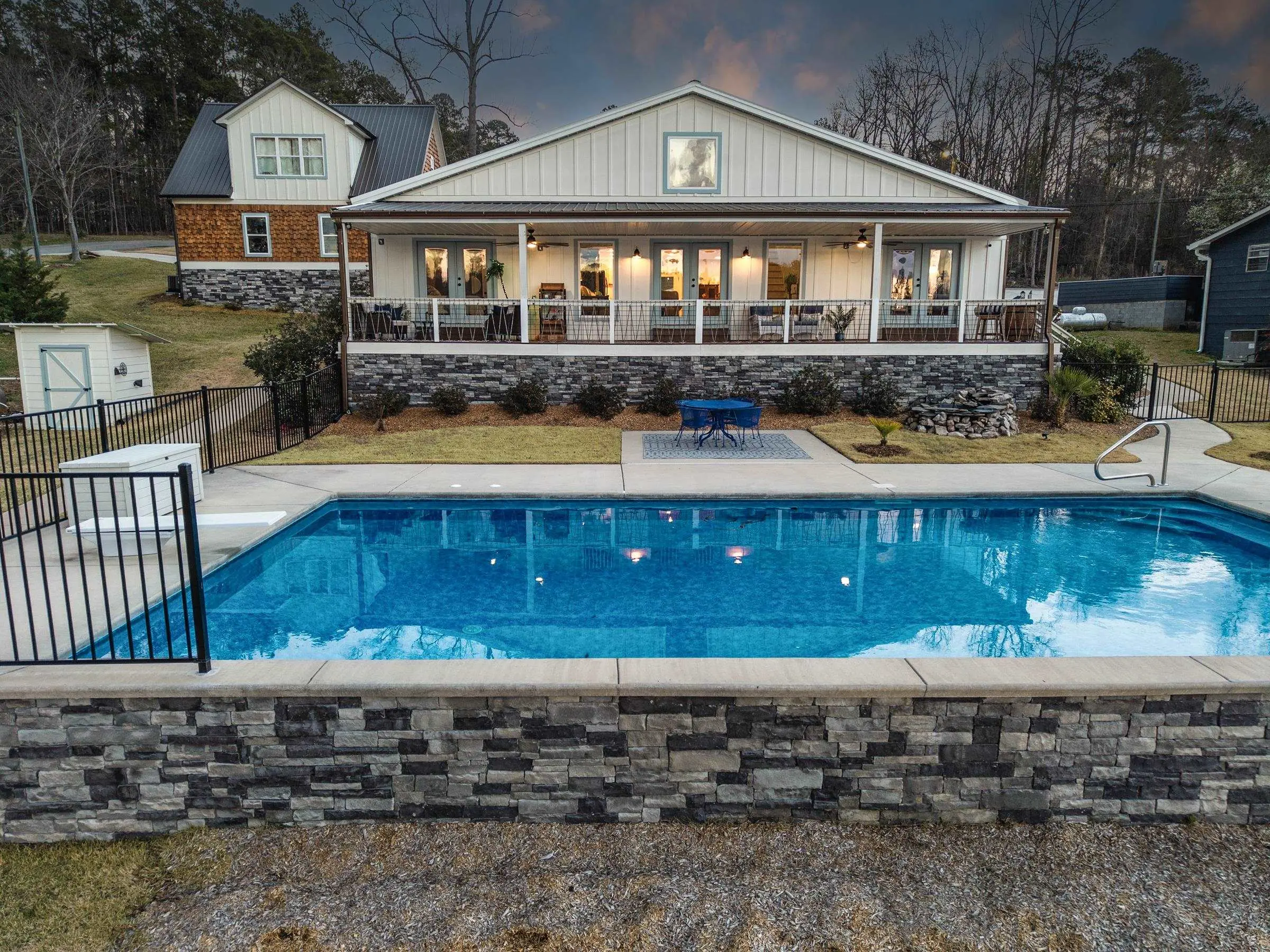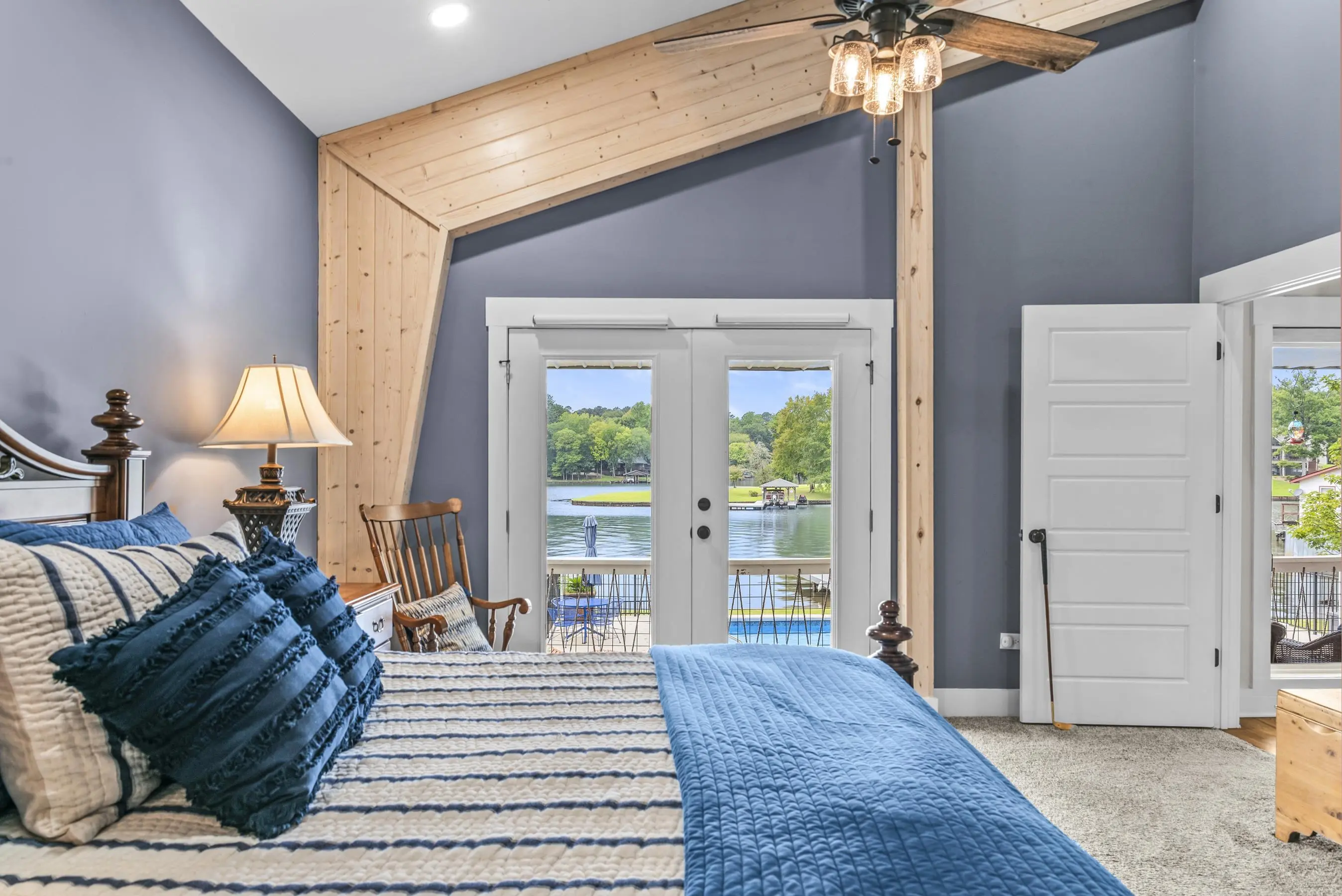 THIS ONE HAS IT ALL! INCREDIBLE VIEWS, SALTWATER POOL, GUEST COTTAGE AND BEST PORCHES ON THE LAKE! This property screams "FAMILY AND FRIENDS" and can SLEEP 16 COMFORTABLY. Red iron supported steel exterior framing with hardy board siding makes this a structural force to be reckoned with! The main home has 2 PRIMARY SUITES on the MAIN LEVEL plus a 3rd bedroom and a huge OPEN LOFT designed with both play space and sleeping space. Open kitchen plan with quartz and custom quality hickory cabinets- vaulted family room w/hardwood flooring. 2nd pantry with extra storage in laundry room. Ice maker conveys to keep the drinks ice cold! Detached DOUBLE GARAGE with charming upper 1 BR 1 BA COTTAGE with full kitchen and laundry! So cute... and the views from the cottage are the BEST! Outdoor living is unmatched here: the street-side ELEGANT porch (25x50) is a go-to gathering spot for family gatherings and meals - seats so many! The lake-side porch (10x50) spans the home, overlooking the saltwater pool and level lot. Stocked Koi pond. DOUBLE BOATHOUSE will knock your socks off! Small man cave outbuilding is an extra bonus. Great WATER FRONTAGE, great VIEW, great LOCATION and all the makings for the perfect family gathering place! Fee simple.