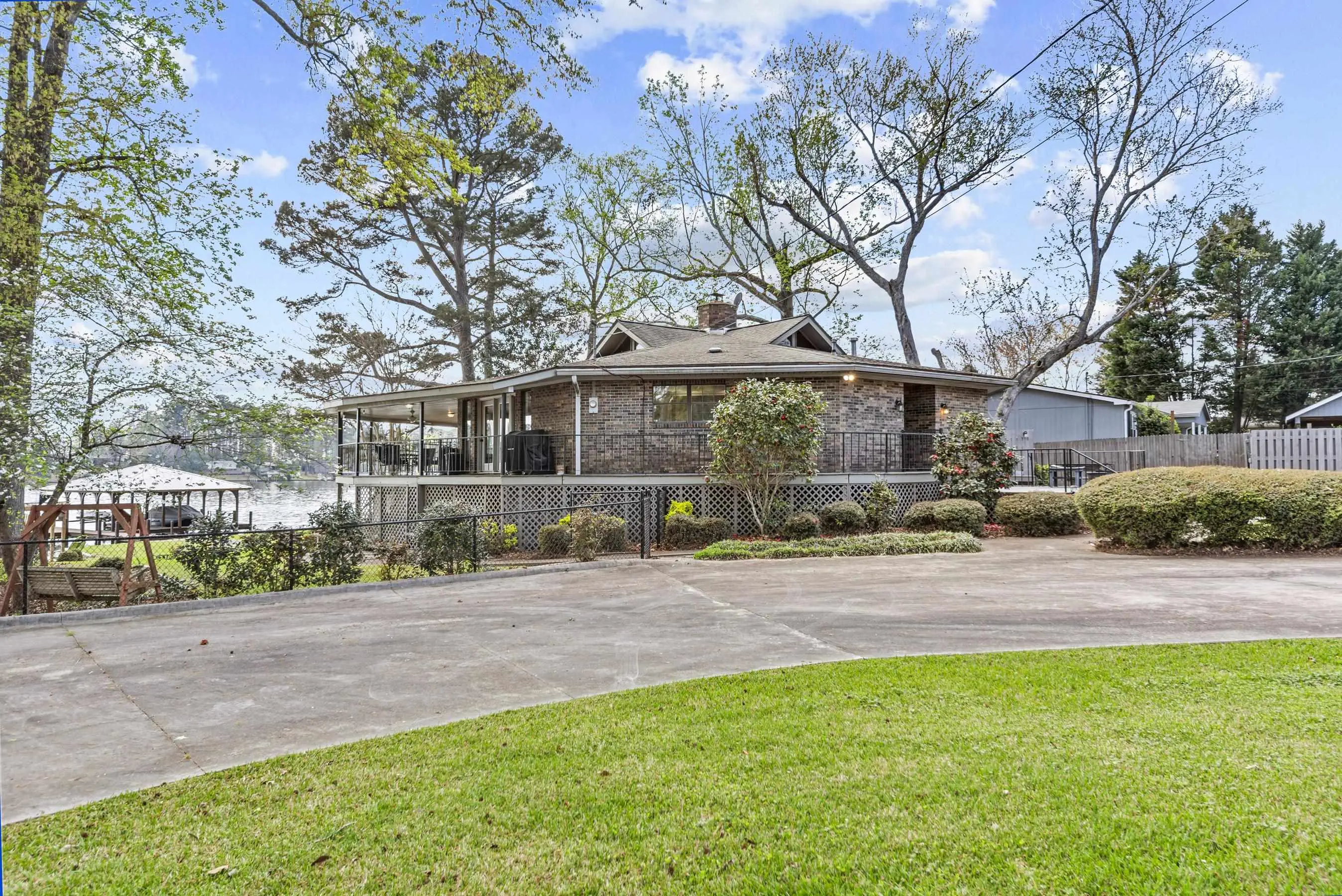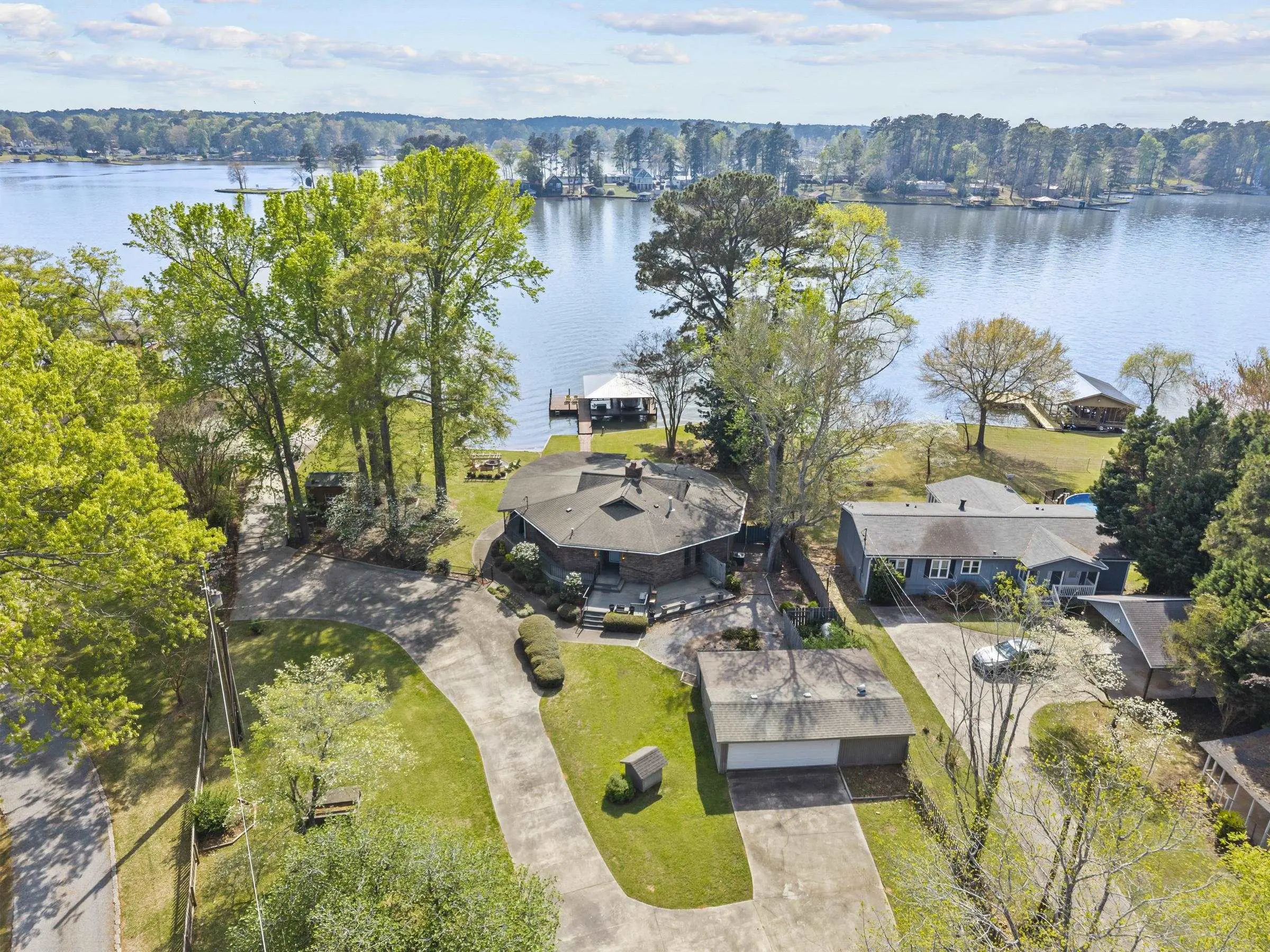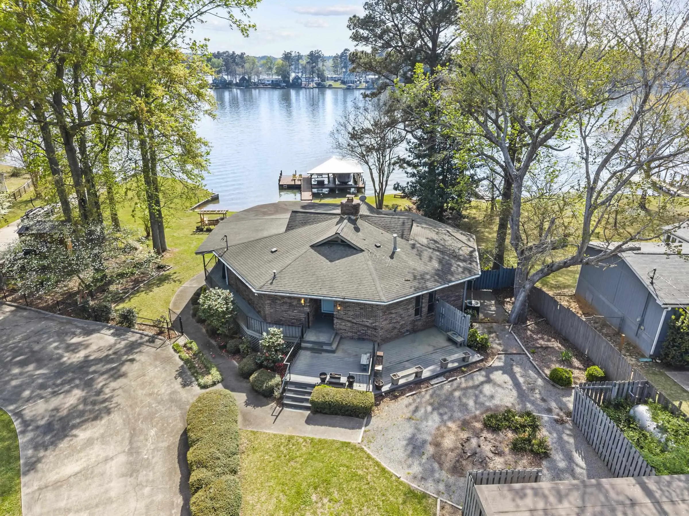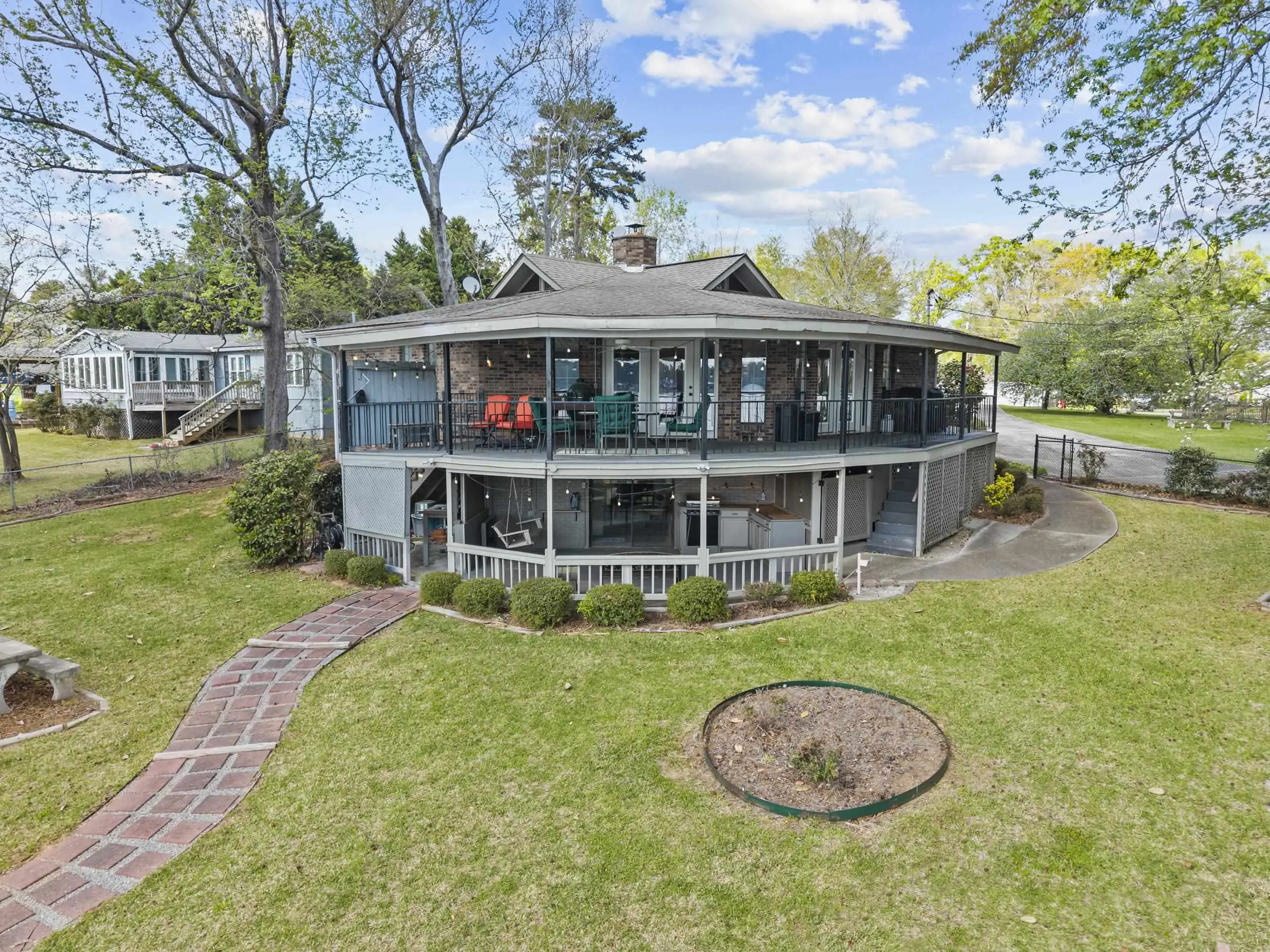 Fabulous Lake Sinclair offering with BEST LOCATION and BIG VIEWS! One of a kind OCTAGONAL HOME on one of the MOST SOUGHT AFTER STREETS on Lake Sinclair! 3 bedrooms, 3 full baths on main level provide great functionality and FUN with extra flex spillover space on terrace level. Octagonal ceiling with rich architectural woodwork sets this home apart. Circular stacked stone gas fireplace is the centerpiece of the home emitting warmth and charm. Updated open kitchen with plenty of storage - pantry and laundry room on main. Wrap around porch with panoramic views from every angle. Perfect pie shaped lot with abundance of lake frontage. Natural sandy beach, fabulous double boathouse and boat ramp gives the ultimate lake shoreline experience. Outbuilding with electricity and a double detached garage that could be used for workshop, storage etc. Located in cul de sac of the best location possible by land and by water! Concrete low maintenance seawall - Wonderful expansive yard with established landscaping - Fee simple.
