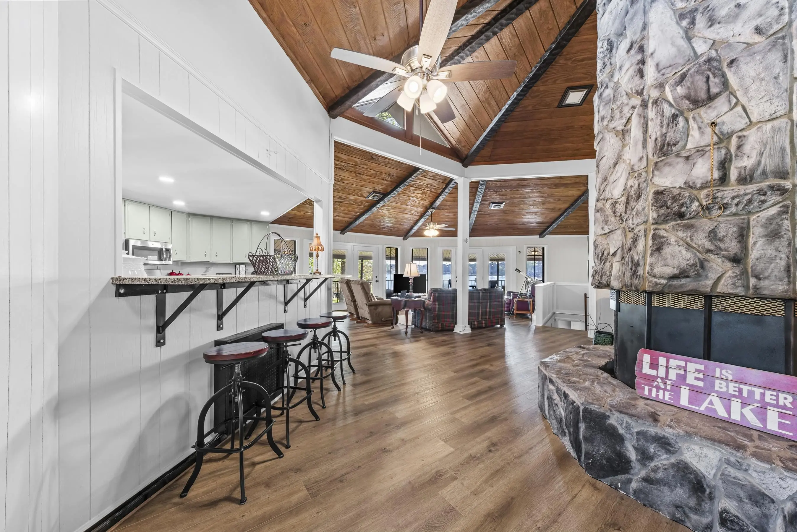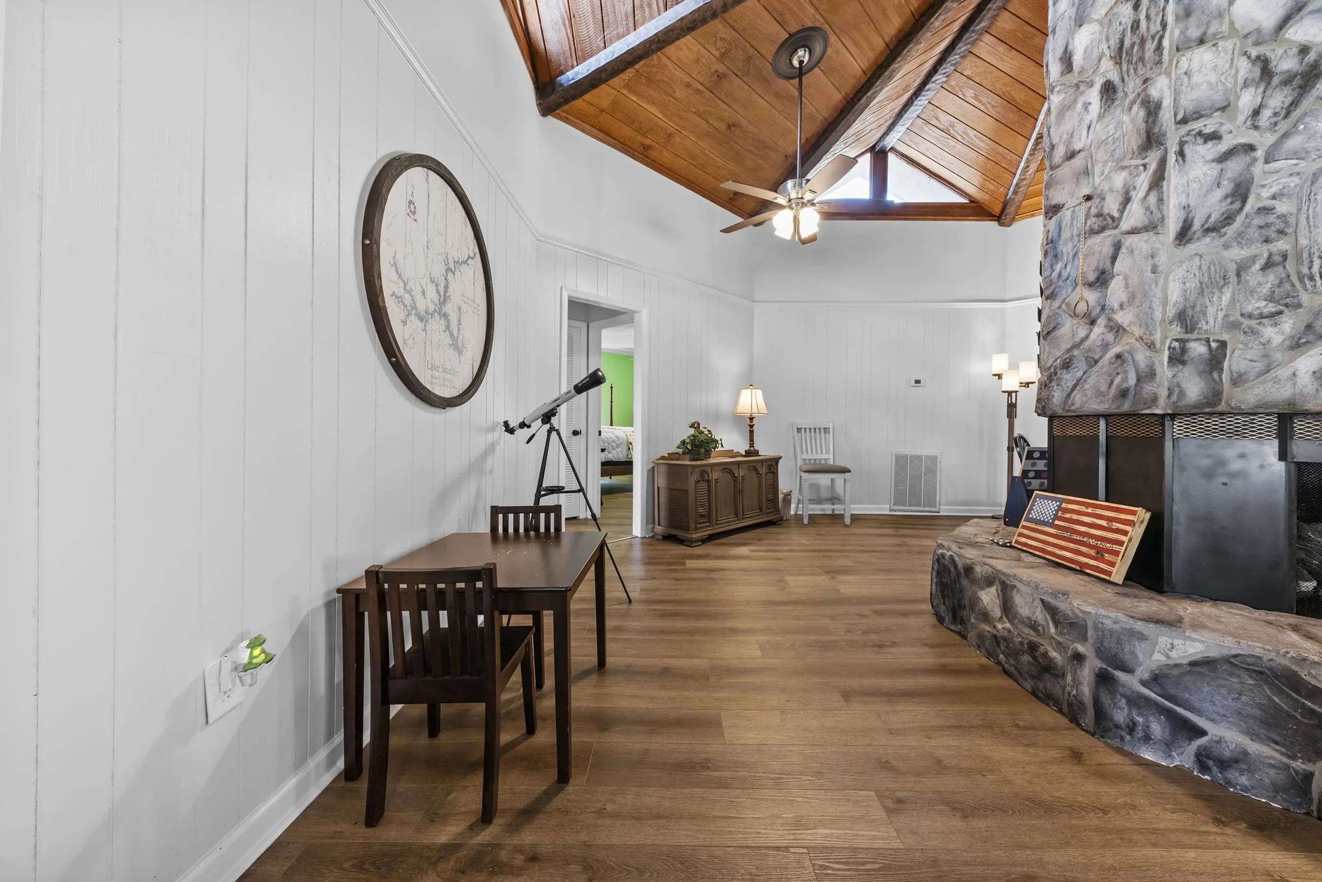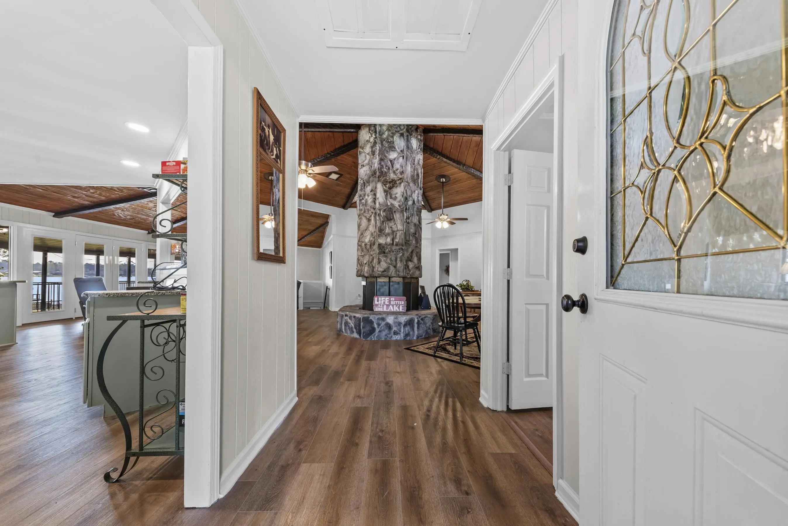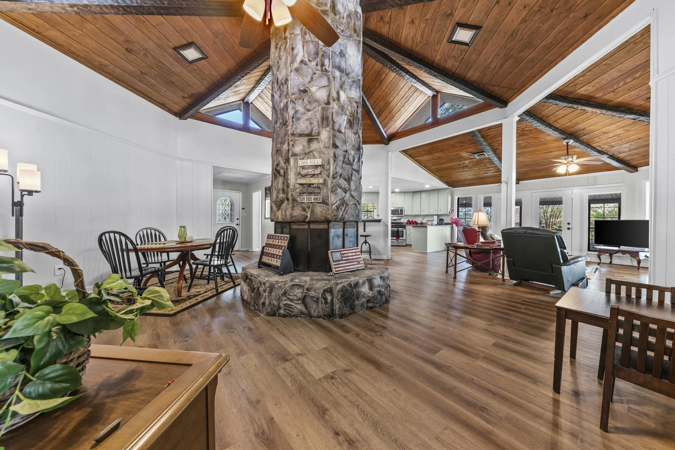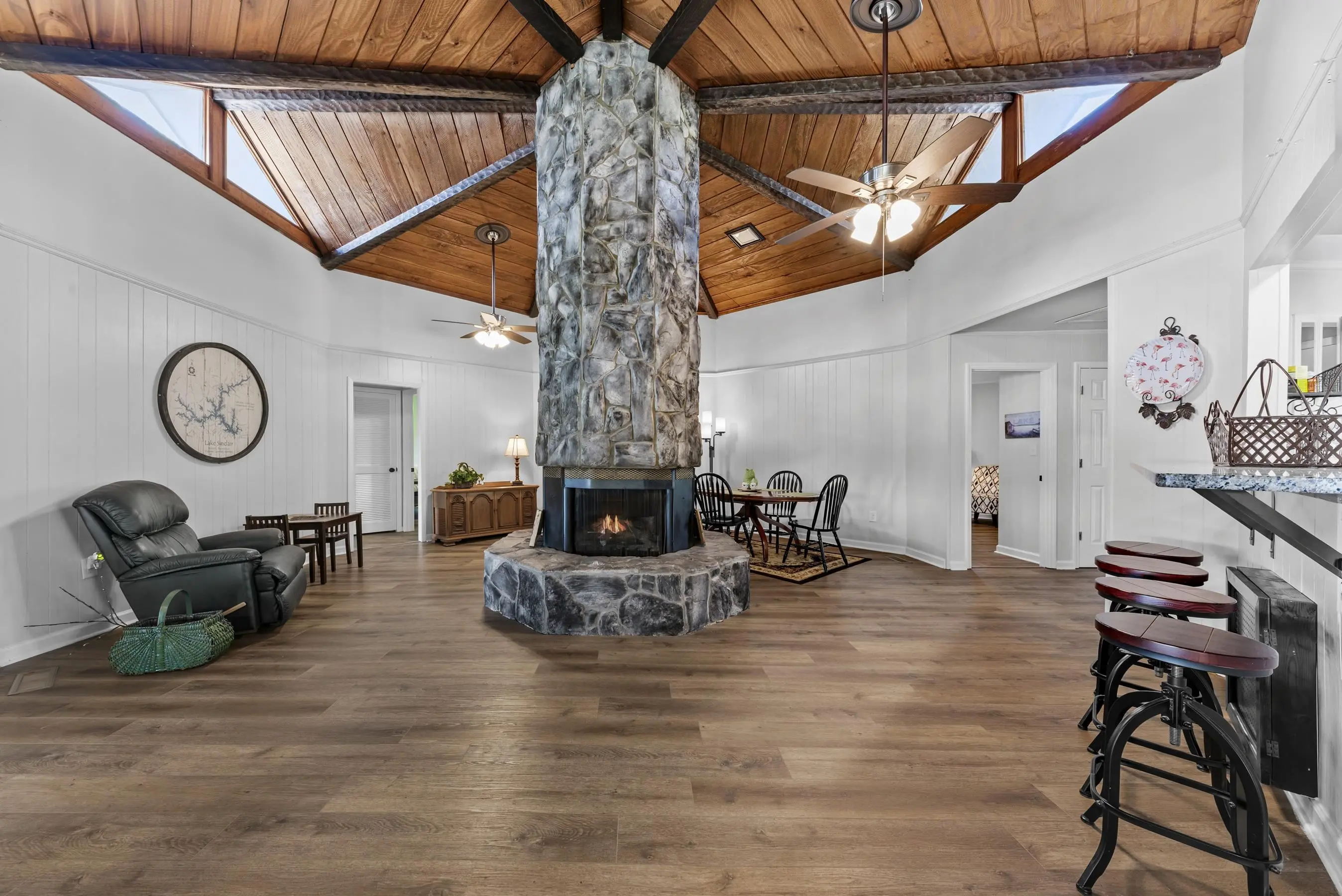 Fabulous Lake Sinclair offering with BEST LOCATION and BIG VIEWS! One of a kind OCTAGONAL HOME on one of the MOST SOUGHT AFTER STREETS on Lake Sinclair! 3 bedrooms, 3 full baths on main level provide great functionality and FUN with extra flex spillover space on terrace level. Octagonal ceiling with rich architectural woodwork sets this home apart. Circular stacked stone gas fireplace is the centerpiece of the home emitting warmth and charm. Updated open kitchen with plenty of storage - pantry and laundry room on main. Wrap around porch with panoramic views from every angle. Perfect pie shaped lot with abundance of lake frontage. Natural sandy beach, fabulous double boathouse and boat ramp gives the ultimate lake shoreline experience. Outbuilding with electricity and a double detached garage that could be used for workshop, storage etc. Located in cul de sac of the best location possible by land and by water! Concrete low maintenance seawall - Wonderful expansive yard with established landscaping - Fee simple.