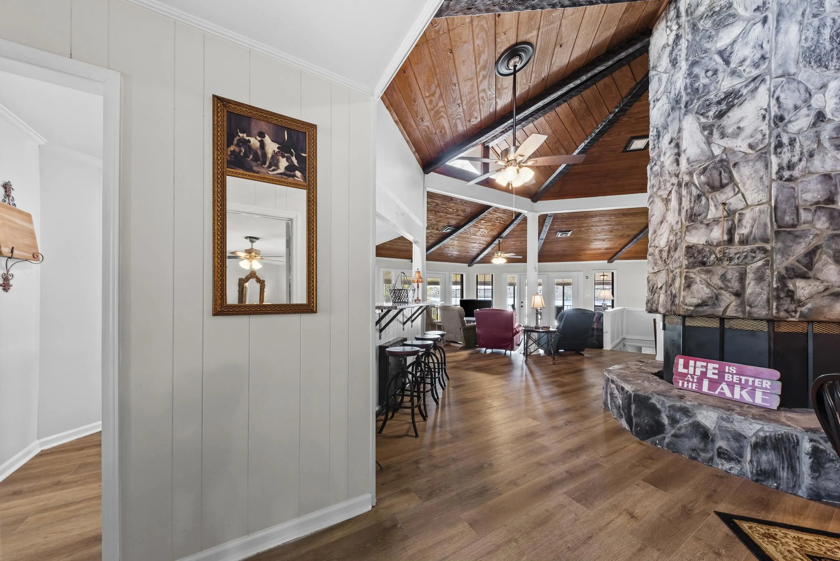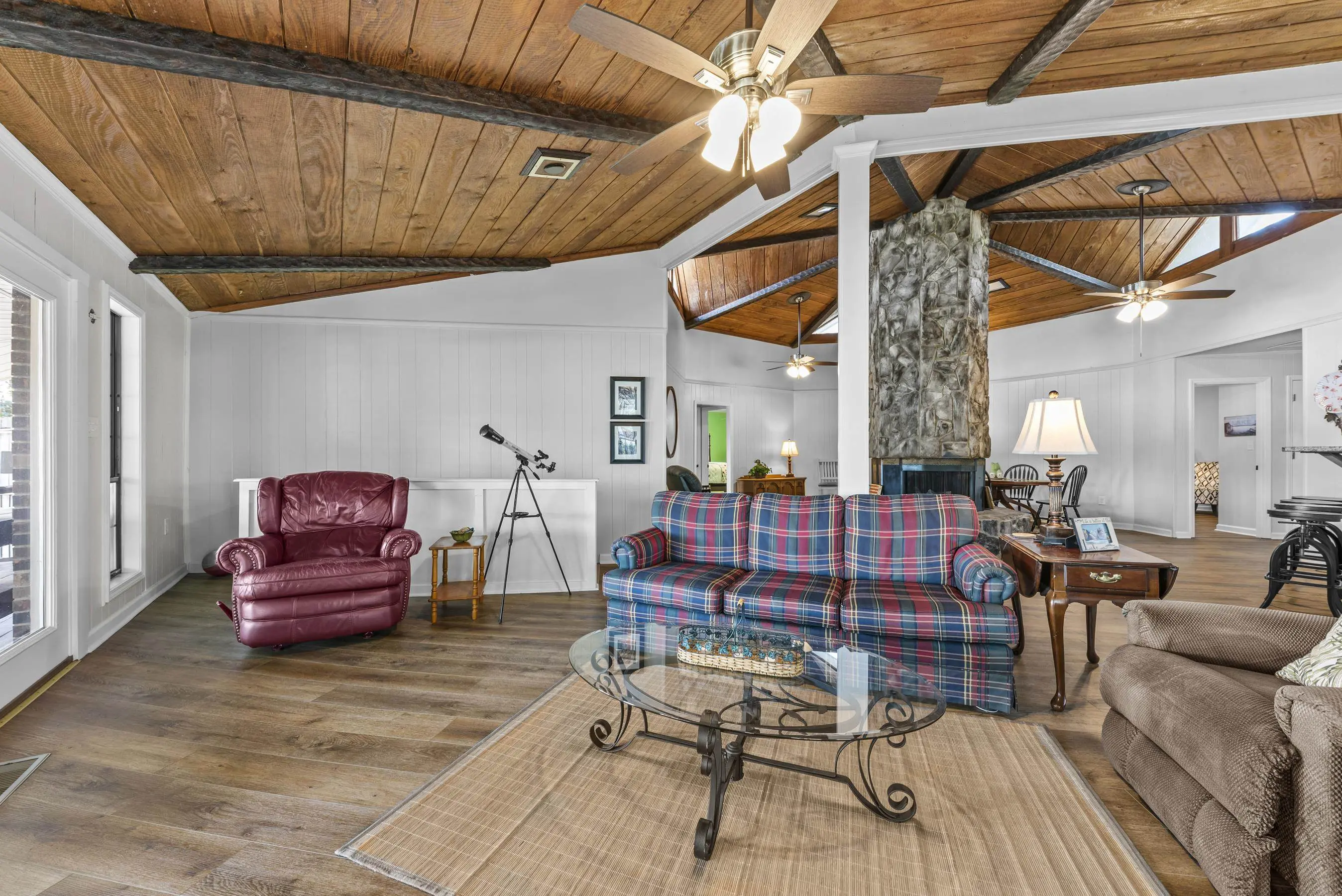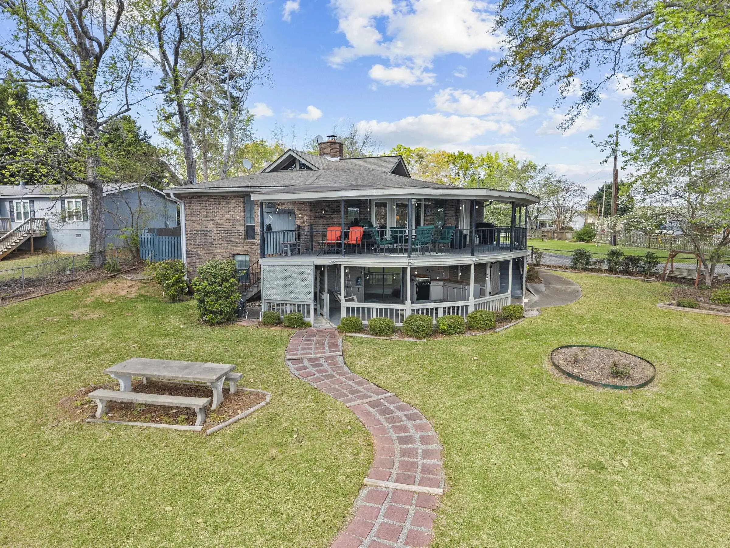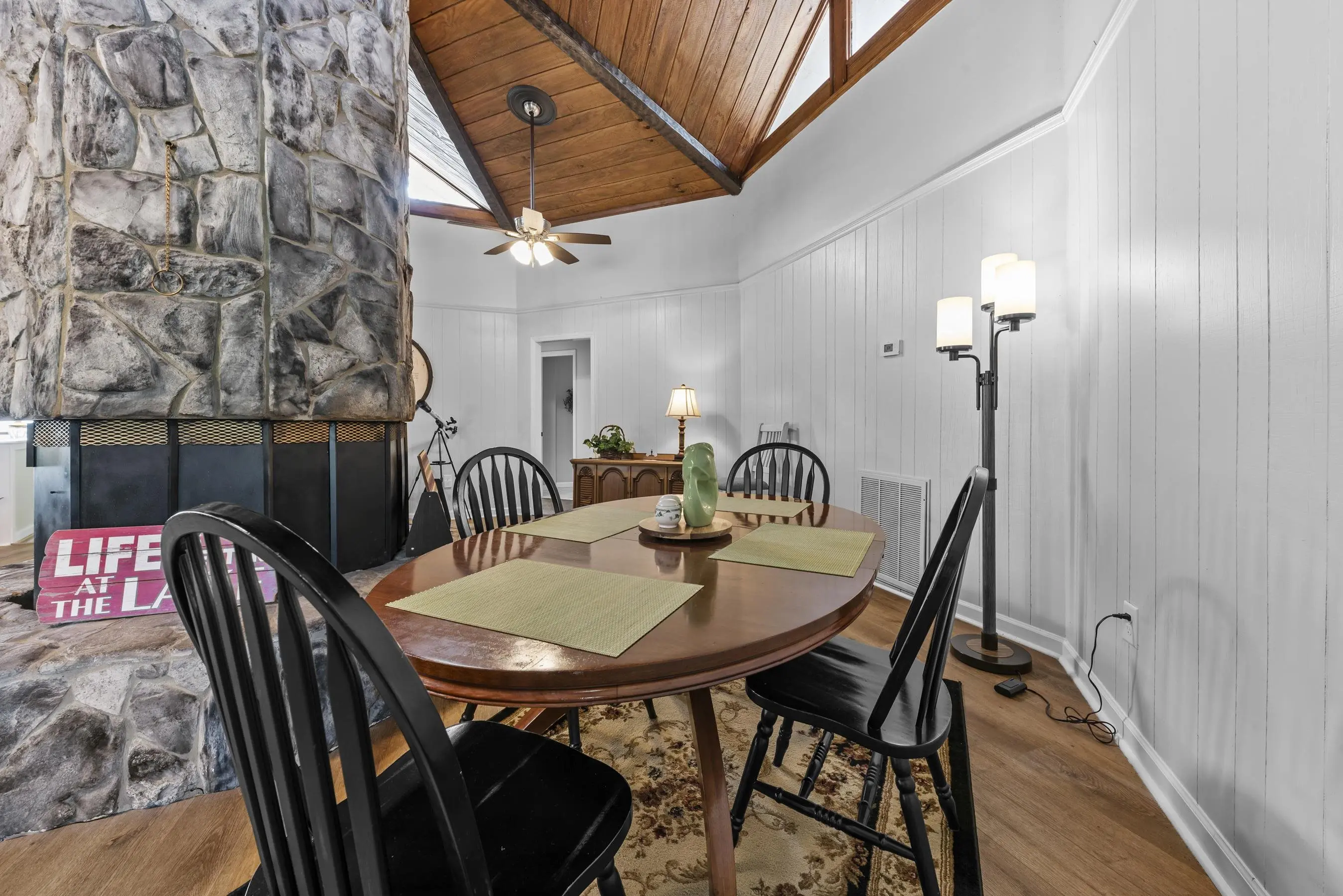 Fabulous Lake Sinclair offering with BEST LOCATION and BIG VIEWS! One of a kind OCTAGONAL HOME on one of the MOST SOUGHT AFTER STREETS on Lake Sinclair! 3 bedrooms, 3 full baths on main level provide great functionality and FUN with extra flex spillover space on terrace level. Octagonal ceiling with rich architectural woodwork sets this home apart. Circular stacked stone gas fireplace is the centerpiece of the home emitting warmth and charm. Updated open kitchen with plenty of storage - pantry and laundry room on main. Wrap around porch with panoramic views from every angle. Perfect pie shaped lot with abundance of lake frontage. Natural sandy beach, fabulous double boathouse and boat ramp gives the ultimate lake shoreline experience. Outbuilding with electricity and a double detached garage that could be used for workshop, storage etc. Located in cul de sac of the best location possible by land and by water! Concrete low maintenance seawall - Wonderful expansive yard with established landscaping - Fee simple.
