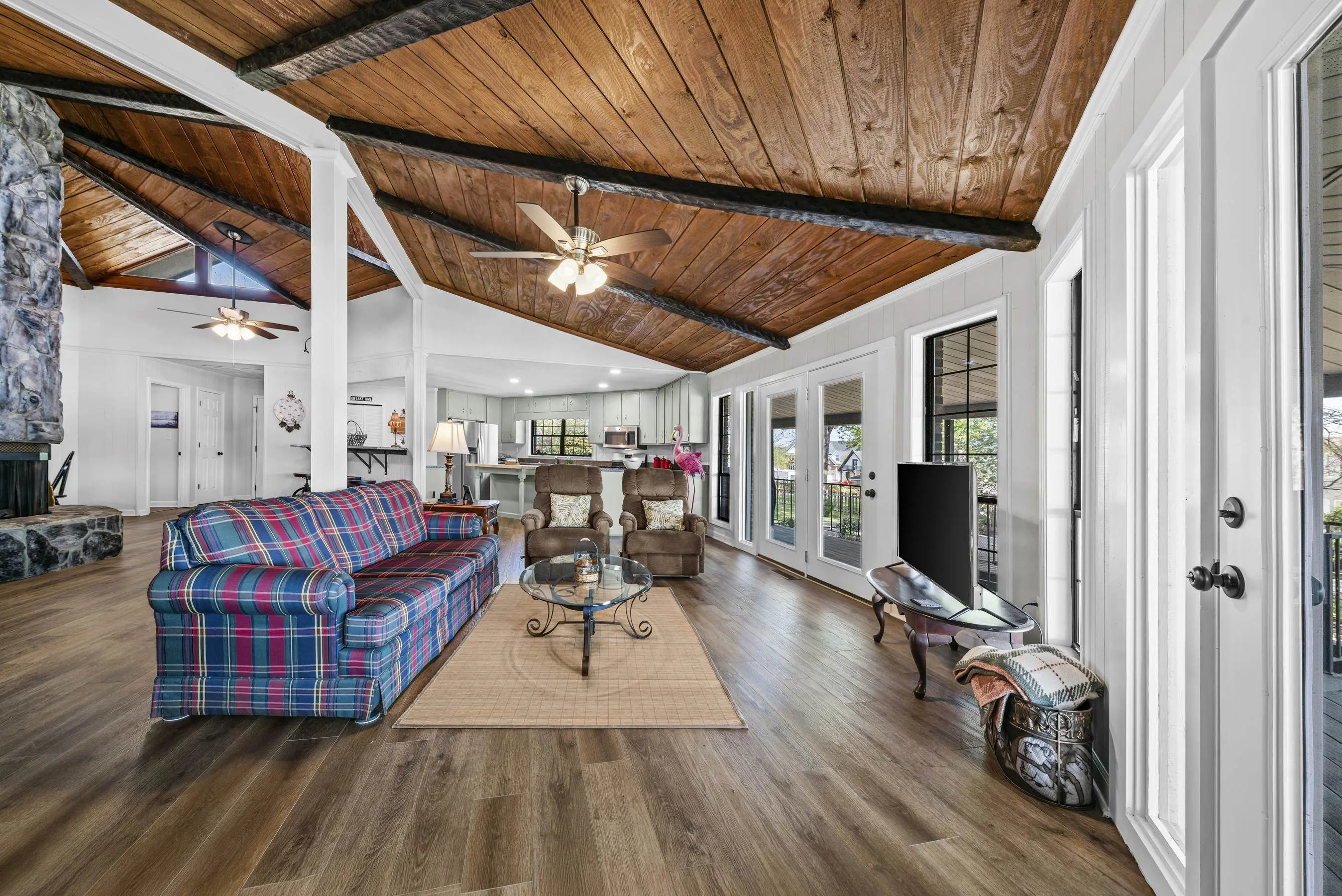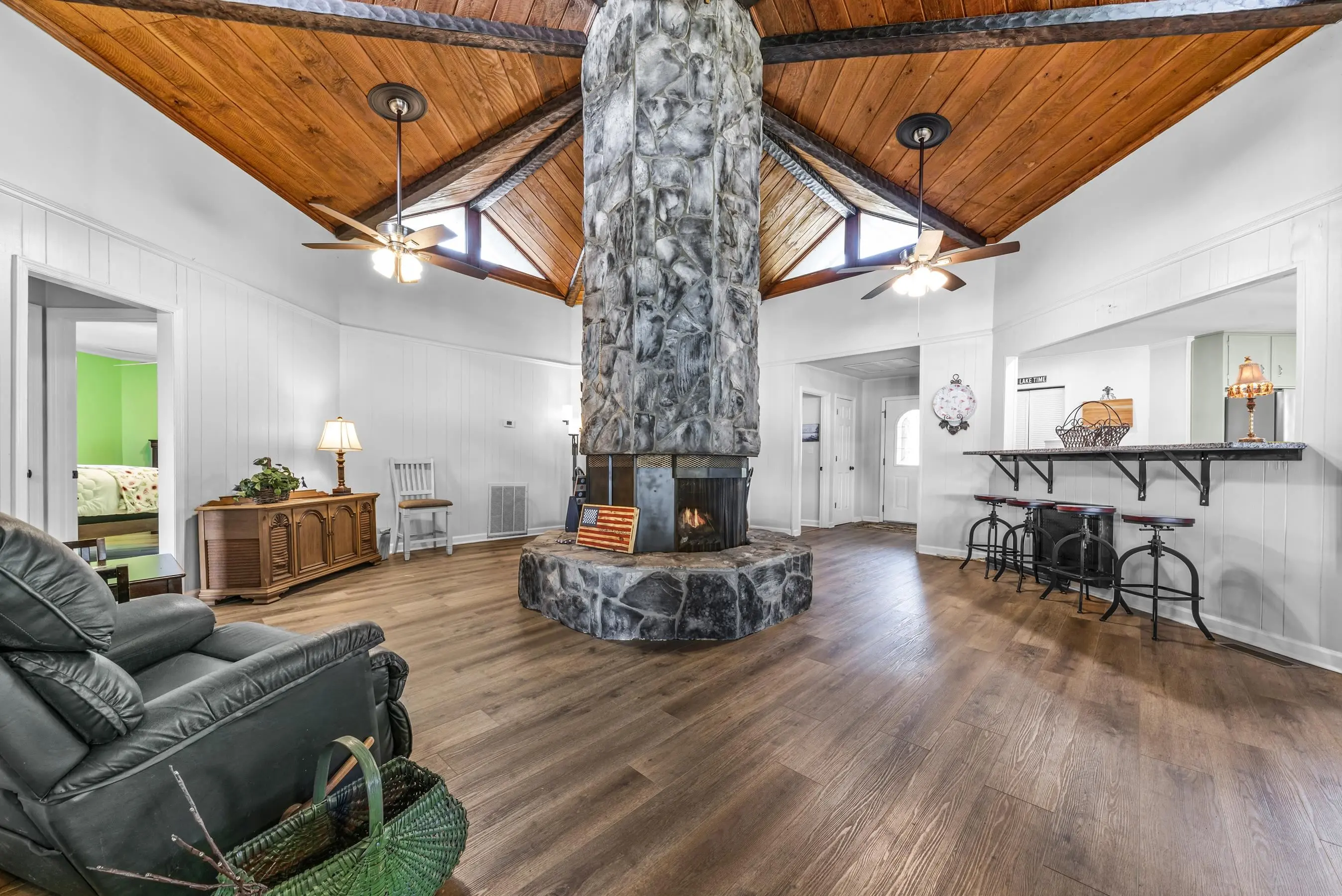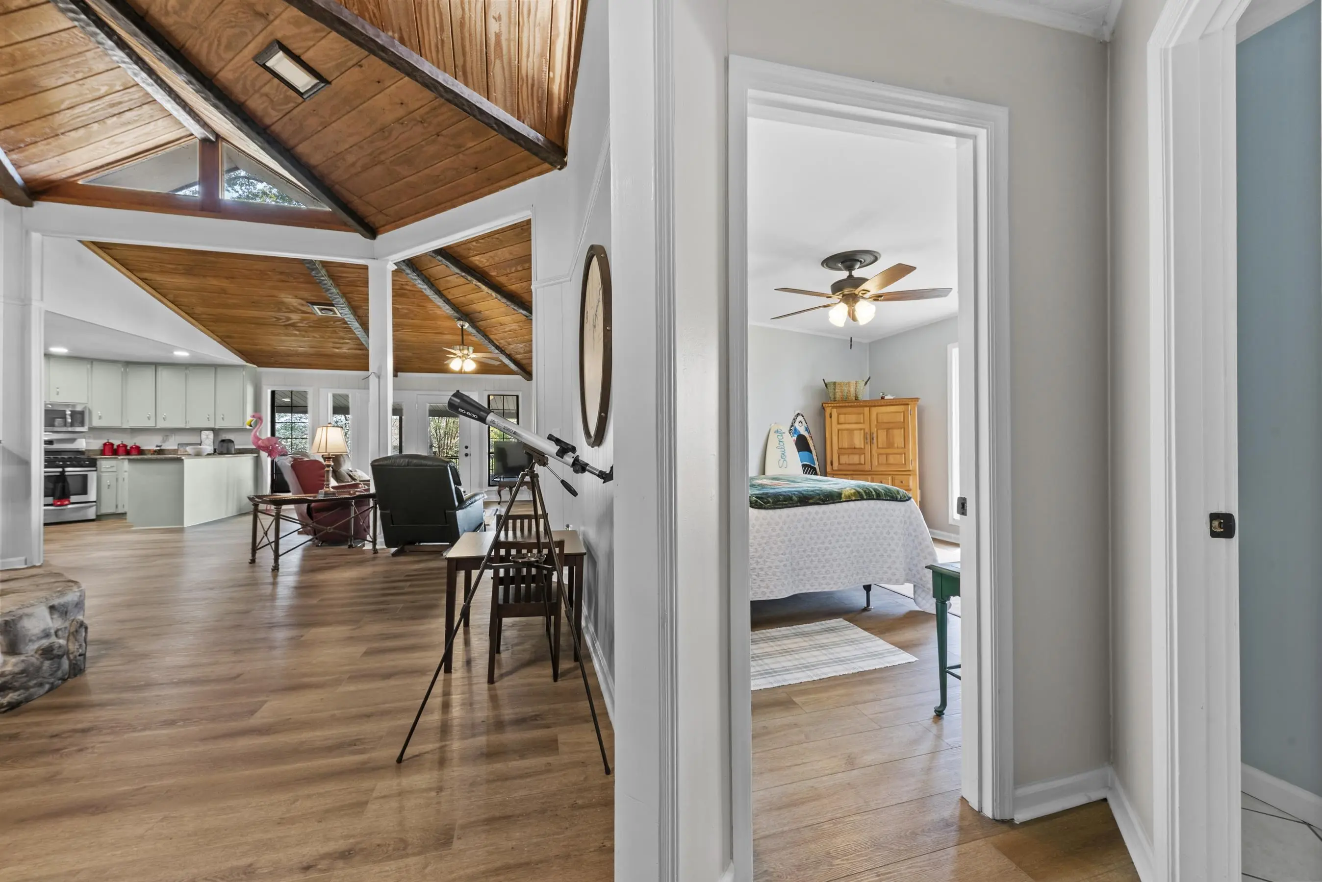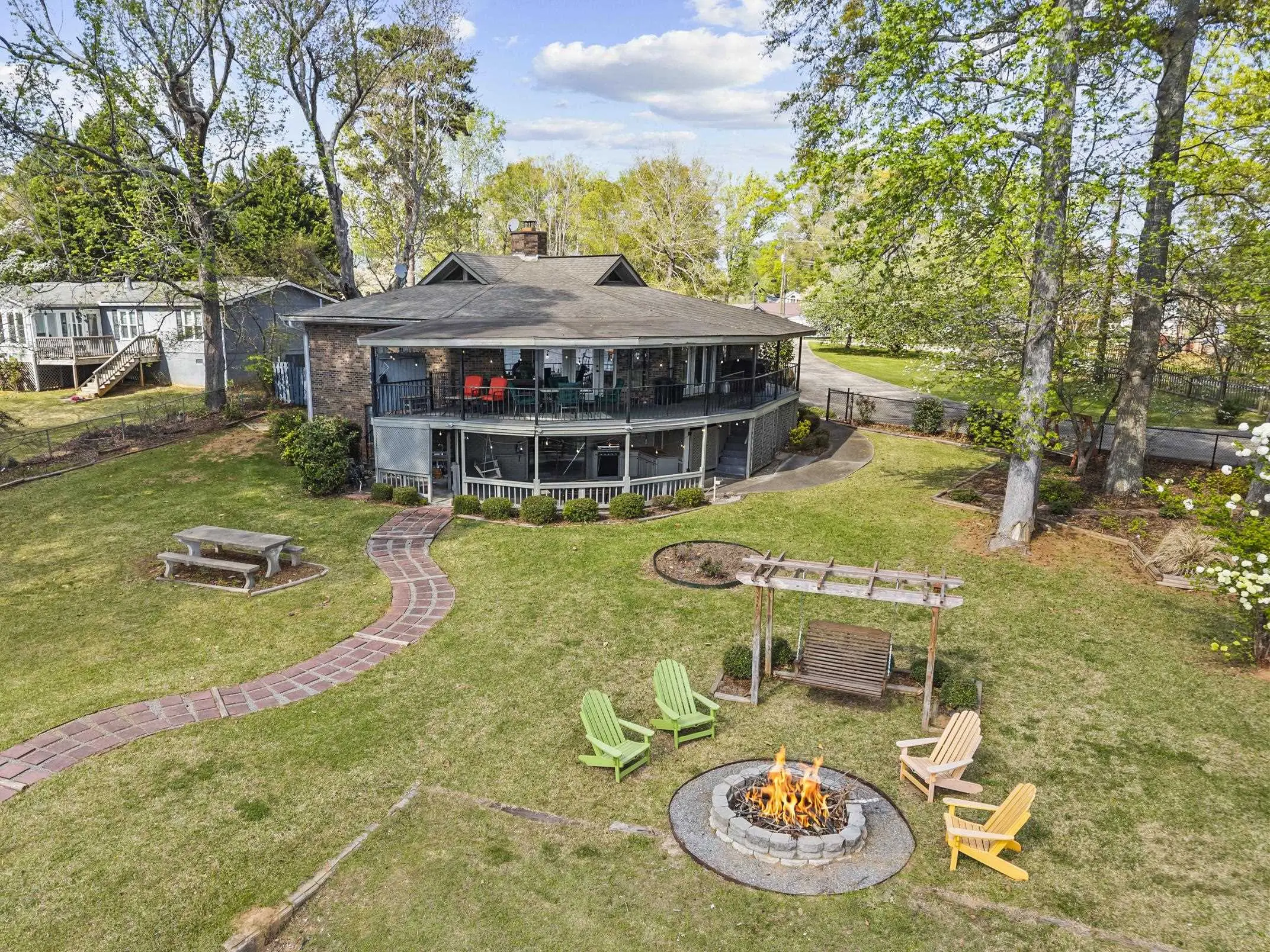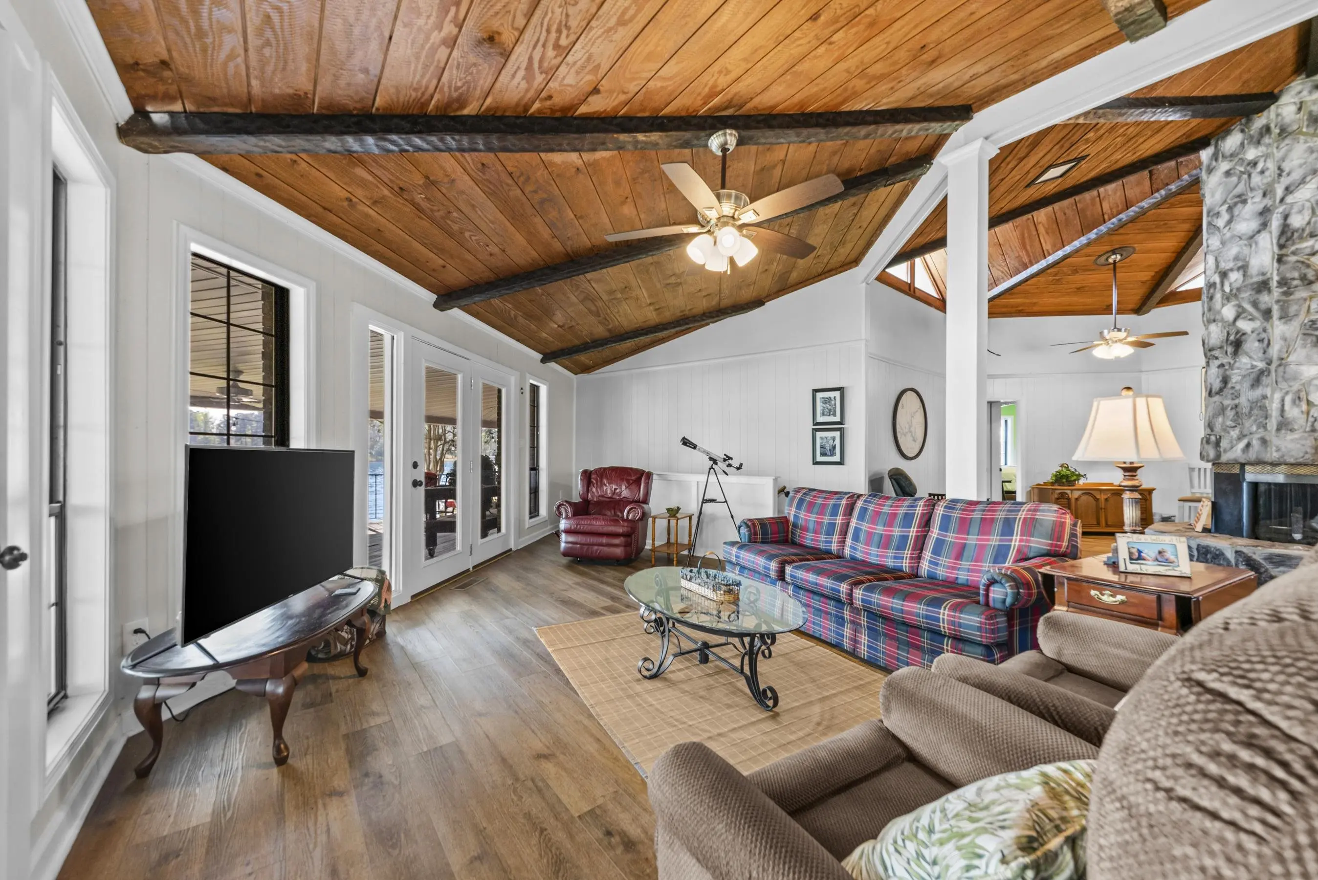 Fabulous Lake Sinclair offering with BEST LOCATION and BIG VIEWS! One of a kind OCTAGONAL HOME on one of the MOST SOUGHT AFTER STREETS on Lake Sinclair! 3 bedrooms, 3 full baths on main level provide great functionality and FUN with extra flex spillover space on terrace level. Octagonal ceiling with rich architectural woodwork sets this home apart. Circular stacked stone gas fireplace is the centerpiece of the home emitting warmth and charm. Updated open kitchen with plenty of storage - pantry and laundry room on main. Wrap around porch with panoramic views from every angle. Perfect pie shaped lot with abundance of lake frontage. Natural sandy beach, fabulous double boathouse and boat ramp gives the ultimate lake shoreline experience. Outbuilding with electricity and a double detached garage that could be used for workshop, storage etc. Located in cul de sac of the best location possible by land and by water! Concrete low maintenance seawall - Wonderful expansive yard with established landscaping - Fee simple.